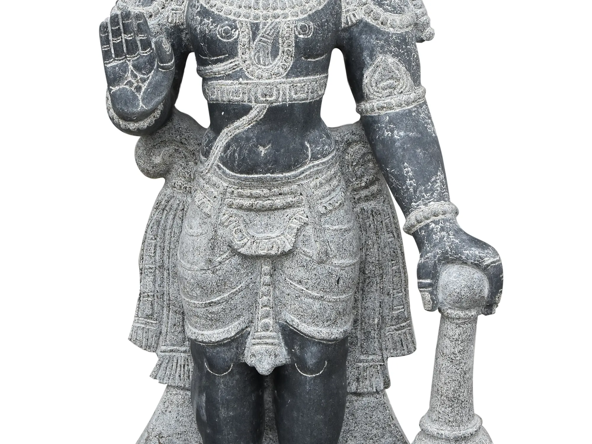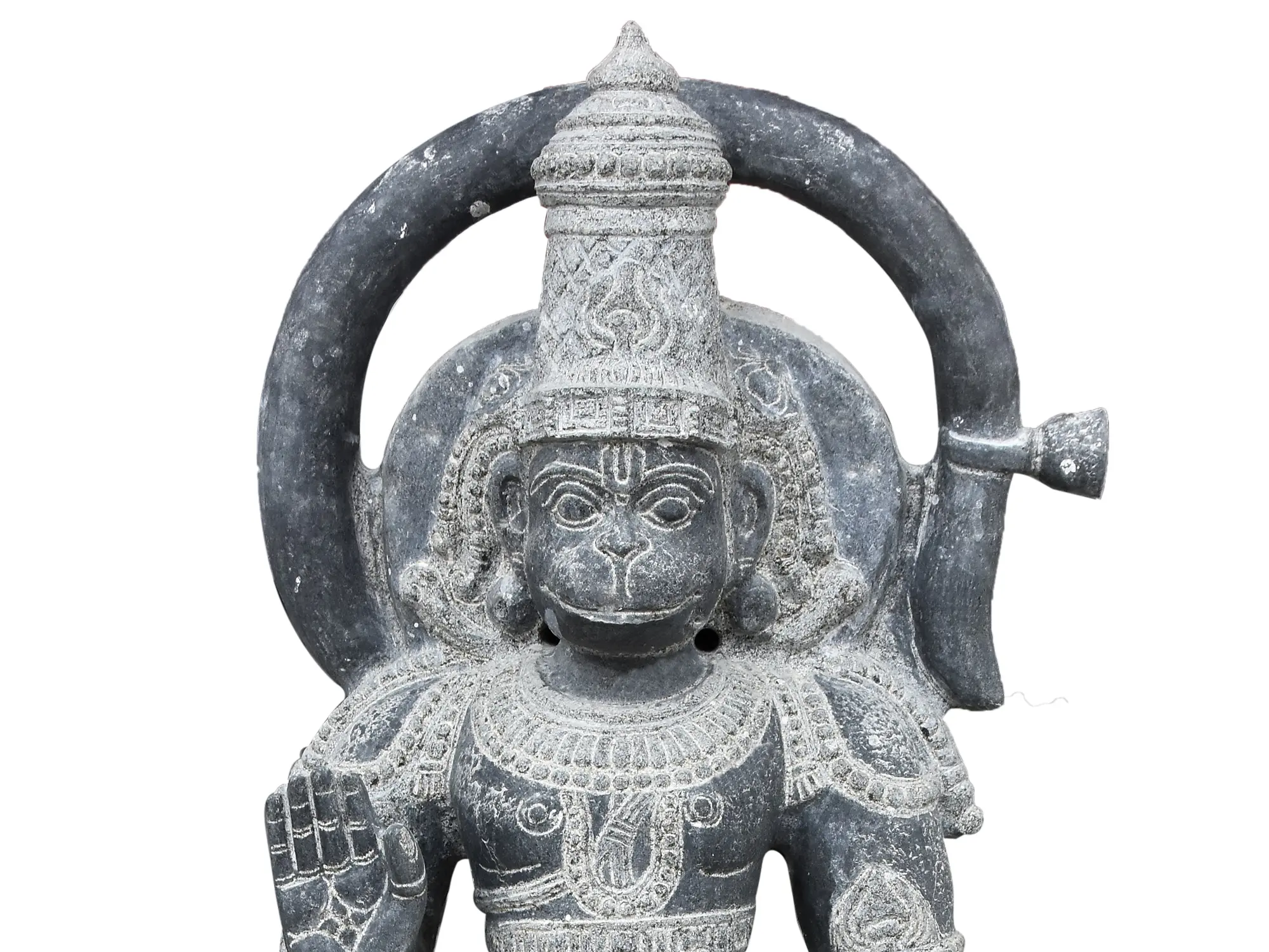 This granite statue shows Hanuman’s unwavering strength, devotion, and humility.