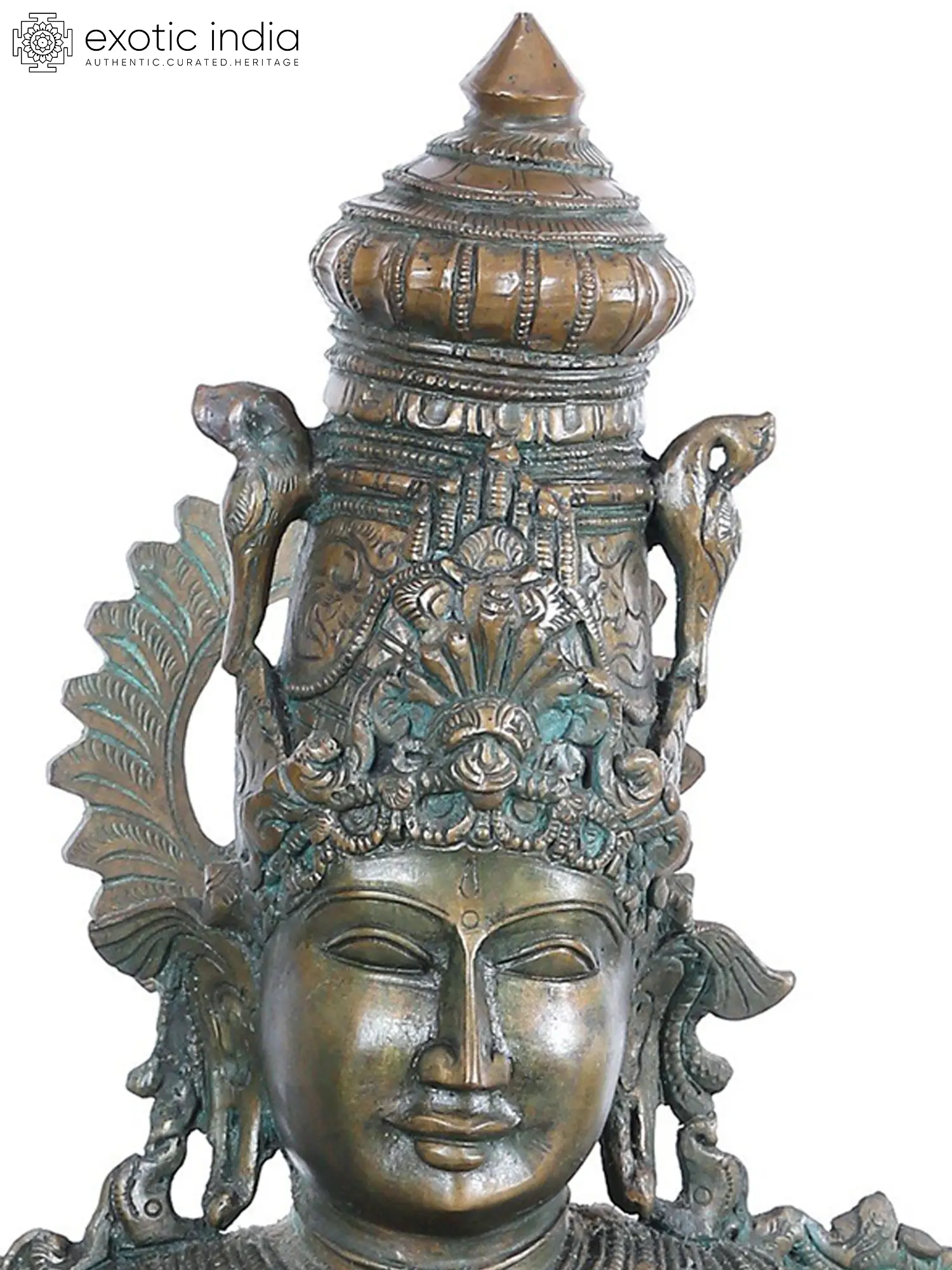 Devi Saraswati who is often called Veena Vadi embodies her flow as a sacred river in this marvelous idol of Panchaloha bronze. Seated in Lalitasna over a disc of blossoming padma plinth - she wears a high Karanda Mukuta accentuated by a peacock of rolled necks. Wearing Makara Kundalas in her ears, layers of precious chains are seen covering her neck and breasts. Holding a Japamala and resting the base of Veena on her thigh, Saraswati in this Chaturbhuja form plays the melodious ragas that enchant the heavens into divinity and bliss of art.