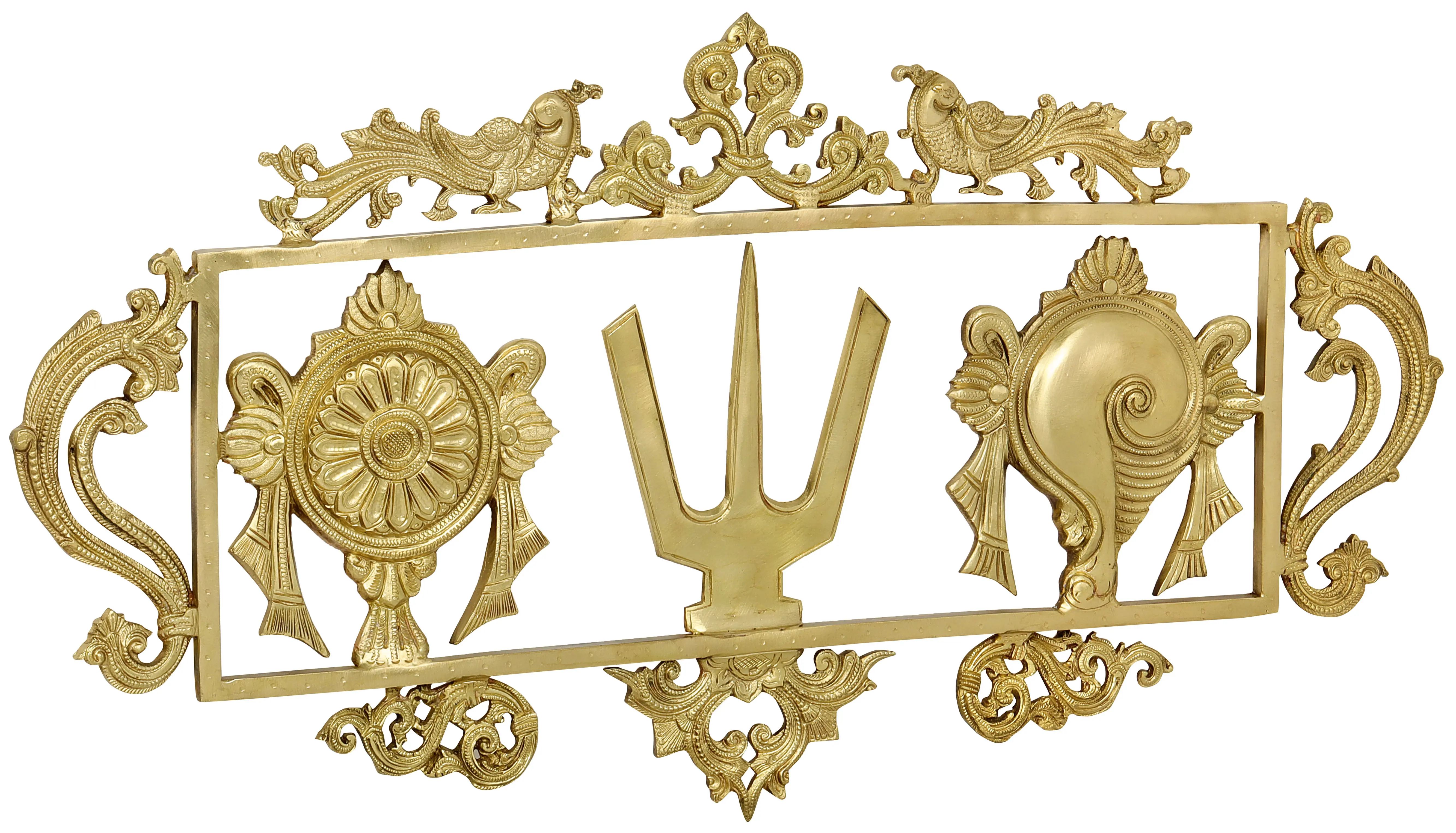 Elevate your decor with our Wall Hanging featuring Vaishnava Symbols of Sudarshan Chakra, Urdhvapundra and Panchajanya in an Embellished Peacock Frame, crafted in the distinctive Hoysala Art style. This handmade piece combines intricate detailing with the symbolism of Vaishnavism, housed within an ornate peacock frame. The cultural richness of Hoysala Artistry adds a unique touch to this visually captivating ensemble. Hang this Wall Hanging in a central location to infuse your space with the spiritual energy associated with Vaishnavism. The artistic legacy of Hoysala craftsmanship becomes a visual narrative, connecting you to the sacred traditions of South India.