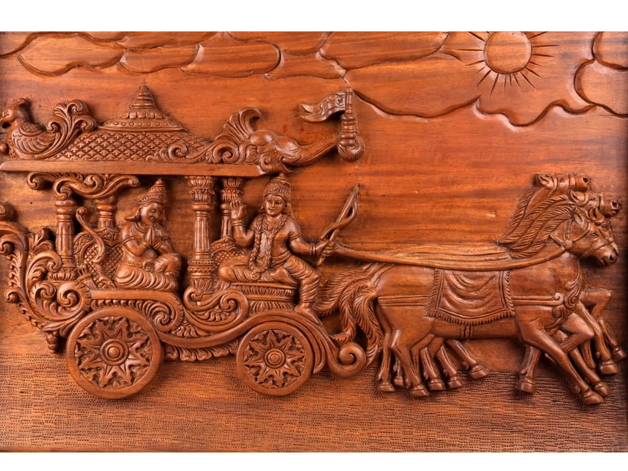 This large, commanding wall panel is more than just a decorative piece; it is a conversation starter, a focal point, and a spiritual anchor. The rich texture and natural variations of the teakwood ensure that each panel is unique, possessing its own character and charm. The detailed carving, from the subtle folds of the garments to the powerful musculature of the horses, showcases the artist's dedication and mastery. Whether displayed in a living room, study, or meditation space, this panel will infuse your environment with a sense of timeless wisdom, artistic elegance, and profound spiritual resonance. It is a beautiful way to connect with ancient traditions and bring the blessings of the Gita into your home.