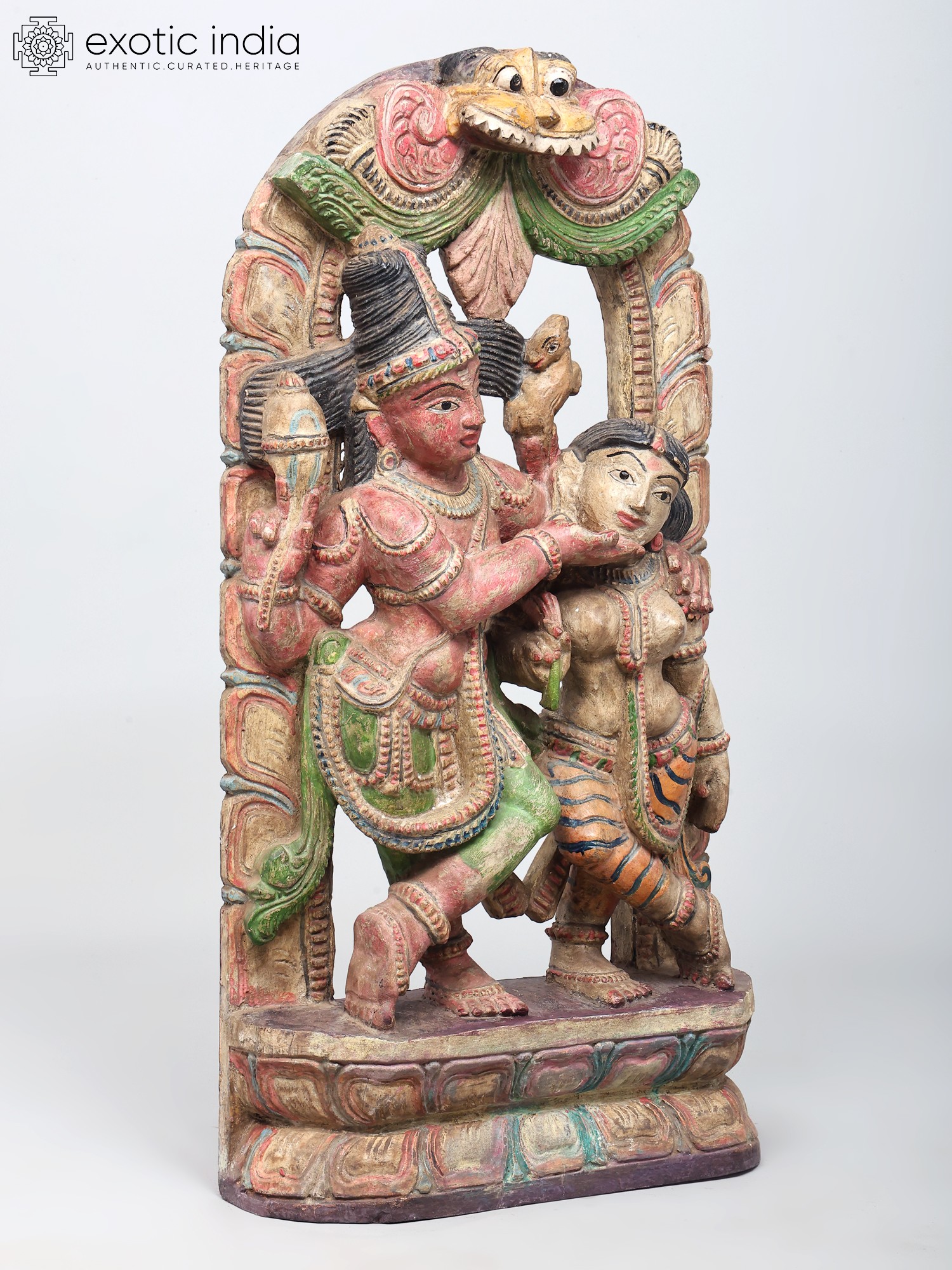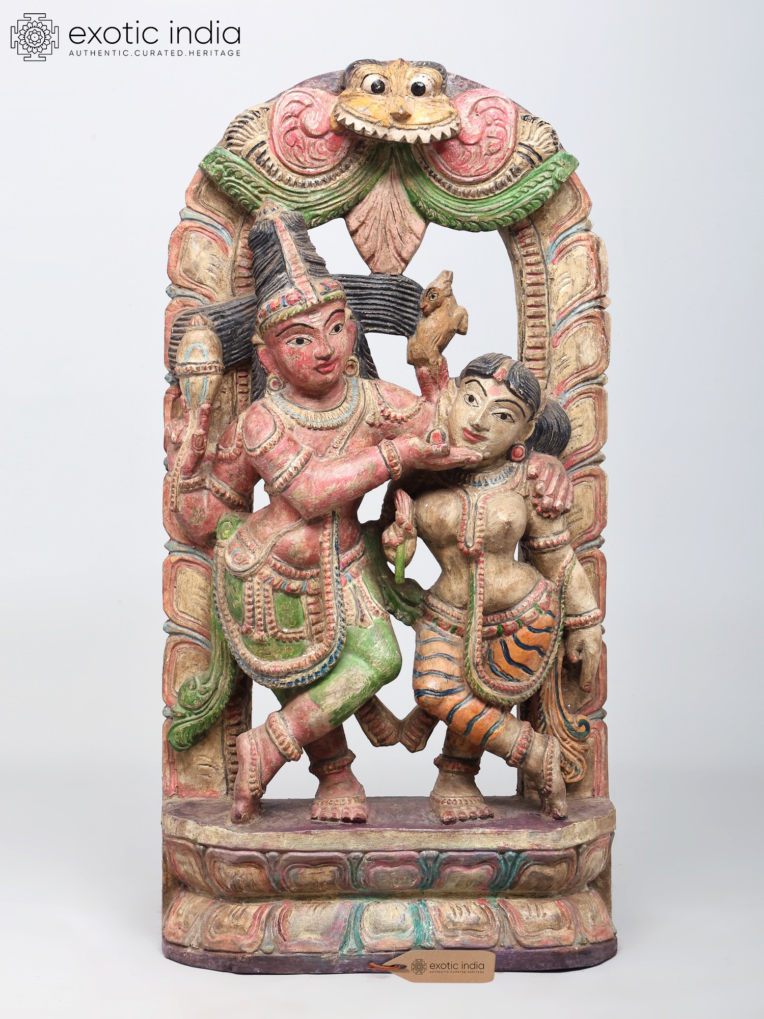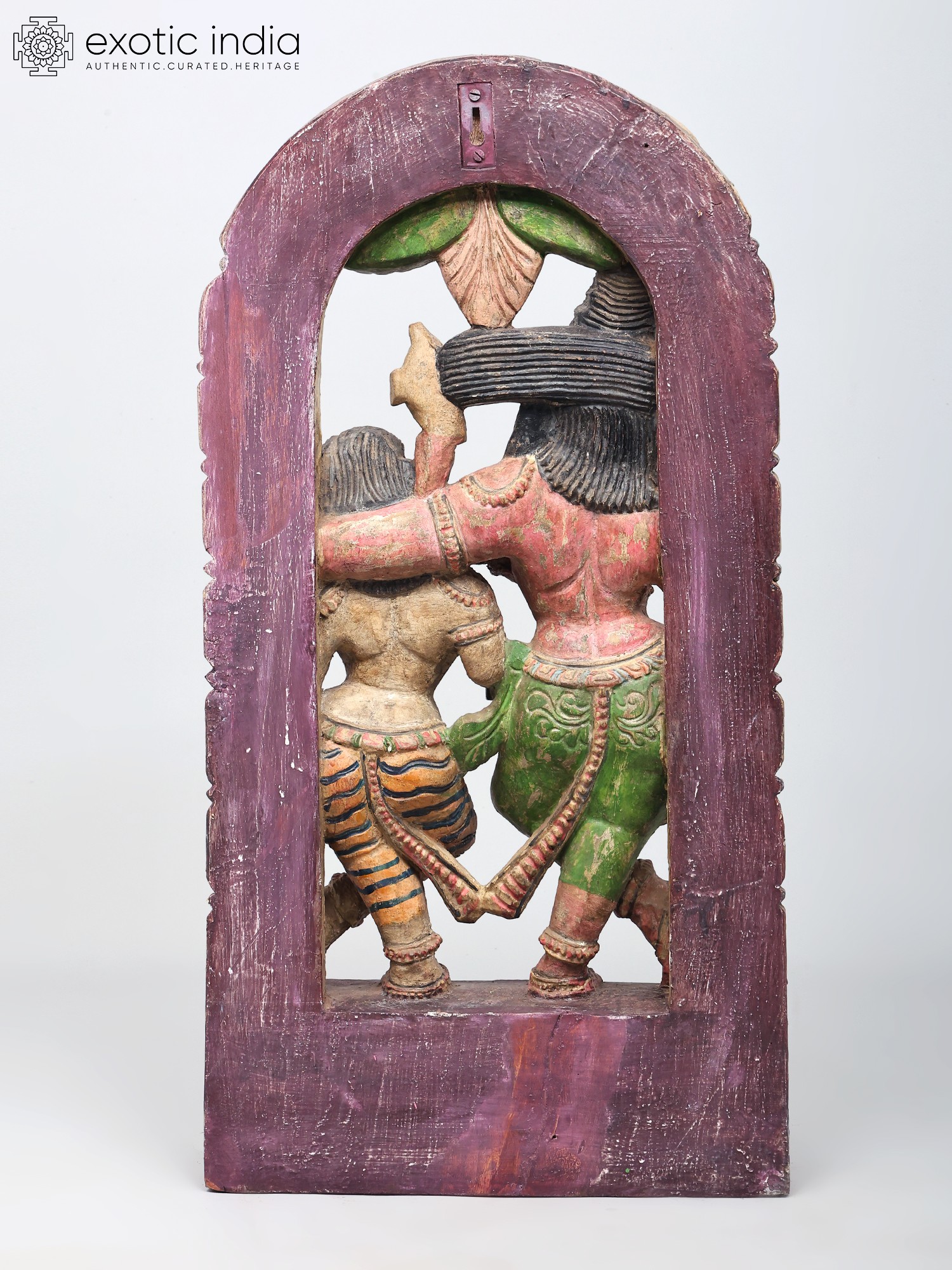 28" Wooden Lord Shiva Dancing with Goddess Parvati with Kirtimukha (Ananda Tandava)