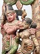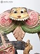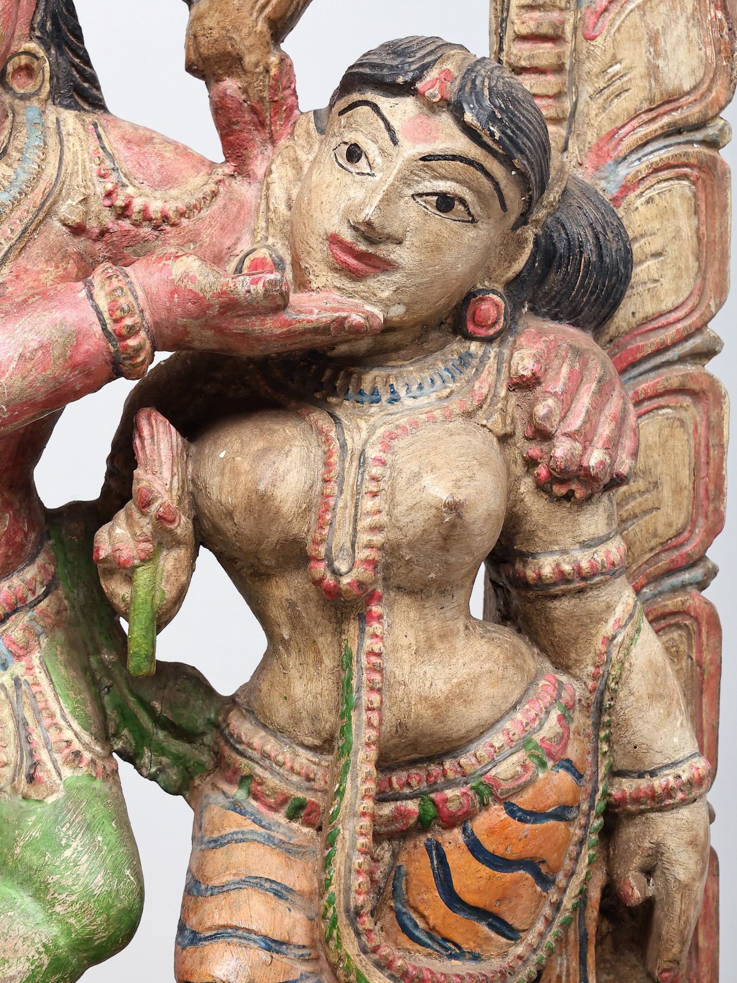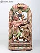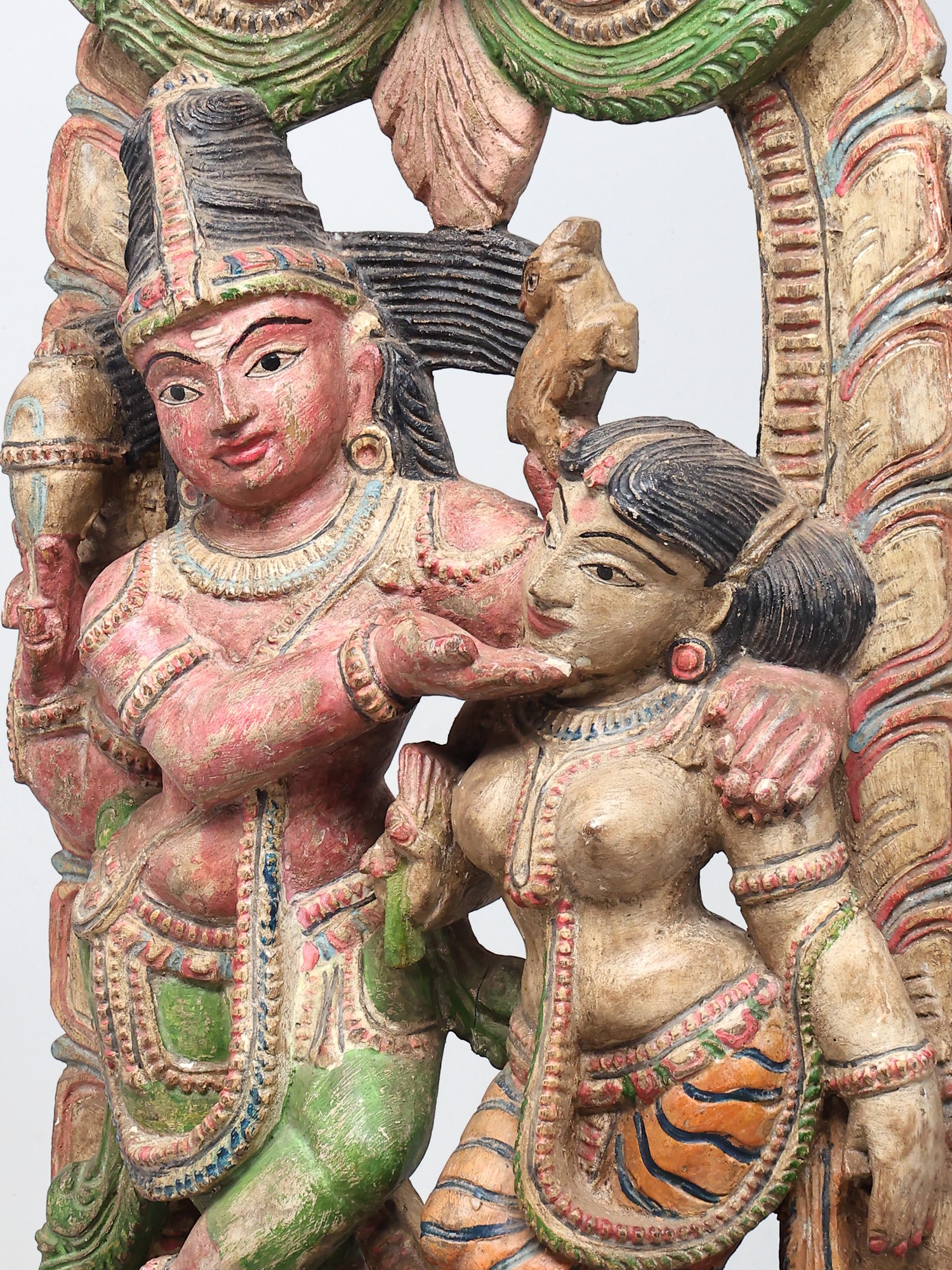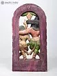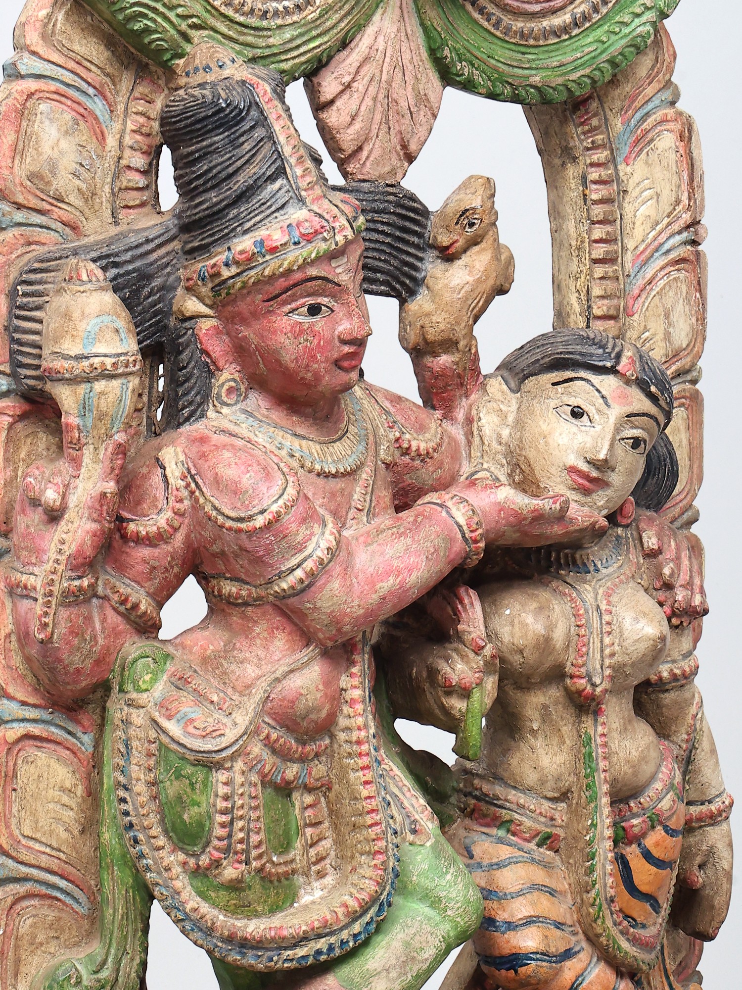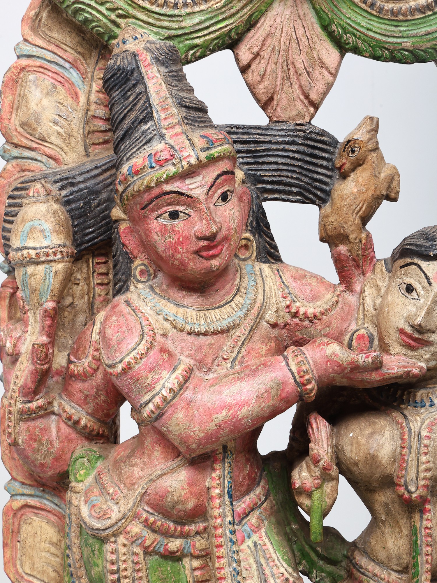 This exquisite wooden carving depicts Lord Shiva and Goddess Parvati engaged in the Ananda Tandava, the dance of bliss and creation. Lord Shiva, the divine dancer, is shown in a dynamic pose, his powerful movements orchestrating the cycles of the universe. Beside him, Goddess Parvati, his divine consort, mirrors his energy, their union symbolizing the harmonious interplay of masculine and feminine energies that sustain existence. The Kirtimukha, a fierce, leonine face that crowns the archway, represents time and destruction, a reminder that creation and dissolution are inseparable aspects of the cosmic order. In Hindu mythology, the Kirtimukha is often depicted as devouring itself, symbolizing the cyclical nature of existence and the ultimate transcendence of all forms. The carving is a testament to the rich artistic heritage of South India, where wood sculpture has been a revered tradition for centuries. Skilled artisans, drawing inspiration from ancient scriptures and oral traditions, have brought these divine figures to life with intricate detail and vibrant colors. The flowing garments, the adornments, and the very posture of the deities speak volumes about their divine nature and the profound stories they embody. Lord Shiva, with his ajna chakra awakened and cosmic energy flowing through him, is the embodiment of pure consciousness, while Parvati represents the primordial energy (Shakti) that brings the universe into being. Their dance is not merely a spectacle but a profound expression of the cosmic rhythm, the pulse of the universe.