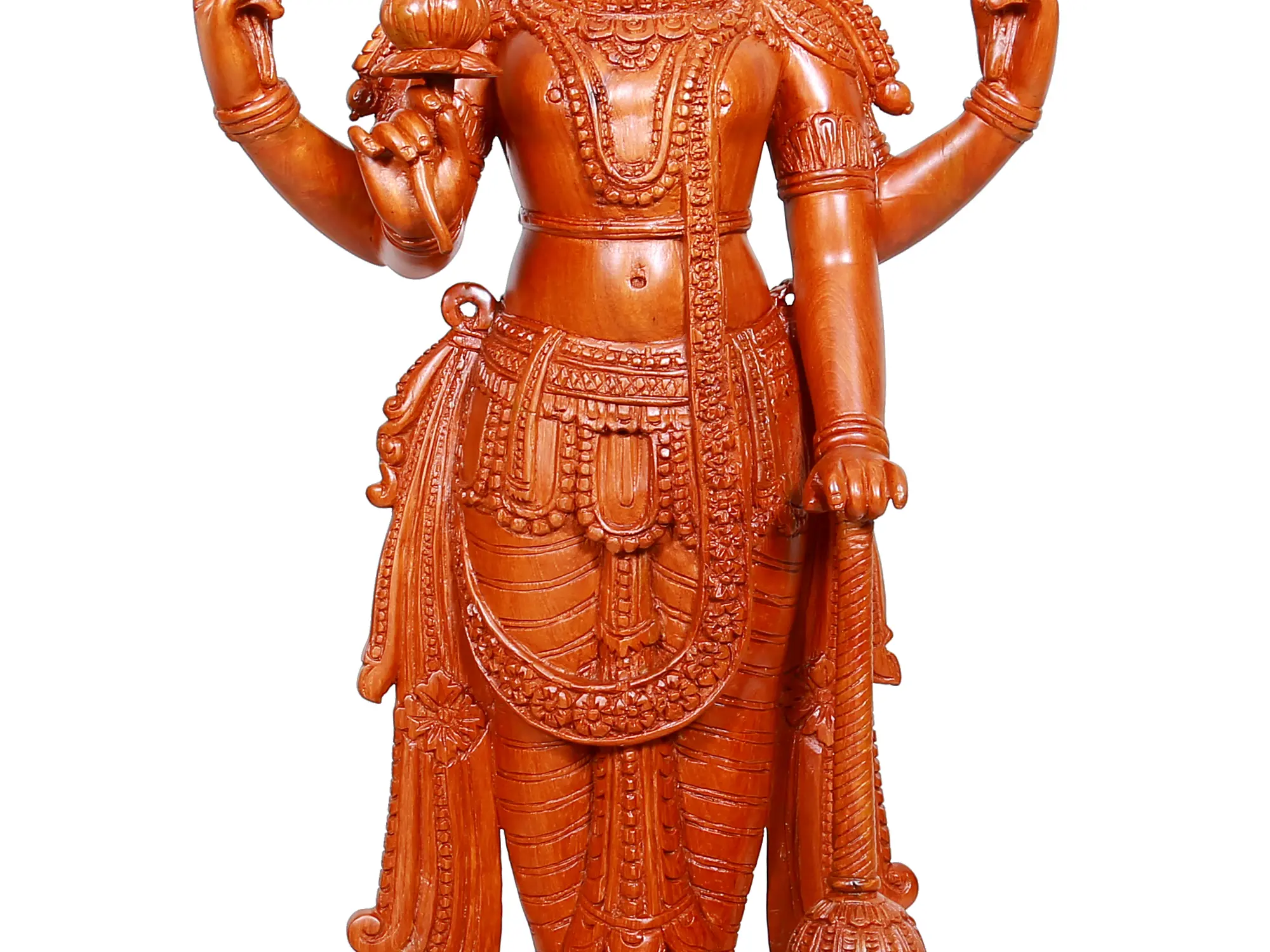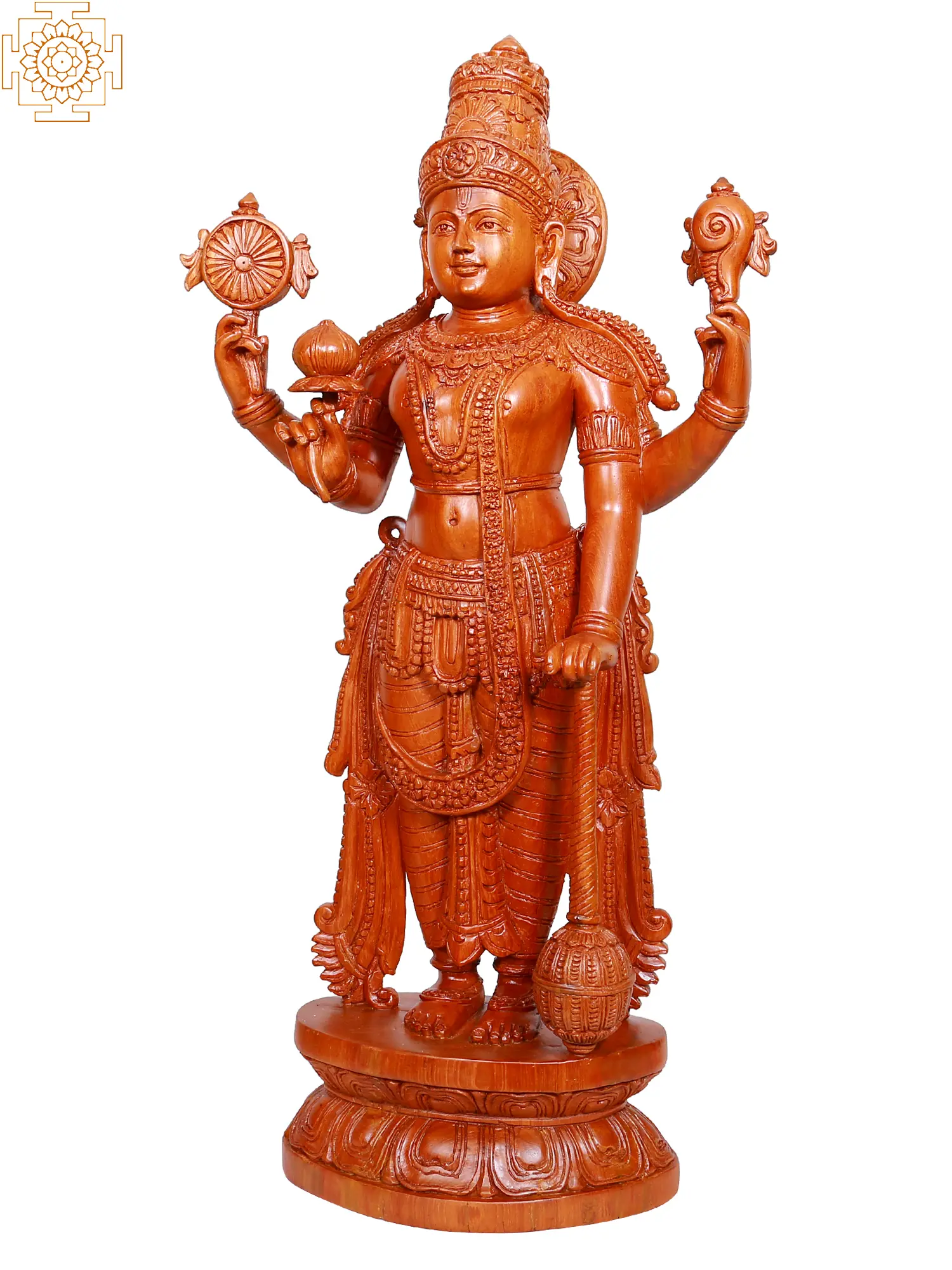 This exquisite teakwood carving embodies the divine essence of Lord Vishnu, the preserver and protector of the universe in Hindu cosmology. Standing at 28 inches, this masterfully sculpted representation captures the serene yet formidable presence of the deity, radiating an aura of peace and cosmic order. The intricate details, from the elaborate headdress to the ornate garments, showcase the artisan's dedication and skill, bringing to life the timeless stories and profound symbolism associated with Vishnu. Teakwood, renowned for its durability and rich grain, lends a natural warmth and enduring beauty to this sacred artwork. The smooth, polished finish highlights the natural luster of the wood, inviting touch and contemplation. Each curve and contour is meticulously rendered, reflecting the divine symmetry and perfect form attributed to Vishnu. The statue stands poised on an intricately carved lotus base, a symbol of purity and spiritual awakening, further elevating the divine presence it represents. ––––––––––––––––––––