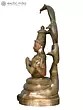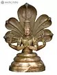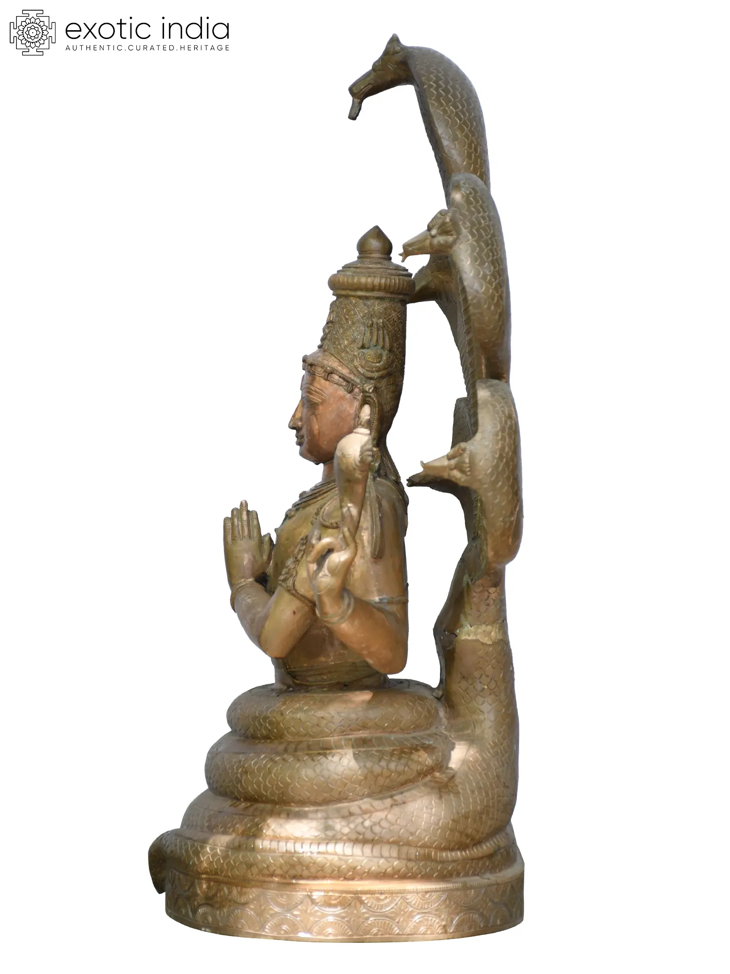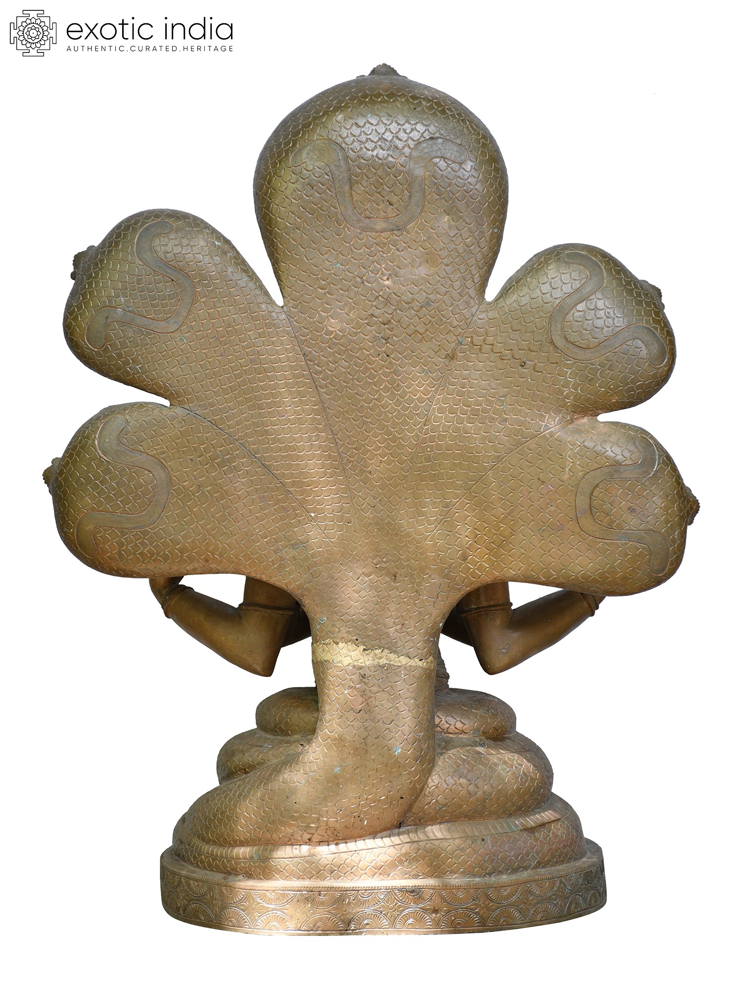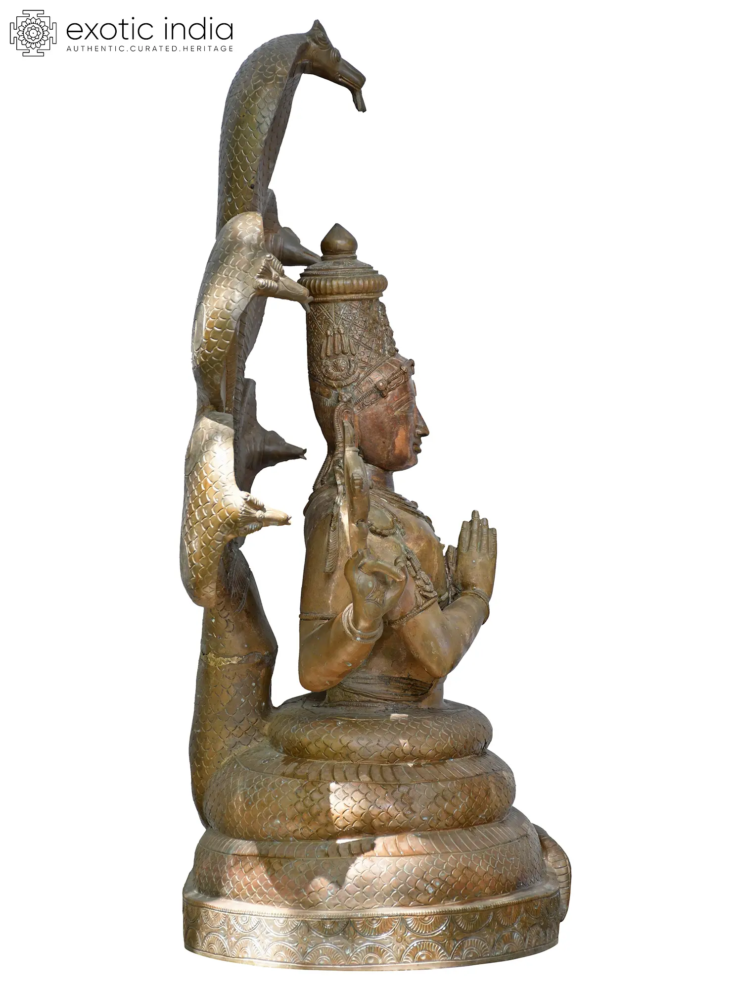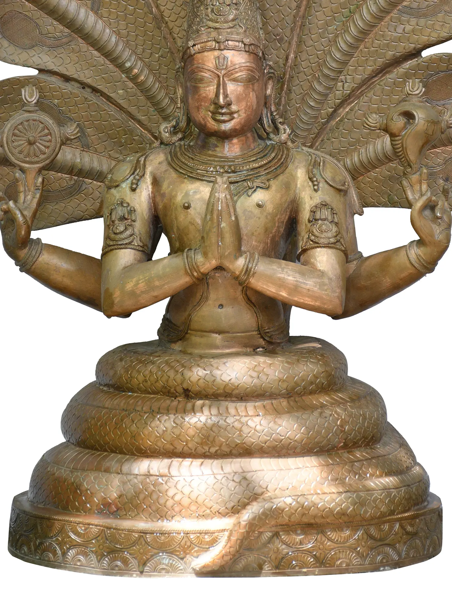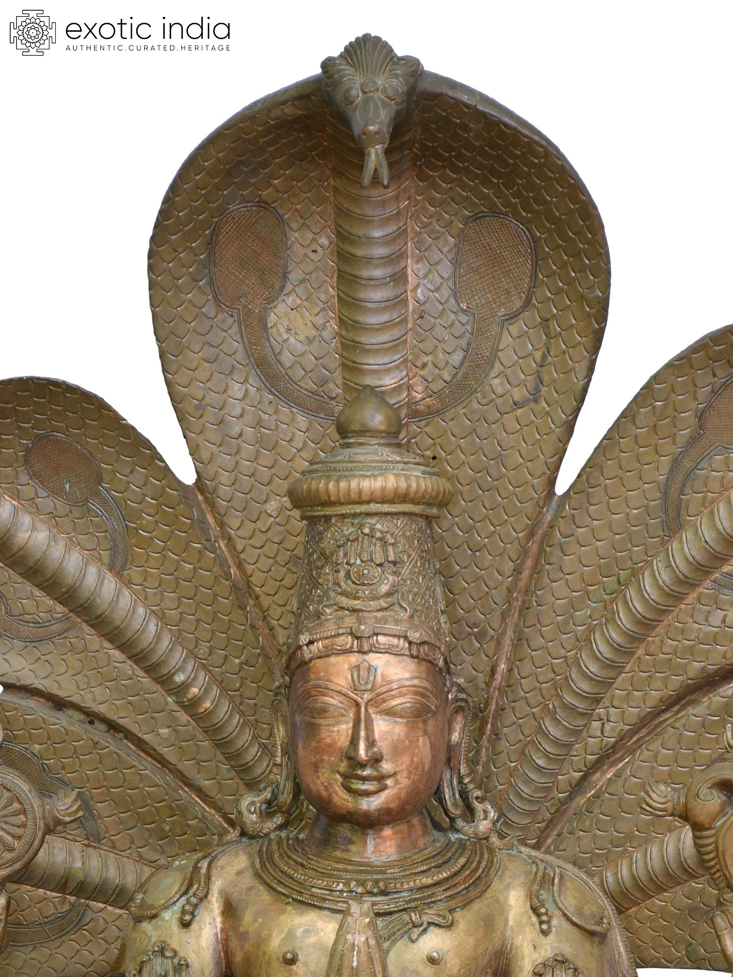 This magnificent solid copper statue embodies the profound symbolism of Adishesha, the primordial serpent king, and Maharshi Patanjali, the revered sage credited with systematizing the ancient science of Yoga. Adishesha is a central figure in Hindu mythology, often depicted as the couch upon which Lord Vishnu rests in the cosmic ocean. He is known for his thousand hoods, representing infinite consciousness, and his coils symbolize the cyclical nature of time and the universe. This statue masterfully captures this grandeur, with Adishesha forming the majestic seat, his scales intricately rendered to convey a sense of ancient power and serenity.
