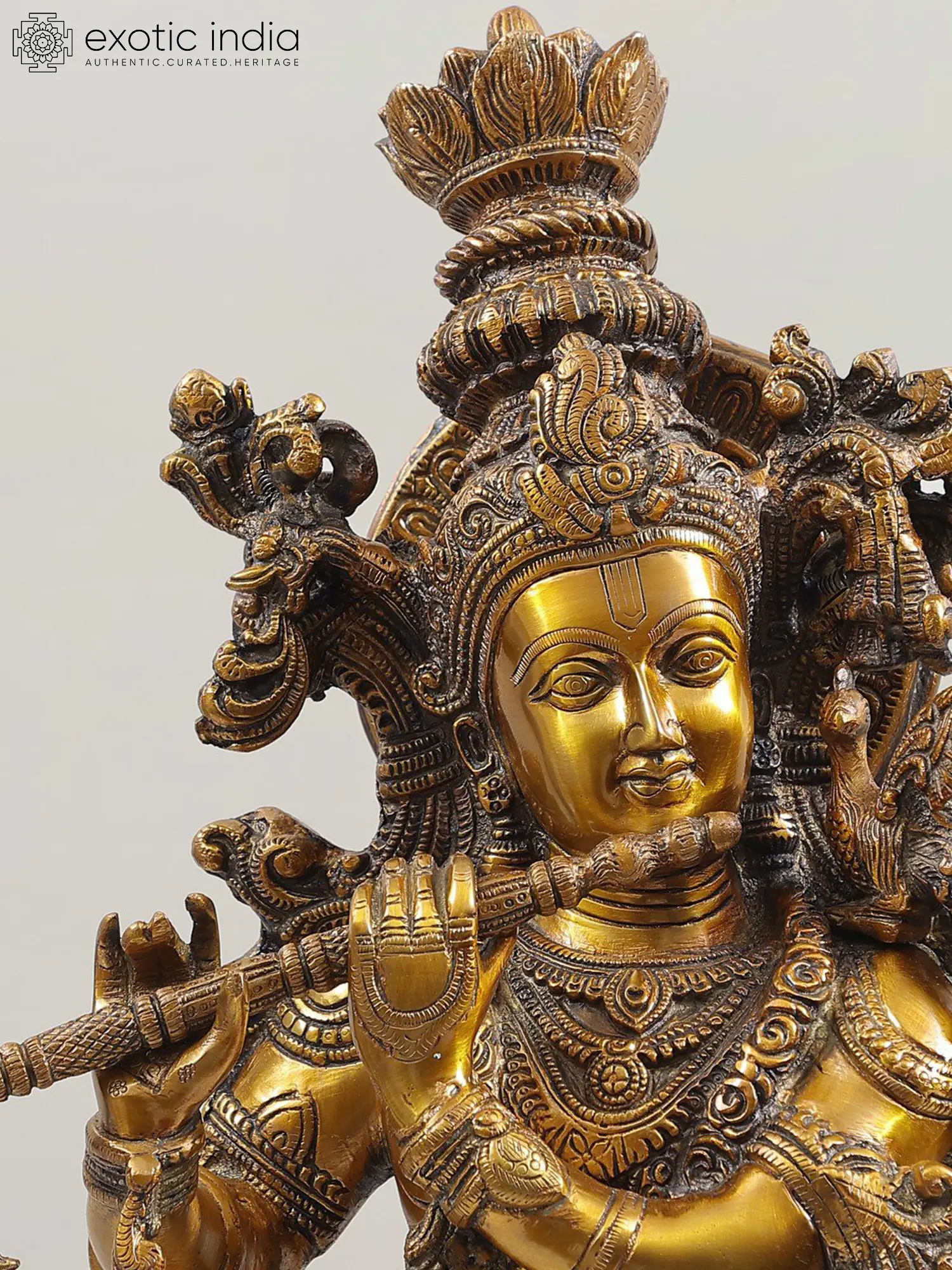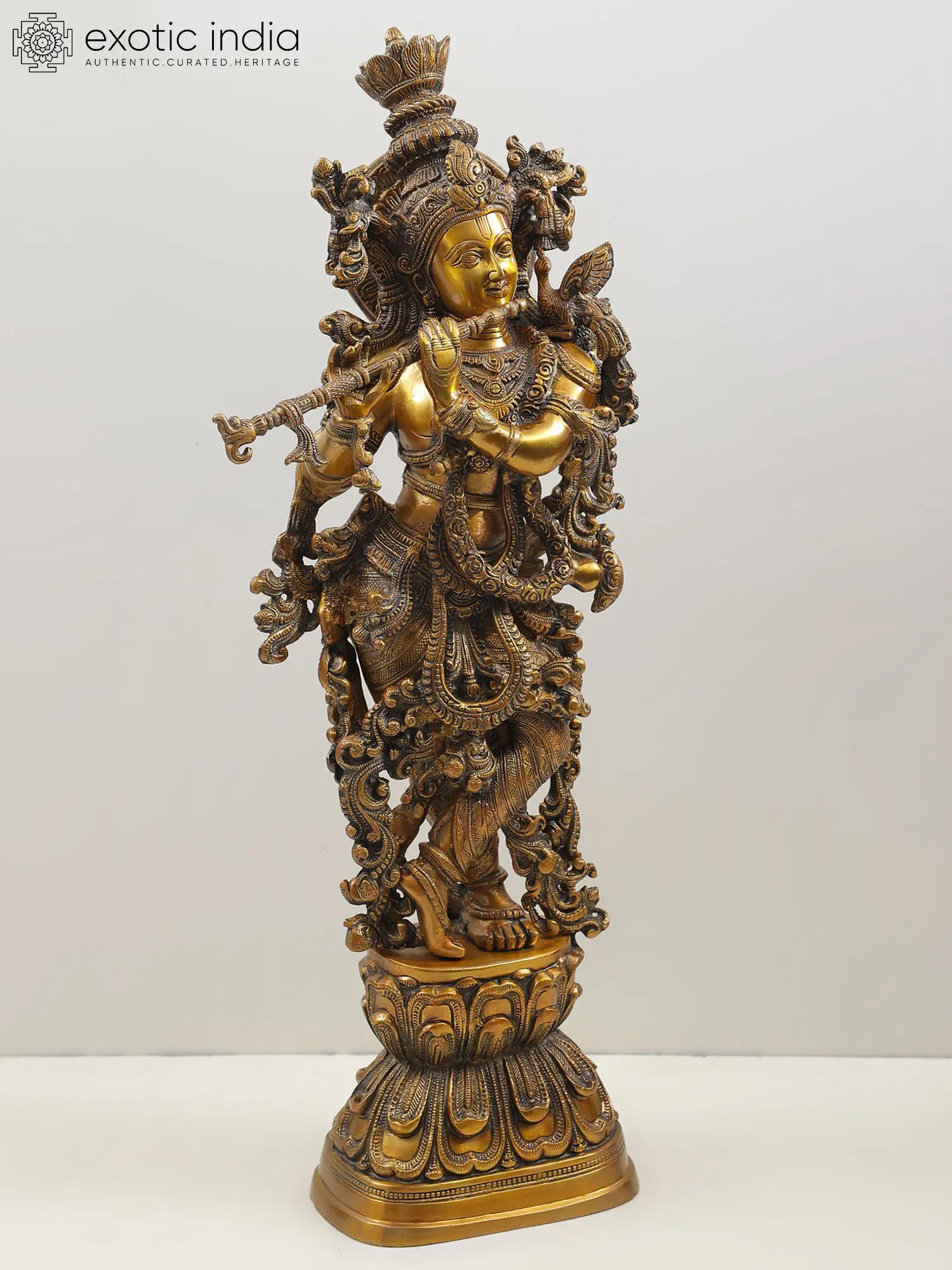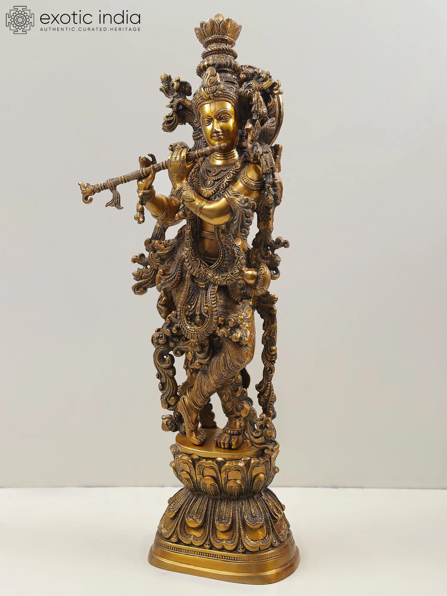The statue, with its usual brass hue, is positioned to provide the best possible view of the Lord, who is the light that dispels all darkness and hypnotizes his believers with his appearance. This one-of-a-kind statue is an extraordinary work of elegance, beauty, and love that breathes Lord Krishna's heavenly presence and generates an air of holiness.