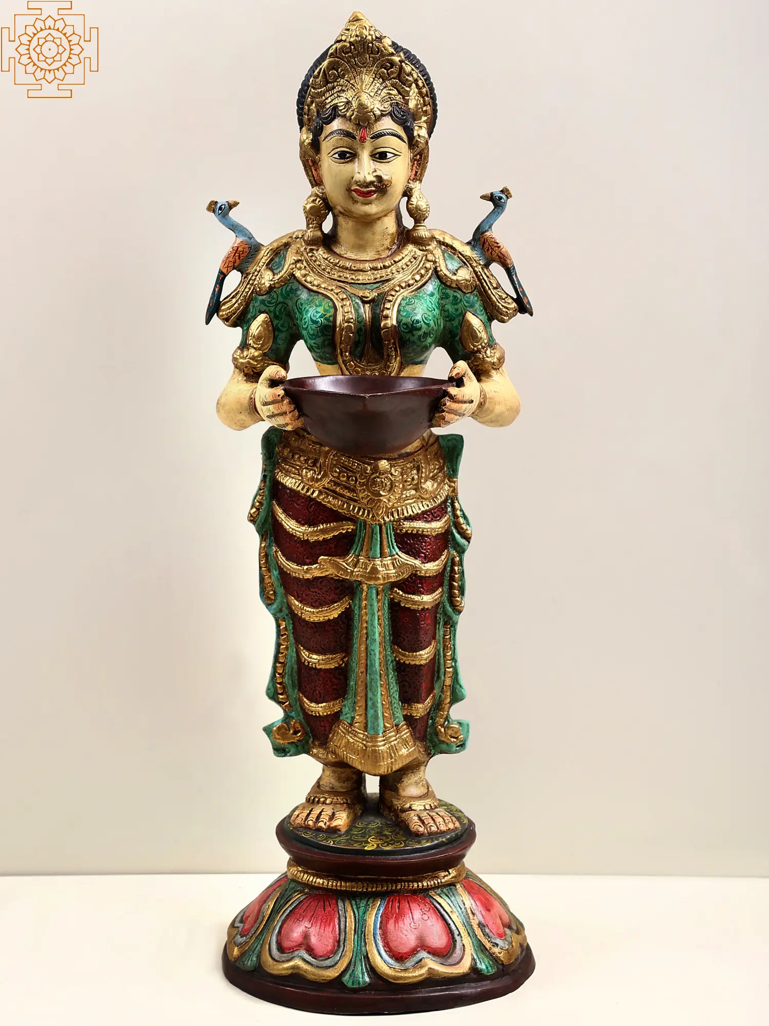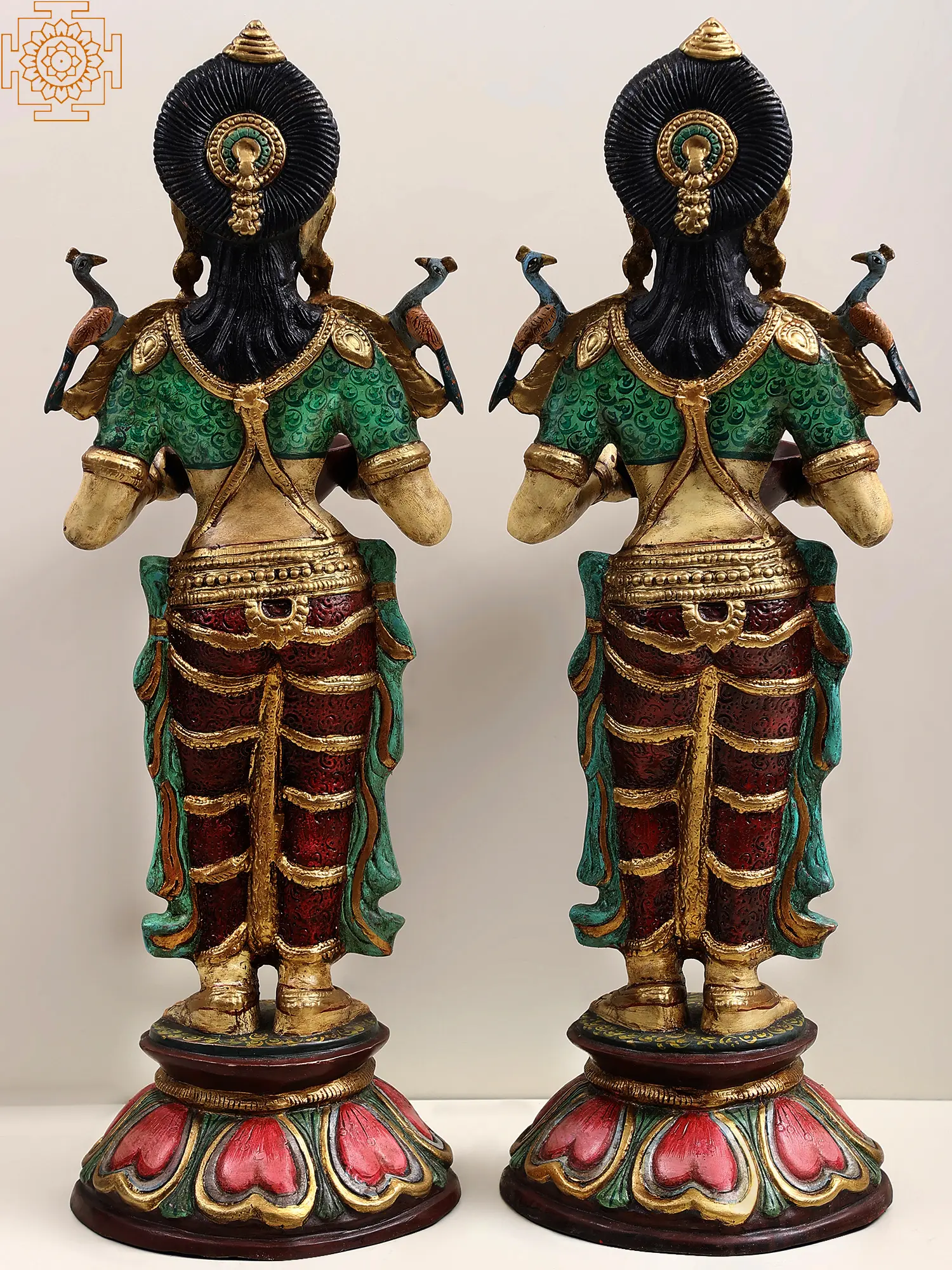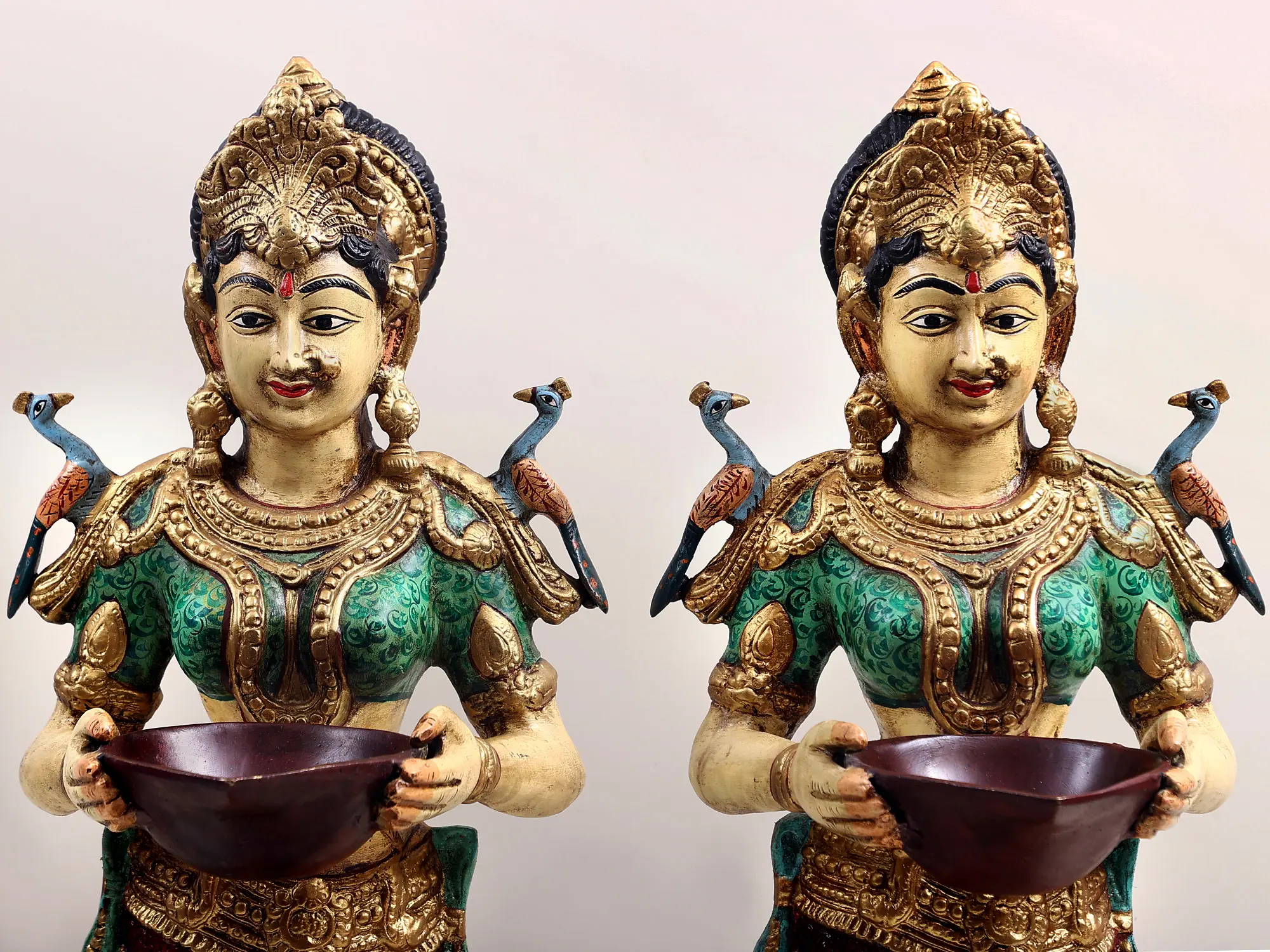 Invite an aura of divine grace and prosperity into your home with this magnificent pair of standing Deep Lakshmi figures. Crafted from durable brass, these exquisite statues stand at an imposing 29 inches tall, making them a captivating focal point in any sacred space or living area. Each figure embodies the benevolent goddess Lakshmi, the harbinger of wealth, fortune, and auspicious beginnings, as depicted in ancient Indian mythology and scripture. The artistry of these statues is truly remarkable. The serene faces are adorned with delicate paintwork, capturing a gentle smile and knowing gaze. Intricate golden ornamentation graces their attire, featuring vibrant green bodices with swirling patterns and richly textured maroon lower garments. The detail extends to the ornate crowns and jewelry, reflecting a deep understanding of traditional iconography. Perched gracefully on each shoulder is a beautifully rendered peacock, a vahana (mount) associated with Lakshmi and often symbolizing beauty, royalty, and immortality. The peacocks' vibrant hues and delicate posture add an extra layer of charm and symbolic depth to the figures.