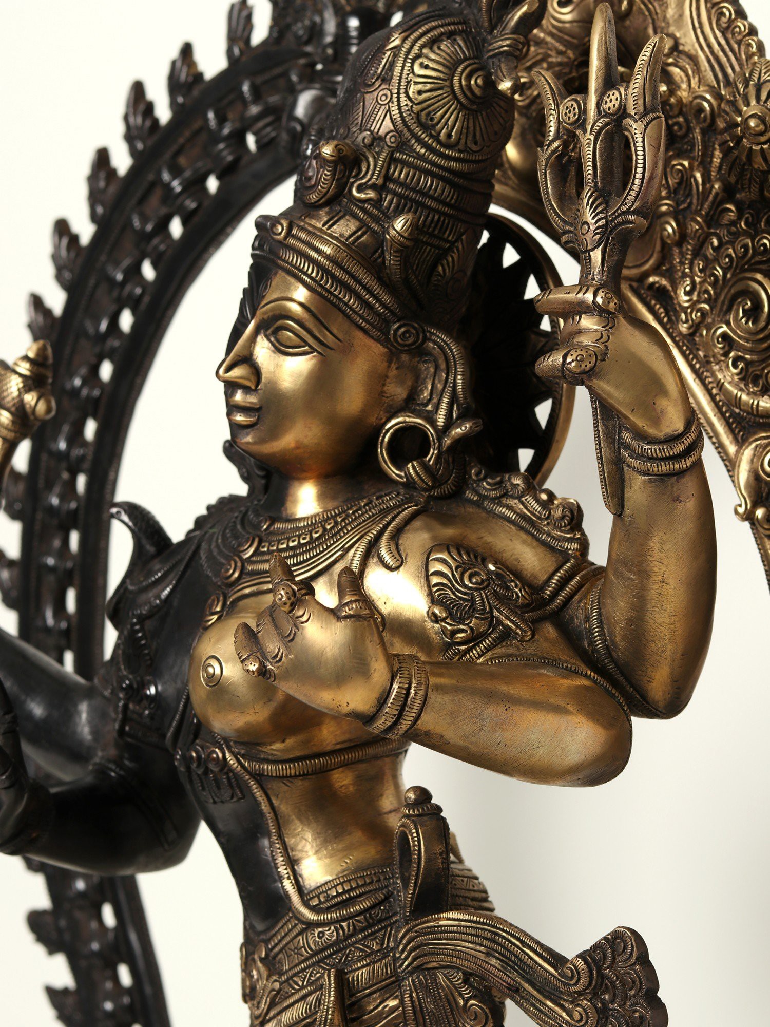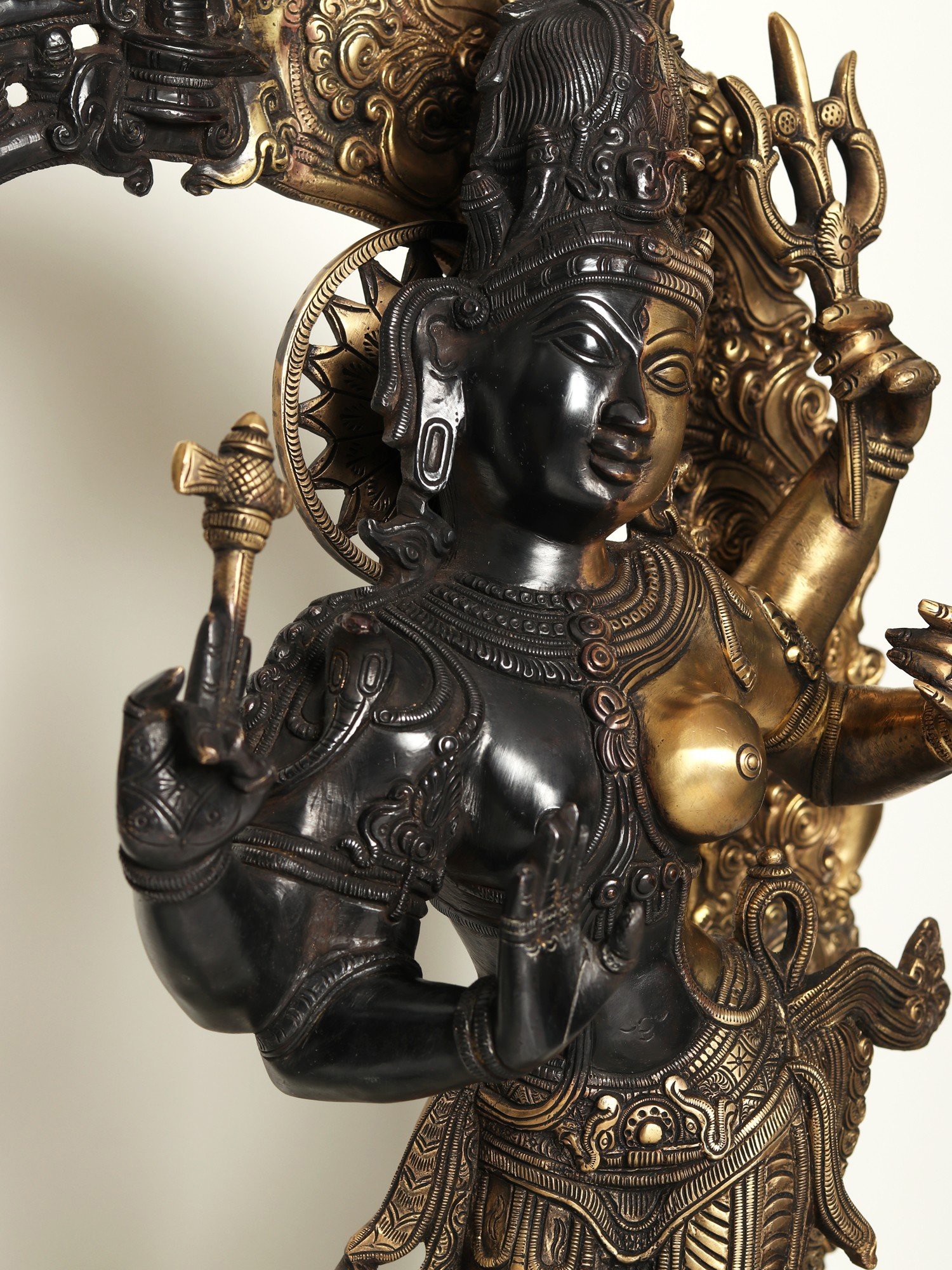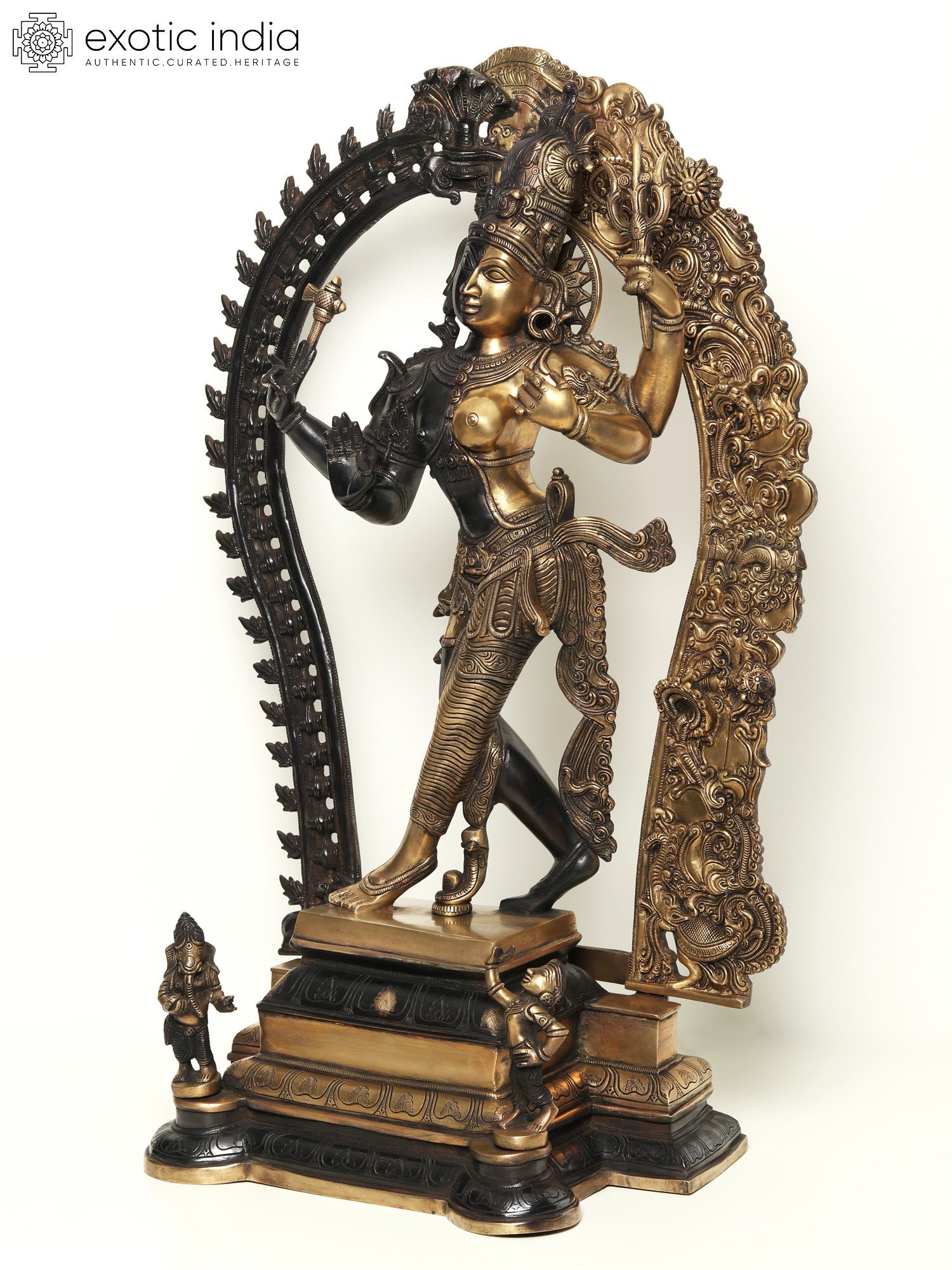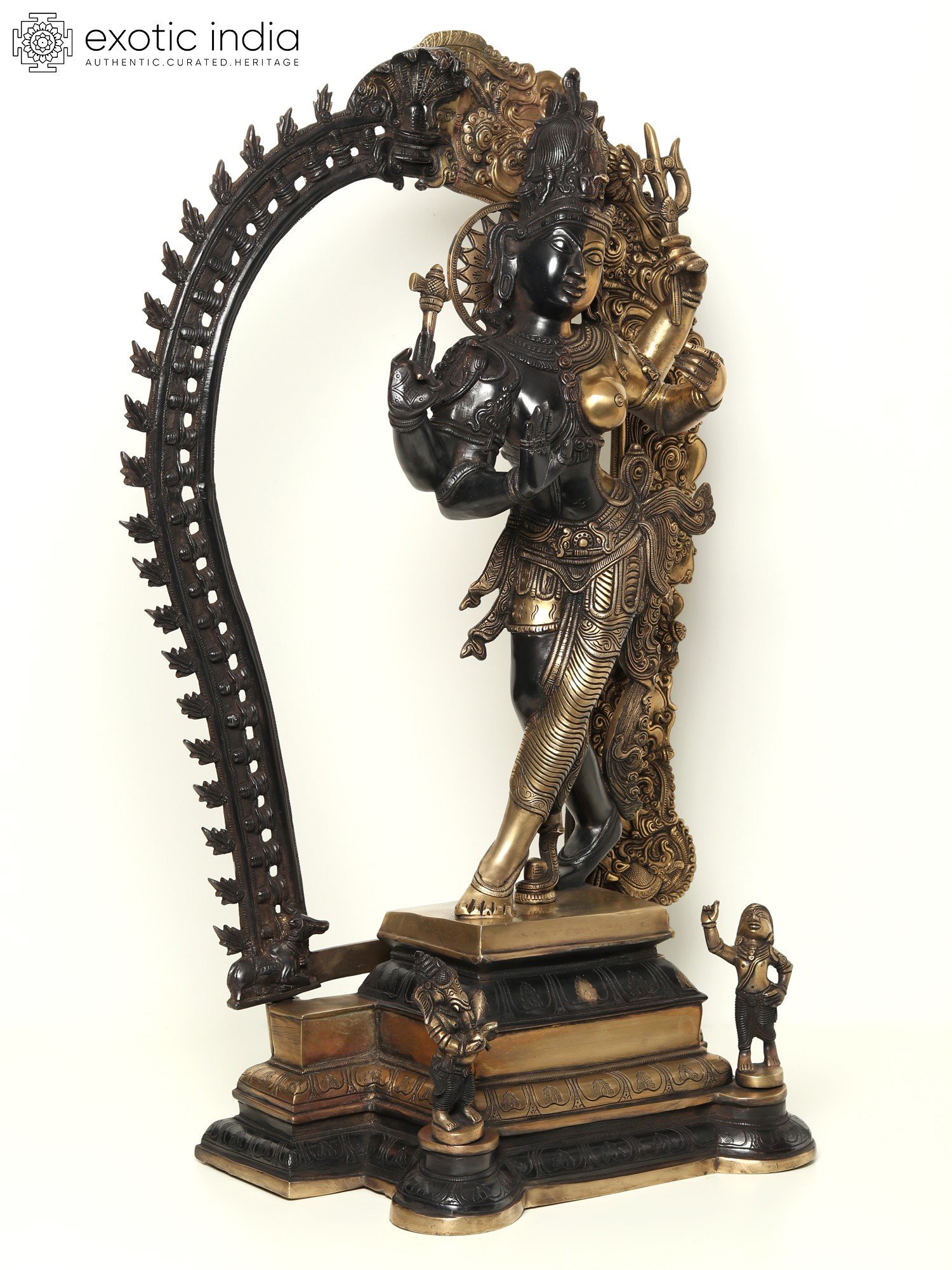 Ardhanarishwara- the union of Shiva and Shakti which inspired Brahma’s creation, and sustain it rivettingly dance in this brass statue, symbolizing the movement of Shiva and Shakti which runs the universe. Standing on a beautiful pedestal, Ardhanarishwara is accompanied by their sons- Ganesha and Karttikeya, who witness the heavenliness of their parents in bliss and awe. Shiva is marked by a mystical black color, adorned with Jatamukuta, serpent ornaments, tiger hide, holding an Ankusha, and the gesture of fearlessness. On his left, Uma emanates a golden aura, beautified by lovely ornaments and a delicate dhoti whose folds are delineated lyrically in the statue. Uma holds a trident, highlighting her powers as the supreme goddess Durga.