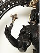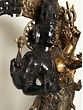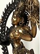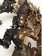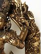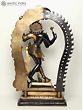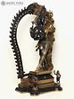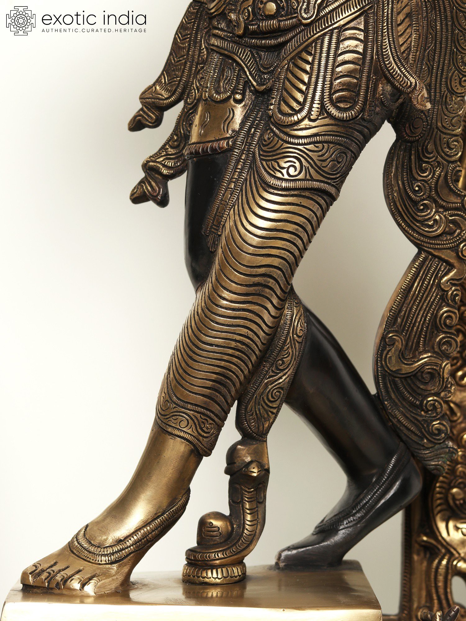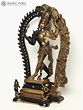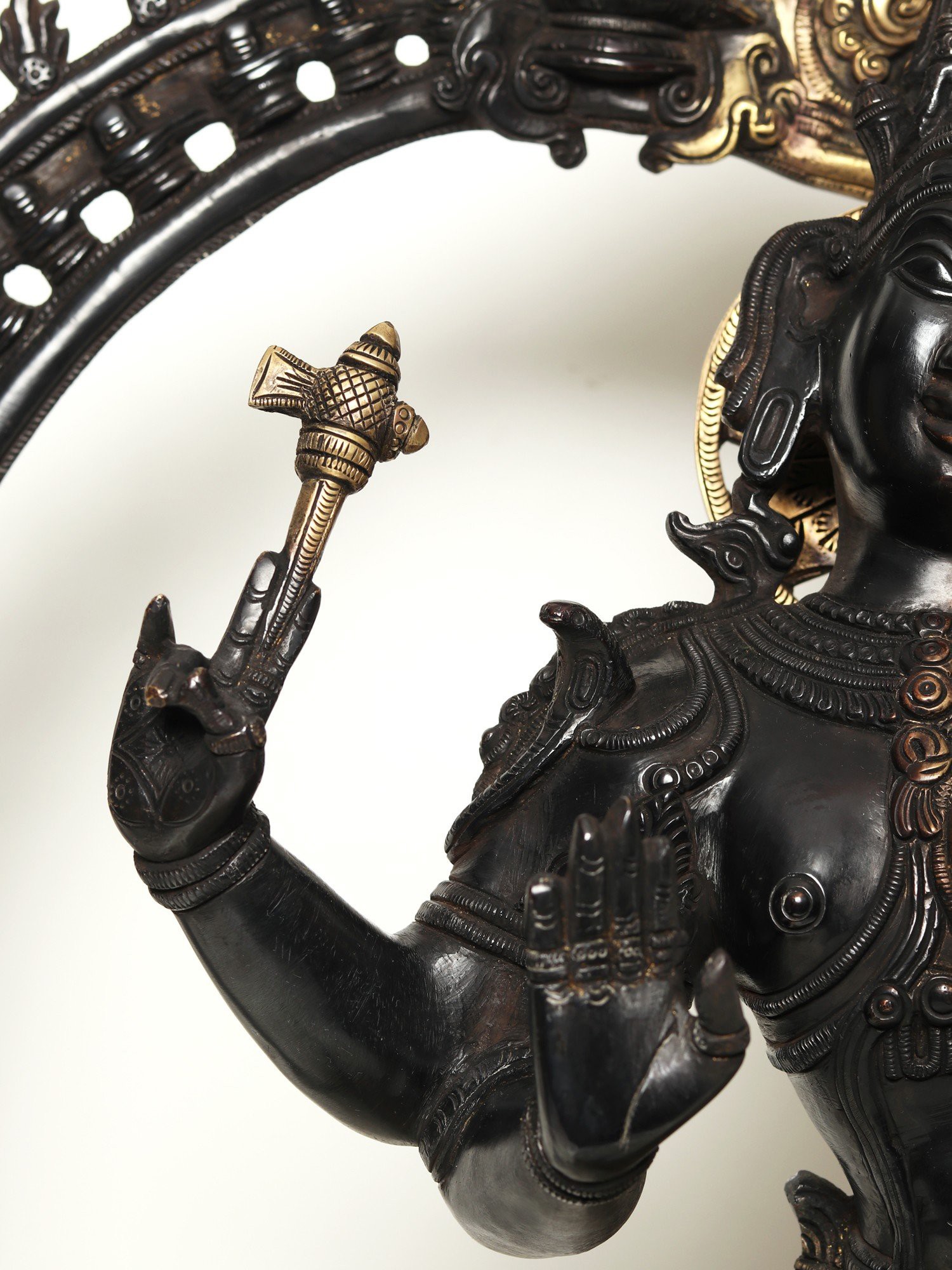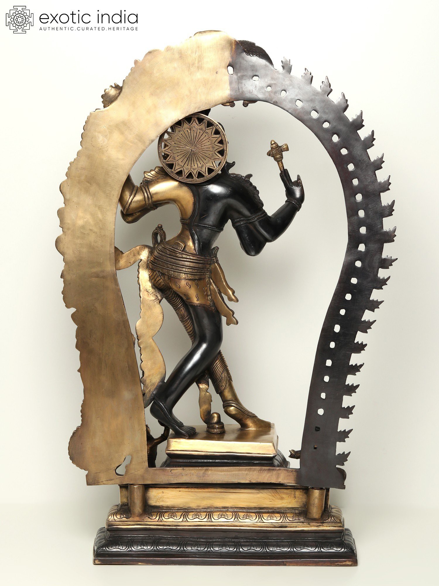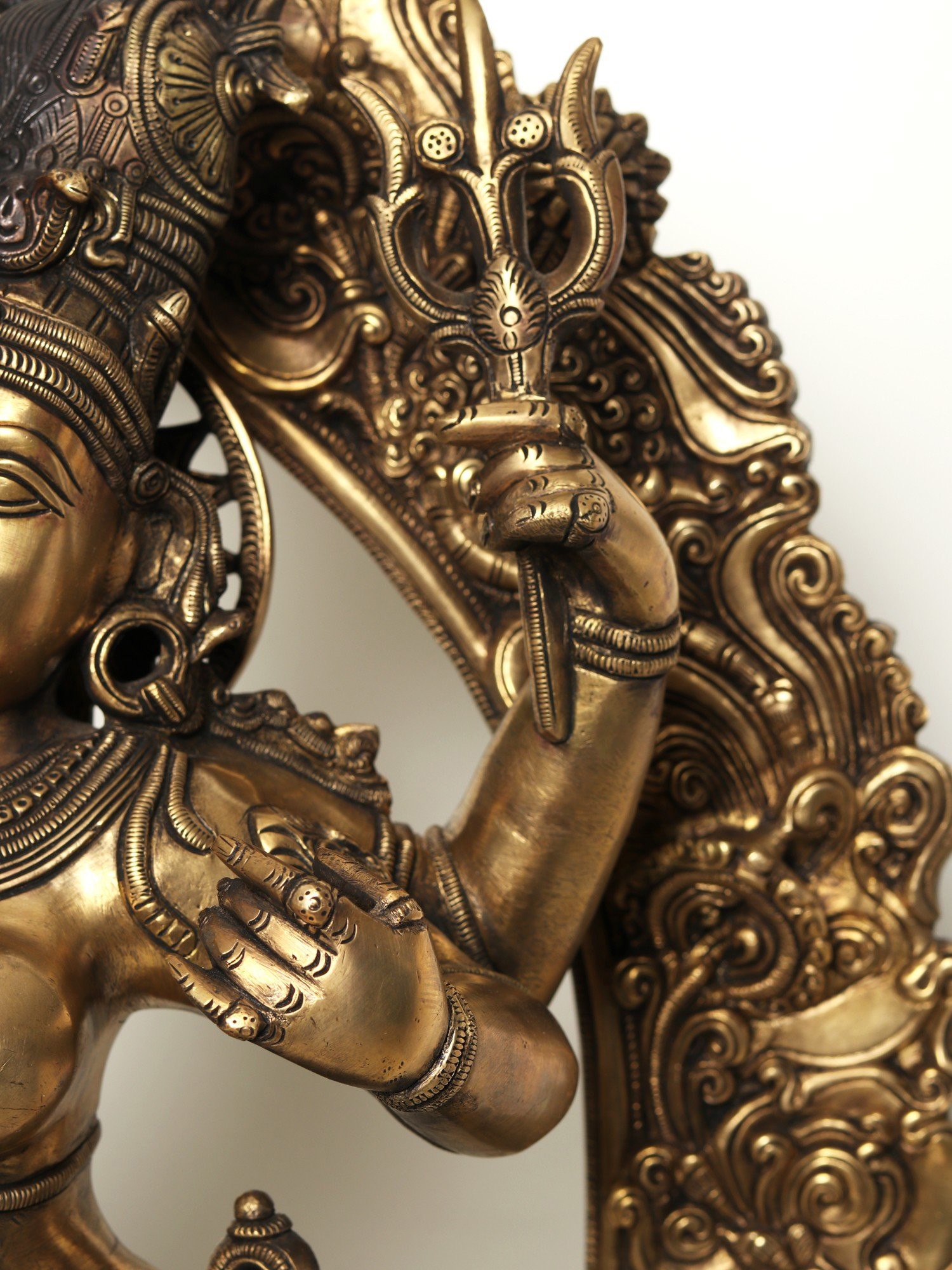 Ardhanarishwara- the union of Shiva and Shakti which inspired Brahma’s creation, and sustain it rivettingly dance in this brass statue, symbolizing the movement of Shiva and Shakti which runs the universe. Standing on a beautiful pedestal, Ardhanarishwara is accompanied by their sons- Ganesha and Karttikeya, who witness the heavenliness of their parents in bliss and awe. Shiva is marked by a mystical black color, adorned with Jatamukuta, serpent ornaments, tiger hide, holding an Ankusha, and the gesture of fearlessness. On his left, Uma emanates a golden aura, beautified by lovely ornaments and a delicate dhoti whose folds are delineated lyrically in the statue. Uma holds a trident, highlighting her powers as the supreme goddess Durga.