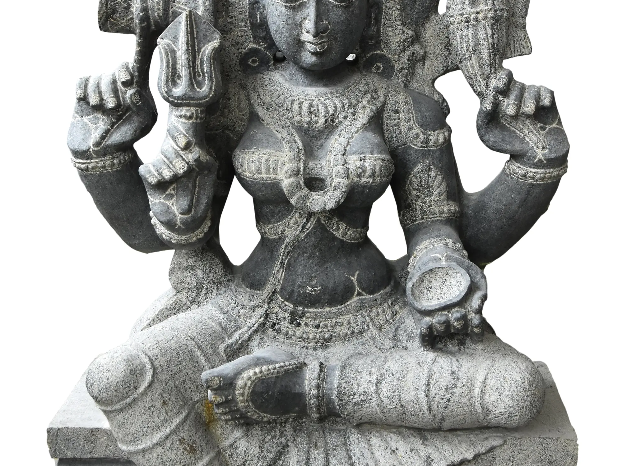 This granite statue depicts Mariamma in a peaceful yet forceful attitude, symbolizing her dual character as a nurturer and defender.