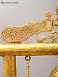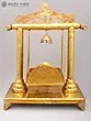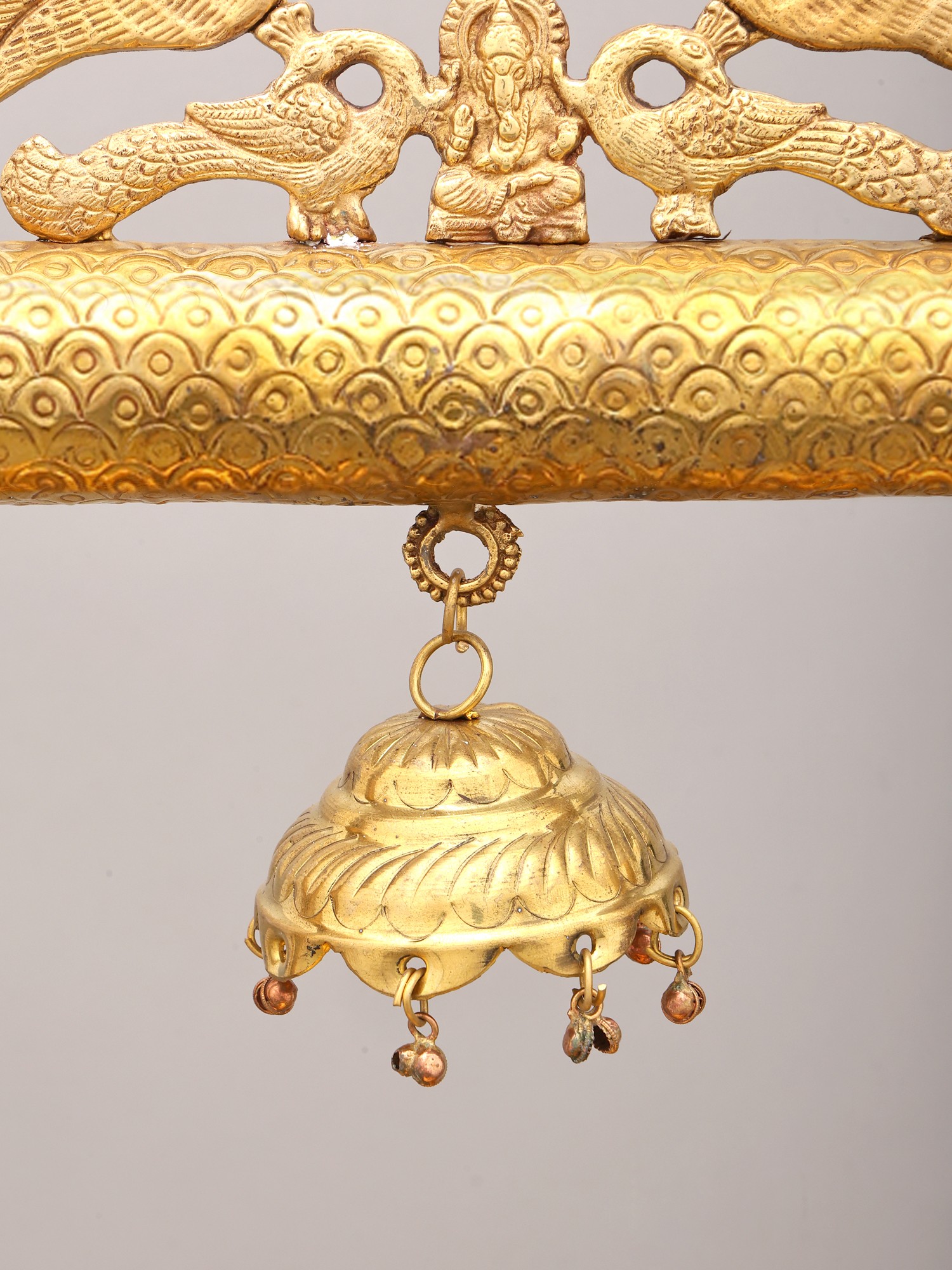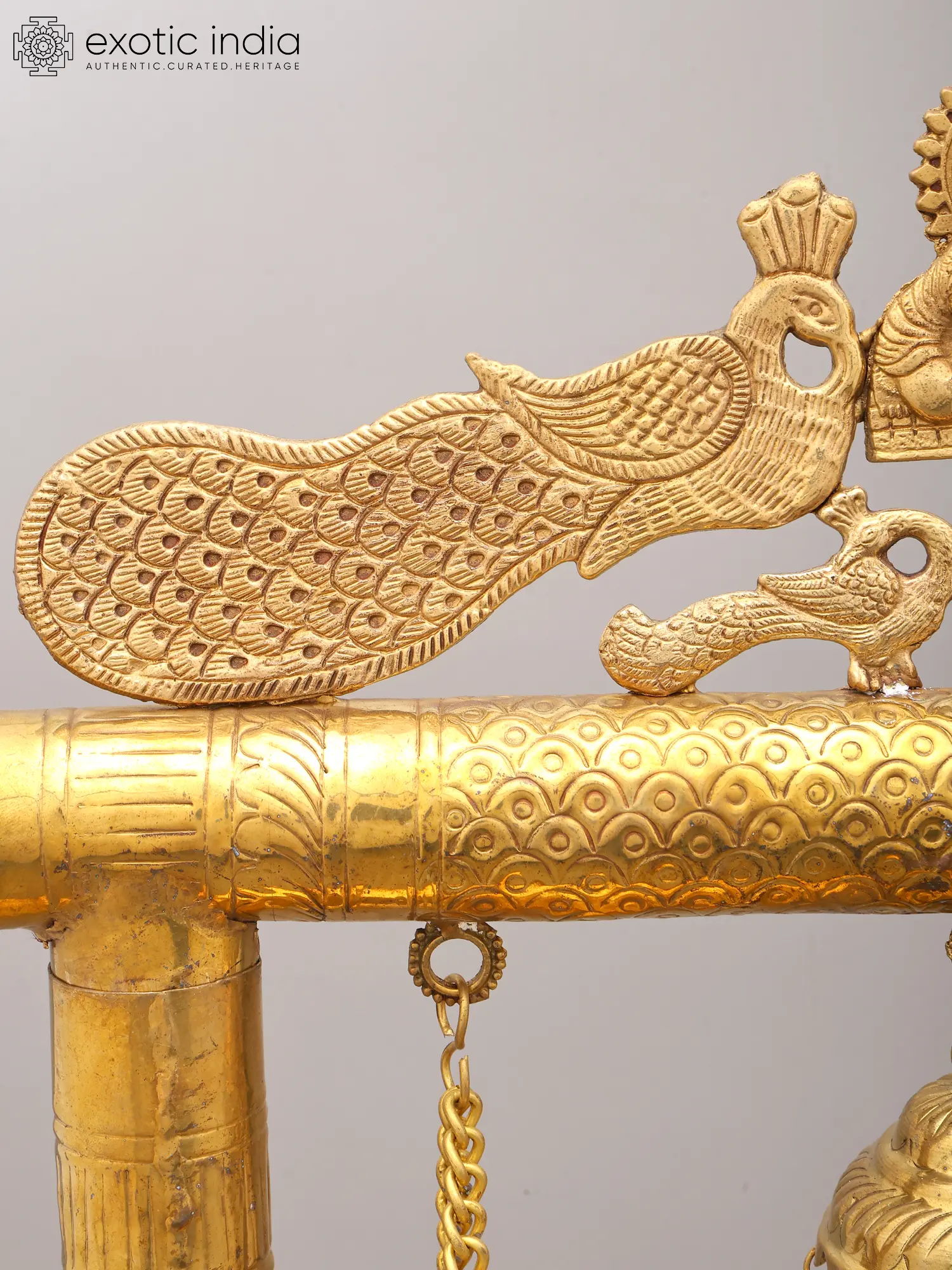 The sweeping arch, adorned with majestic peacocks and a central divine figure, immediately draws the eye, symbolizing prosperity and spiritual grace. The intricately latticed seat, suspended by elegant brass chains, offers a gentle sway, while the bell above adds a melodic touch to the devotional atmosphere. Even the sturdy base, reinforced with decorative studs and supported by intricately carved feet, exhibits a remarkable level of artistry, reflecting its substantial 29-inch height.