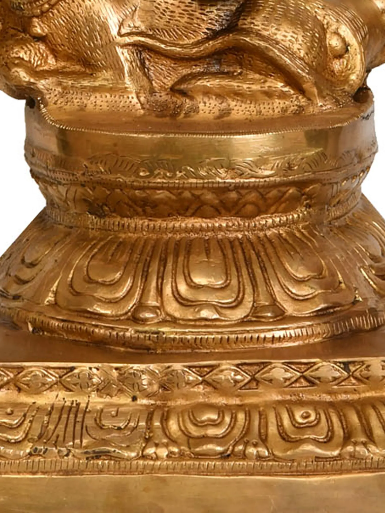 The Large Size Lord Ganesha as Nataraja in Brass captivates with its divine artistry. In this unique form, Ganesha assumes the role of a musician and bestows blessings, granting skill and proficiency in music, dance, and the arts to devotees. Dancing Ganesha, as Nataraja, can be found adorning the walls and pillars of Hindu temples, symbolizing the joy of celestial dance. An iconic 12th-century sculpture at the Hoysaleswara temple in Halebid, Karnataka, known as Nritya Ganesha, stands as a testament to this artistic tradition. This form is characterized by a slightly bent left leg resting on a padmasana, while the right leg is elegantly raised, embodying the essence of a dynamic dancing figure.