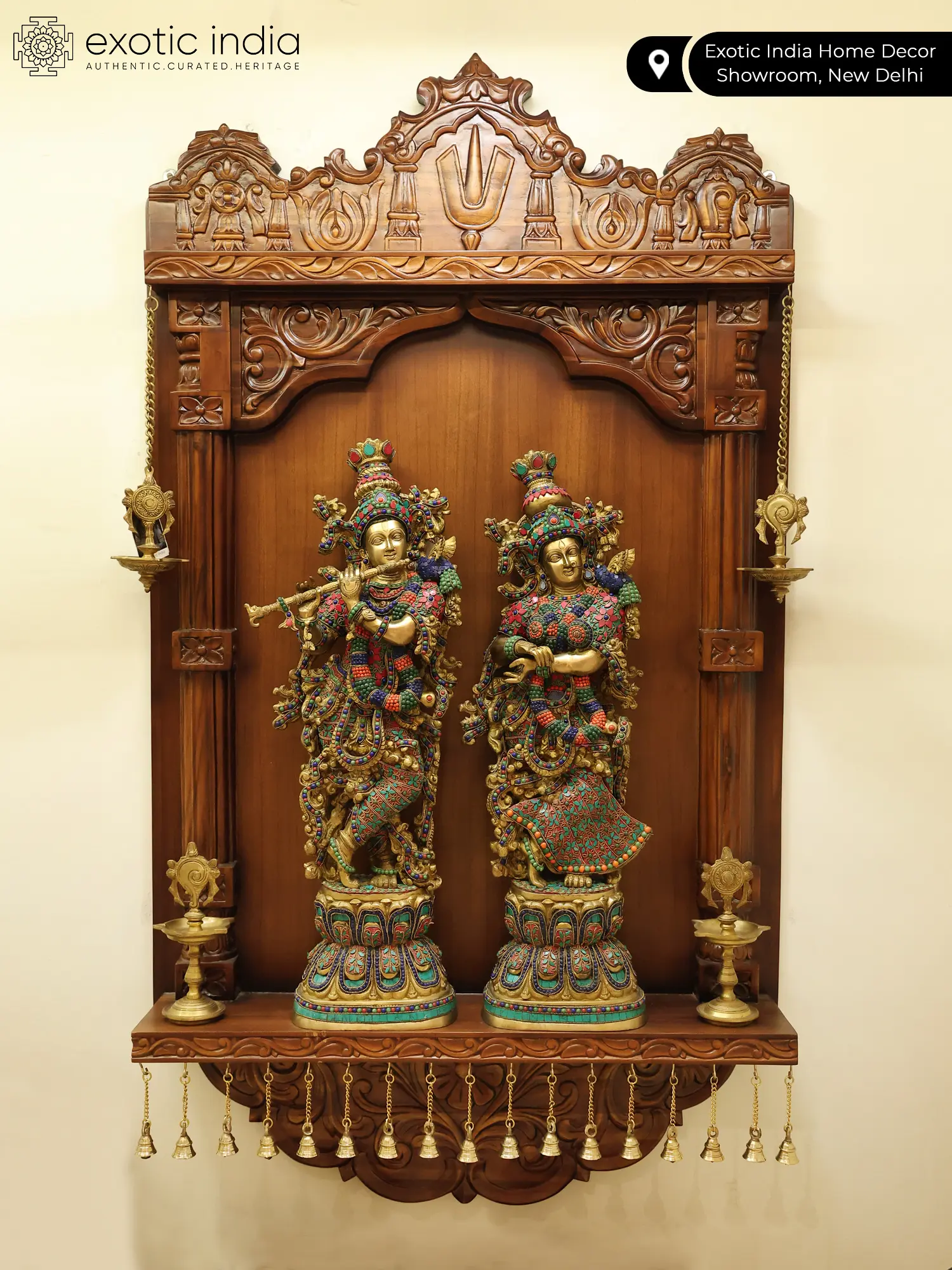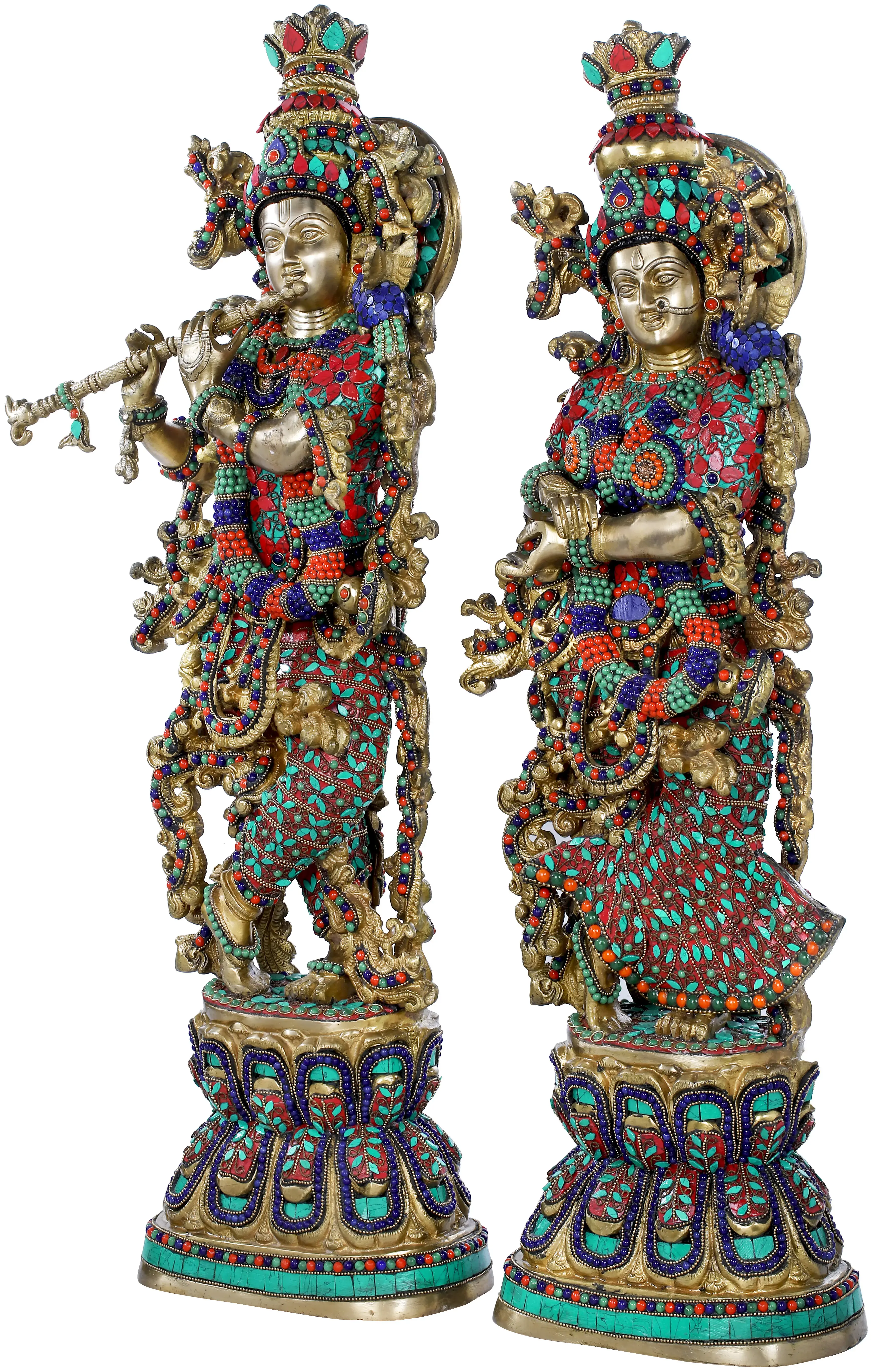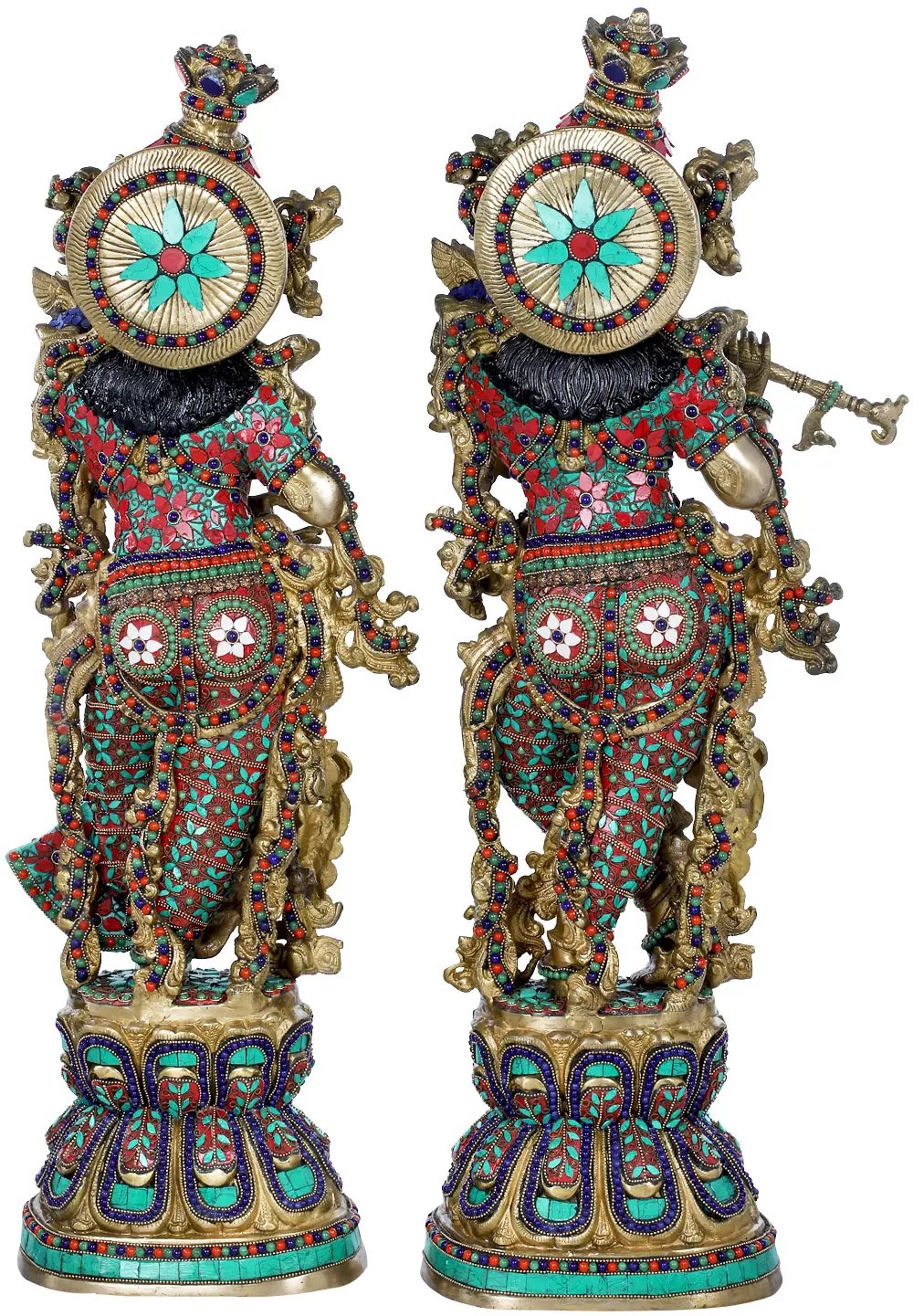 Immerse yourself in the ethereal beauty and divine grace of this magnificent brass representation of Radha and Krishna. This exquisite sculpture captures the essence of their eternal love, a theme that has inspired poets, musicians, and artists for centuries in India and beyond. Each piece is meticulously handcrafted by skilled artisans in India, carrying forward a legacy of artistic tradition and devotion. The vibrant inlay work, adorned with striking red, blue, and turquoise stones, brings to life the divine figures. Krishna, the enchanting flute player, stands in his iconic pose, his melody promising solace and bliss. Beside him, Radha, his beloved, exudes devotion and grace. Together, they embody the divine love that is central to Vaishnavism, a major tradition within Hinduism. Their union is seen as the supreme form of love, a spiritual connection that transcends the ordinary. ––––––––––