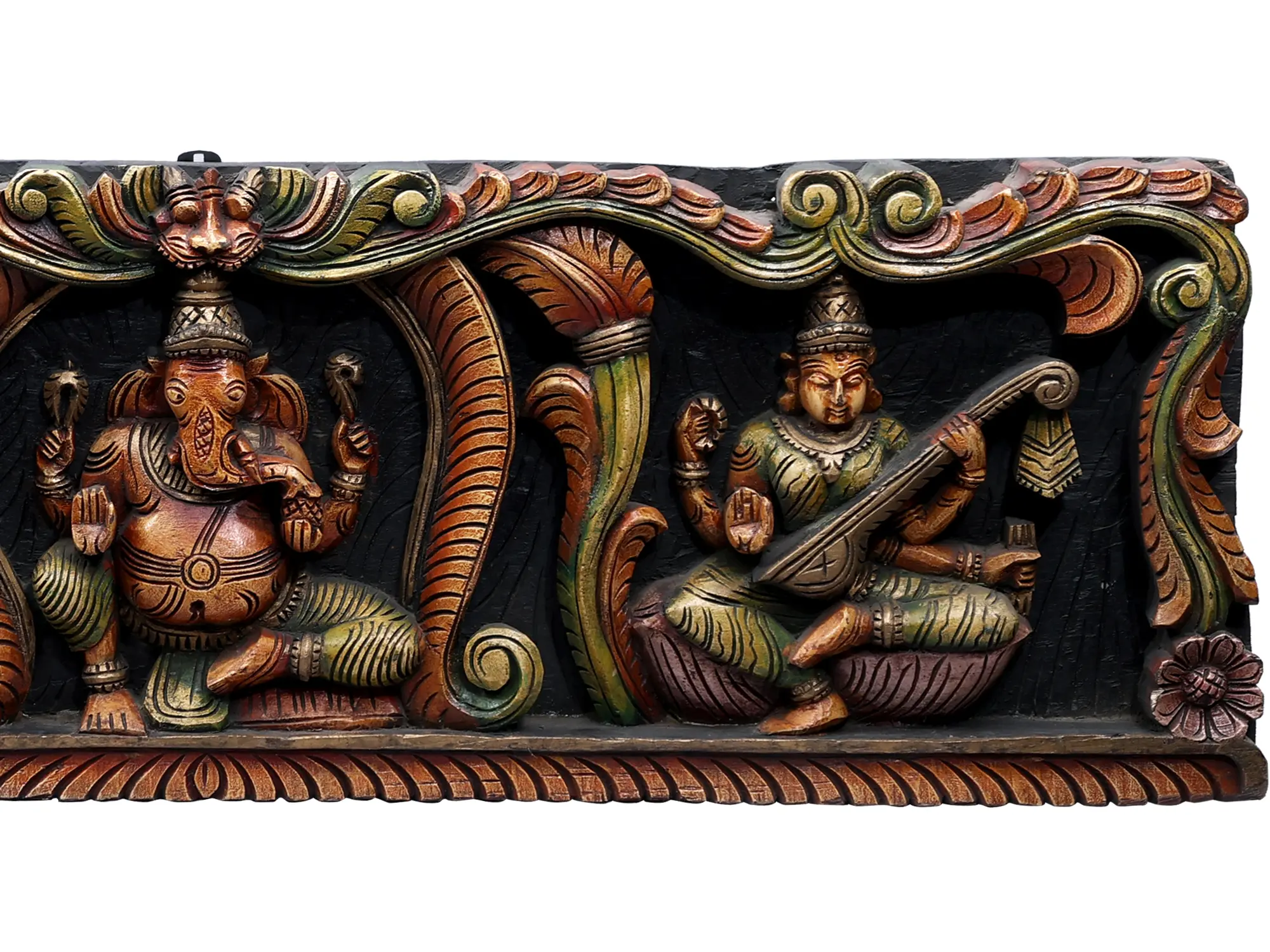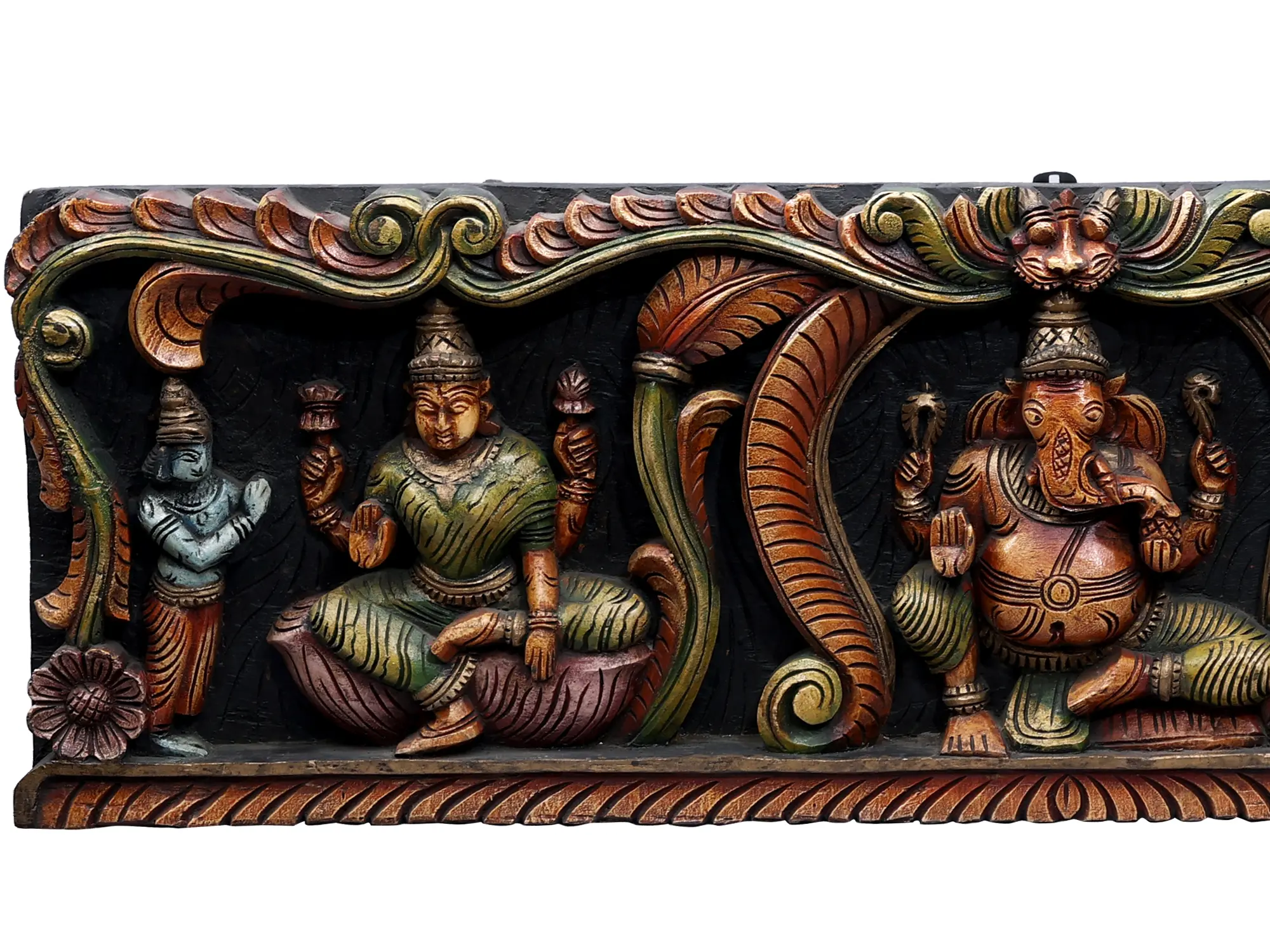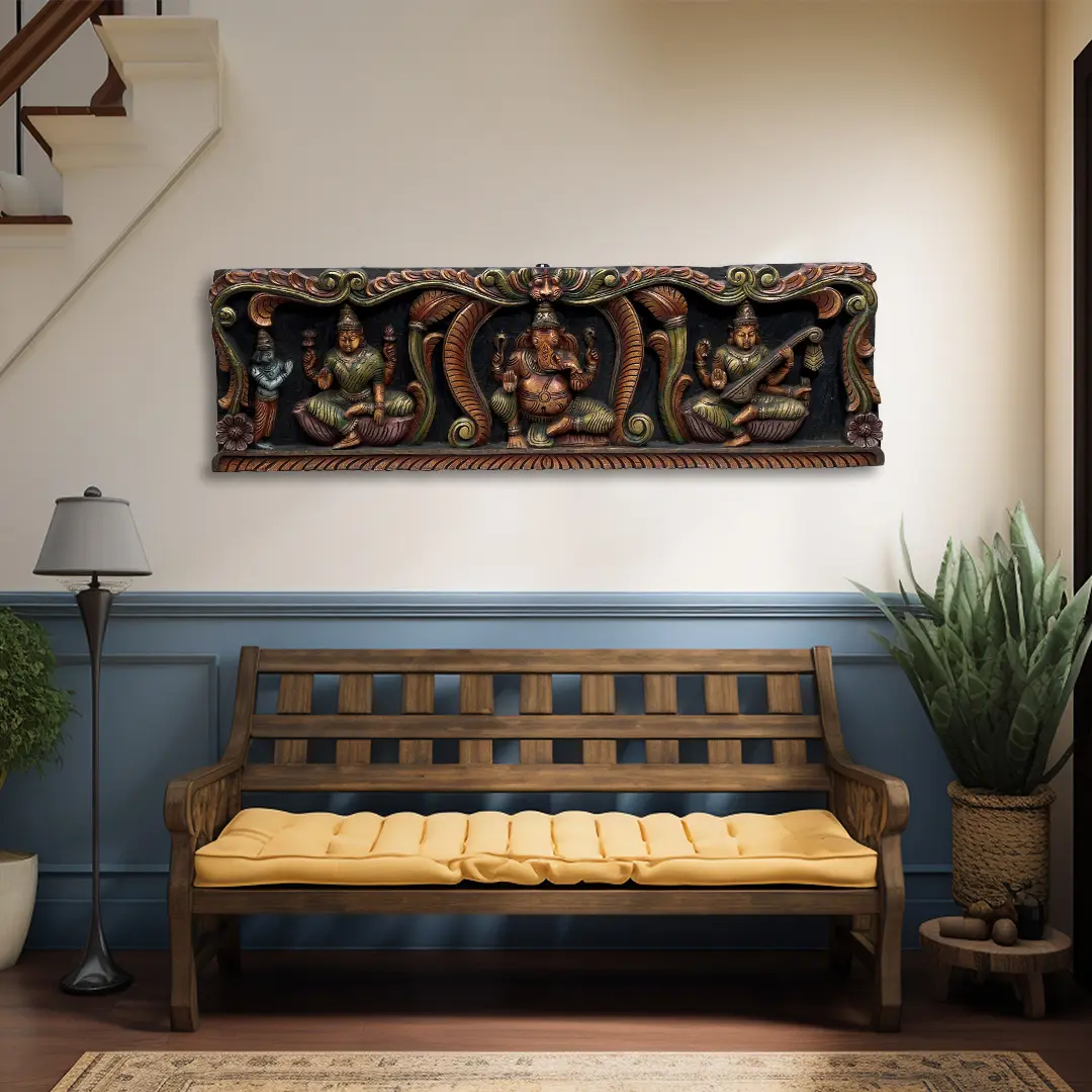 Adorn your space with divine blessings through our wooden wall panel featuring the sacred trio of Goddess Lakshmi, Lord Ganesha, and Goddess Saraswati. Seated gracefully, they exclude prosperity, wisdom, and auspiciousness. Crafted with meticulous detail and reverence, this panel captures the timeless elegance of their divine presence, inspiring devotion and invoking blessings of wealth, success, and knowledge. Let the divine energy of Lakshmi, Ganesha, and Saraswati adorn your walls, bringing harmony, abundance, and creative inspiration into your space.