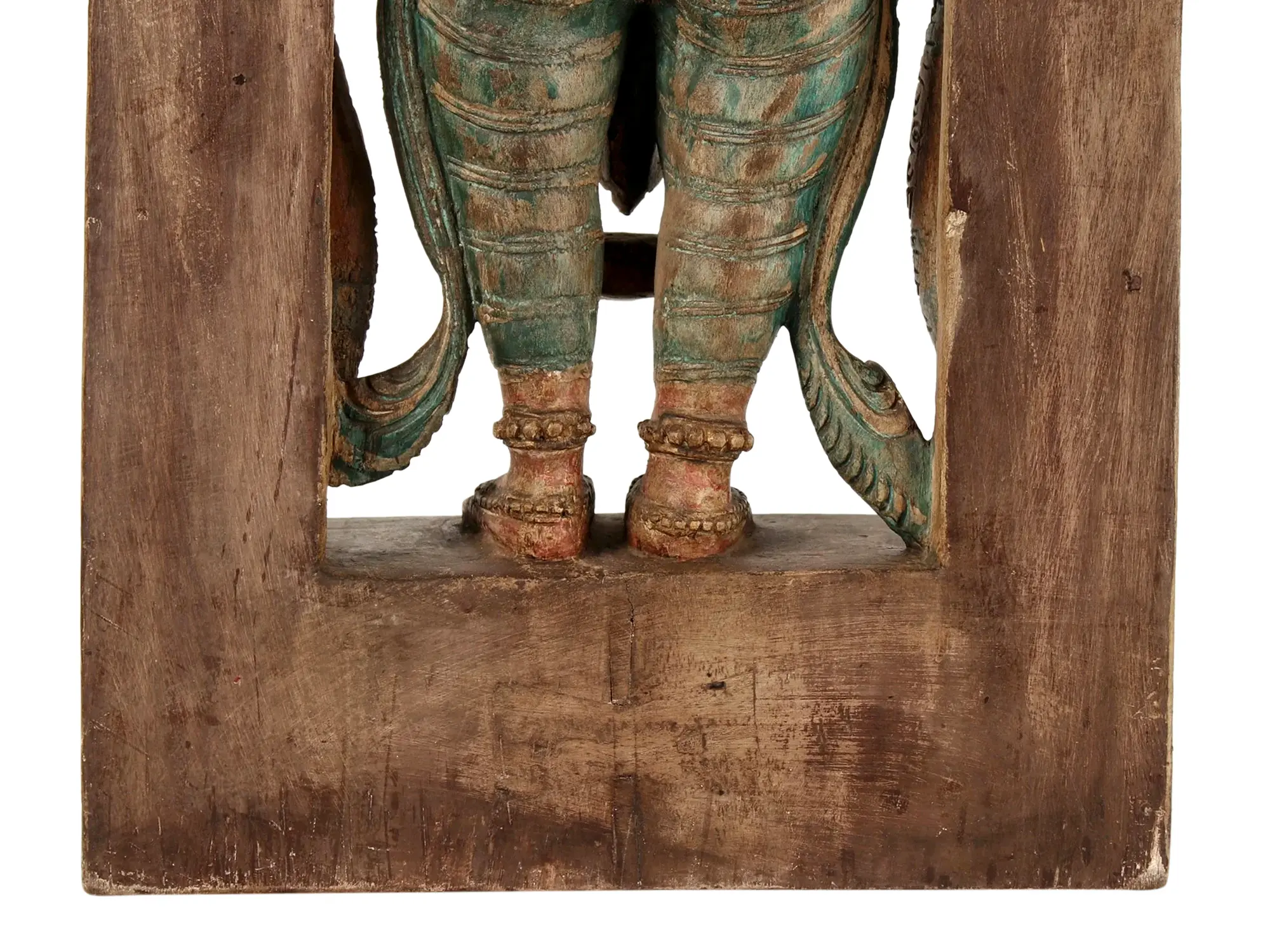 The deity is presented seated upon a magnificent Kirtimukha throne, a powerful symbol in South Asian iconography. The Kirtimukha, often depicted as a fearsome, open-mouthed face, represents a devourer of the ego and a protector against malevolent forces. Its presence here signifies Hanuman's supreme status and his role as a divine guardian. The throne itself is a work of art, with elaborate carvings that echo the grandeur and divine authority of the figure it supports. The weathered finish lends an aura of antiquity, suggesting a piece that has absorbed centuries of devotion. ––––––––––––––––––––