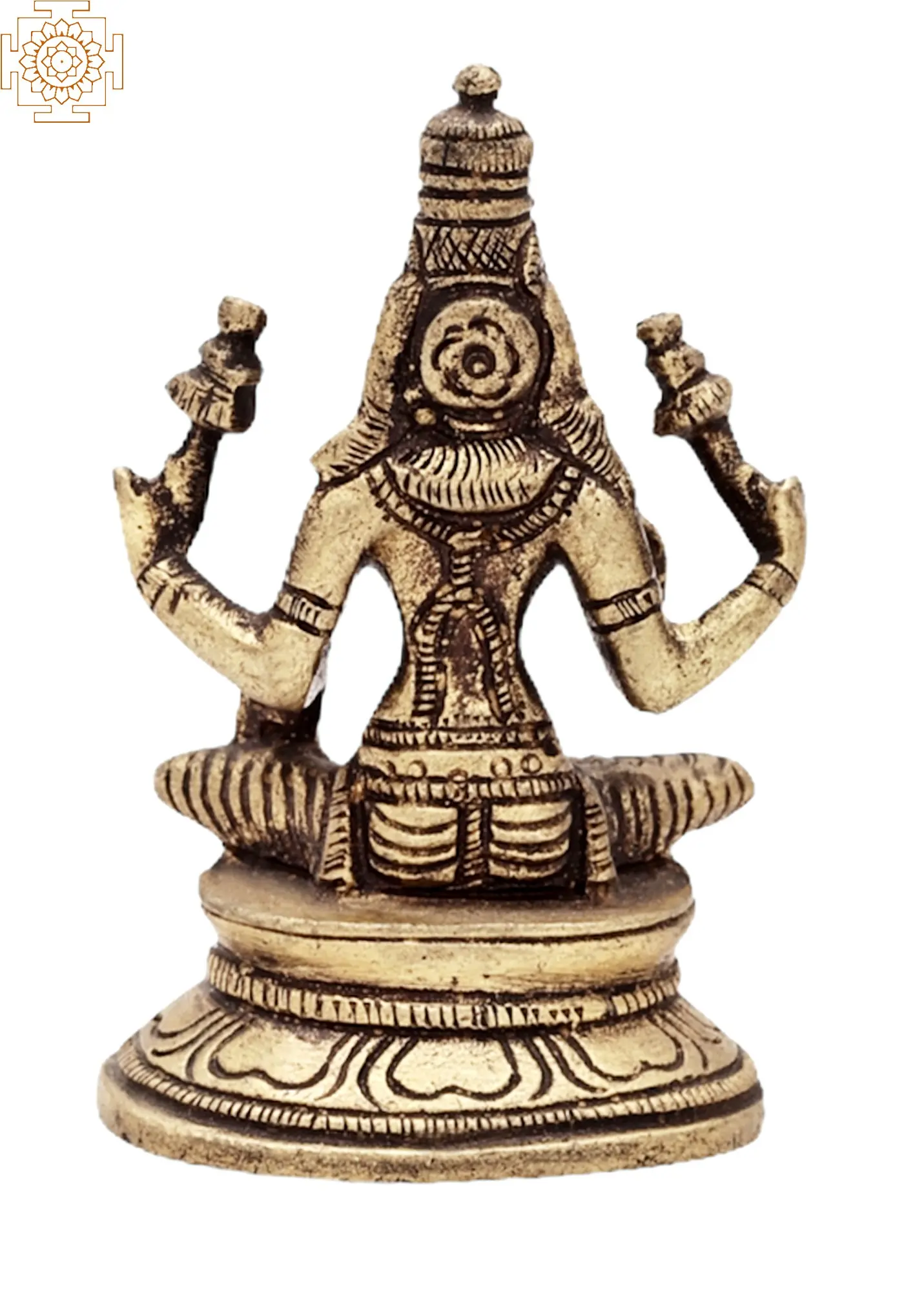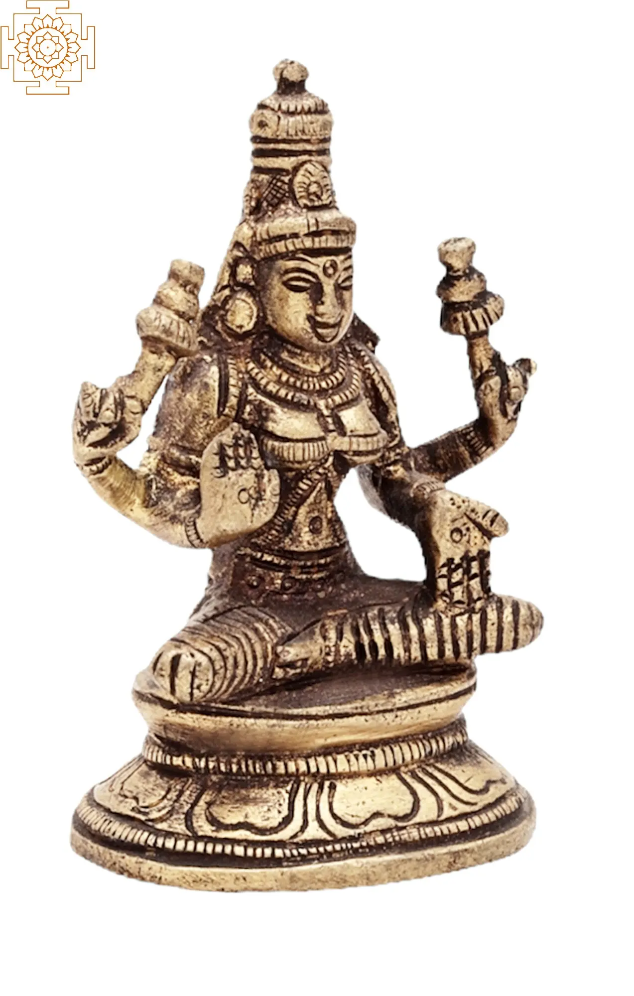 Brimming with signs of youth, which suggest her divine auspiciousness and eternal fecundity of her aspect as mother Earth (Bhudevi), the goddess Lakshmi in this small brass statue is the pinnacle of propitiousness. Devi Lakshmi has a supple form, which is beautifully adorned, with a Kiritamukuta, Kuchabandha, necklaces, and a delicate dhoti. Holding lotuses in her secondary hands, Maa Lakshmi has her primary arms in Abhaya and Varada mudra- removing fear and showering riches on her devotee.