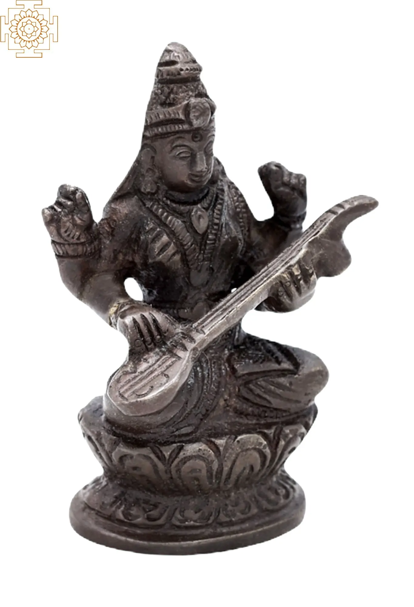 The manifestation of the creative aspect of the supreme feminine energy or Adi Shakti, the goddess Saraswati is one of three prime goddesses- Tridevis, in Hindu tradition. In this small brass statue, Goddess Saraswati appears in her Veenavadini aspect, seated on a lotus which is symbolic of divine wisdom and purity.