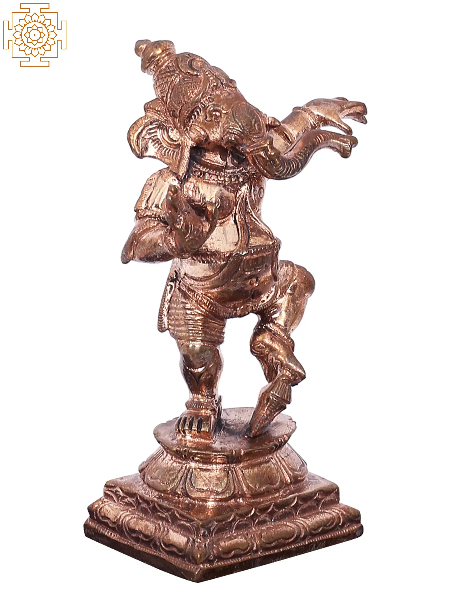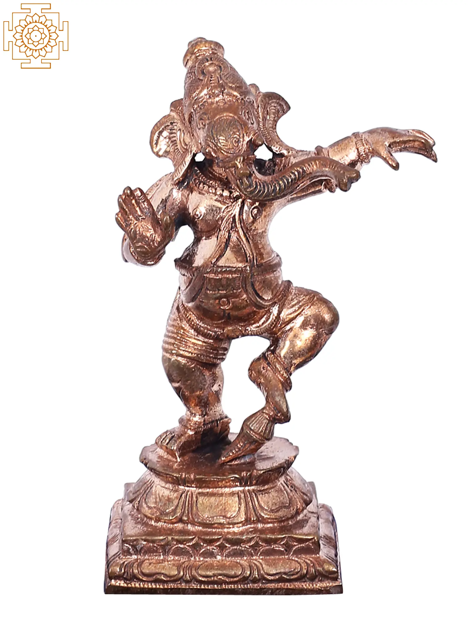 Embrace the vibrant energy and divine blessings of Lord Ganesha with this exquisite Panchaloha bronze sculpture. Crafted using the ancient Madhuchista Vidhana (lost-wax) method in the renowned artisan hub of Swamimalai, this piece captures the joyous and dynamic spirit of Ganesha in his dancing form. The rich patina of the bronze evokes a sense of timelessness and spiritual depth, making it a focal point of devotion and aesthetic appeal. The elephant-headed deity, revered as the remover of obstacles and the lord of beginnings, is depicted in a lively dance pose. This energetic stance symbolizes the cosmic dance of creation and dissolution, a profound concept in Hindu philosophy. The rhythmic movement frozen in metal invites a sense of celebration and auspiciousness into any space. It is said that Shiva himself taught Ganesha the art of dance, making this depiction particularly significant, representing divine grace and mastery over all forms of expression. ––––––––––––––––––––