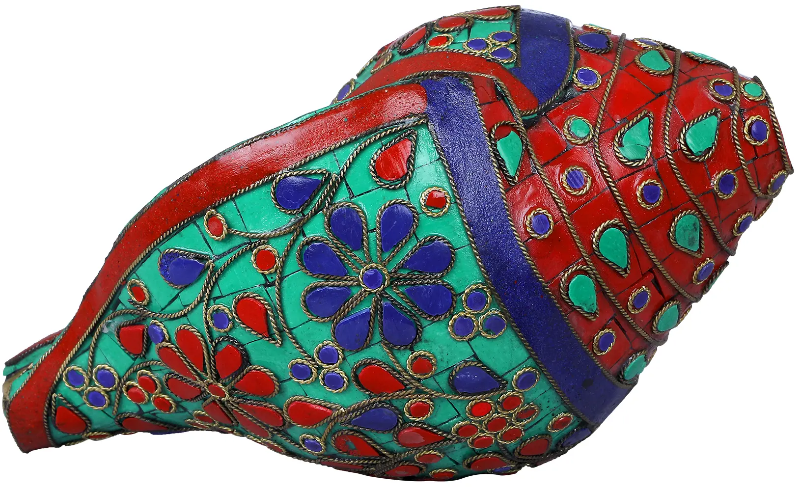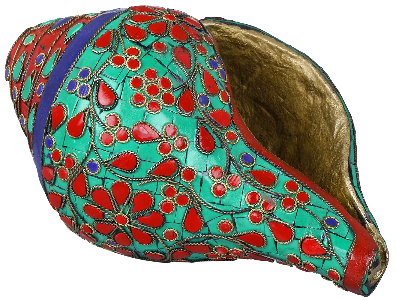 This inlay conch is a symbol of purity and spirituality, meticulously handcrafted in India. The conch, known as a Shankha in Sanskrit, holds immense significance in Hindu rituals and traditions. The intricate inlay work on this brass conch adds an artistic touch, while its sound when blown is believed to purify the surroundings and evoke divine blessings. It represents the calling of the divine and the beginning of auspicious ceremonies. Embrace this exquisite piece and let the sound of the conch fill your space with the divine aura and sacredness of Indian traditions.