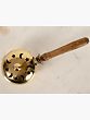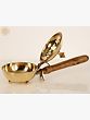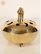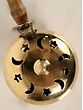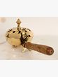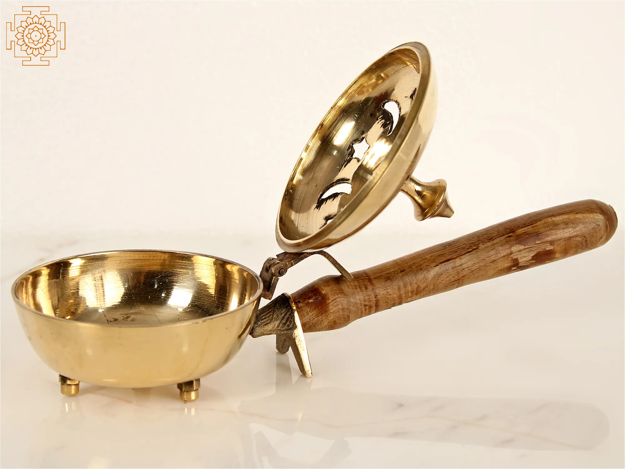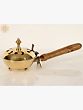This incense burner is both attractive and useful, made of high-quality brass. It aims to hold and safely burn incense, allowing fragrant smoke to diffuse into the surrounding environment for religious rites, meditation, or aromatherapy. Loban, commonly called Frankincense, is used to produce smoke by laying it over a burning coal or coconut husk. This incense burner, or Lobandan, is a basic jar with a top that has circular cutouts of the moon and stars. The cutouts enable optimal smoke dispersal. A wooden handle allows for a tight grasp, and the wood protects the palm from being burnt when holding the burner.