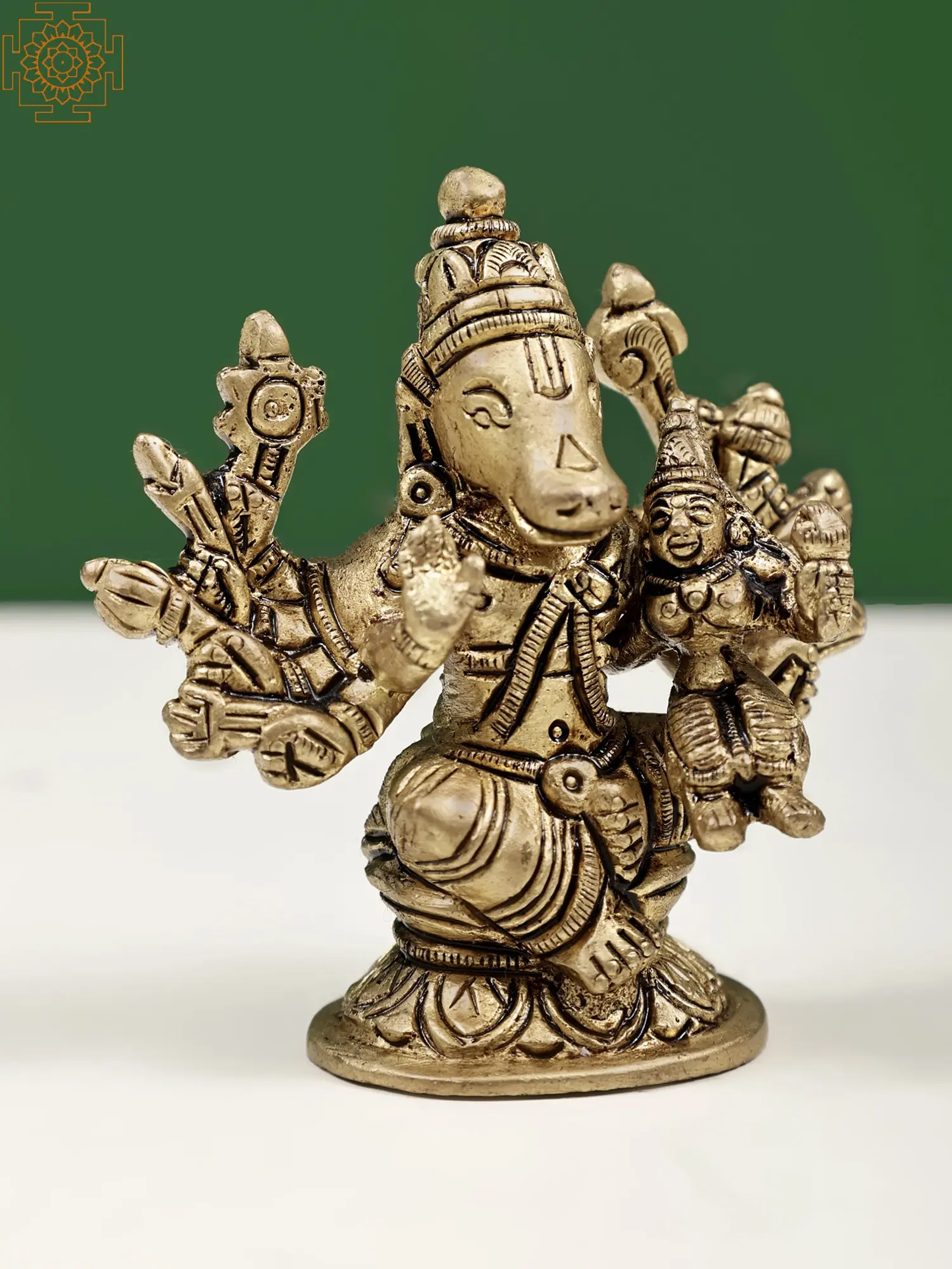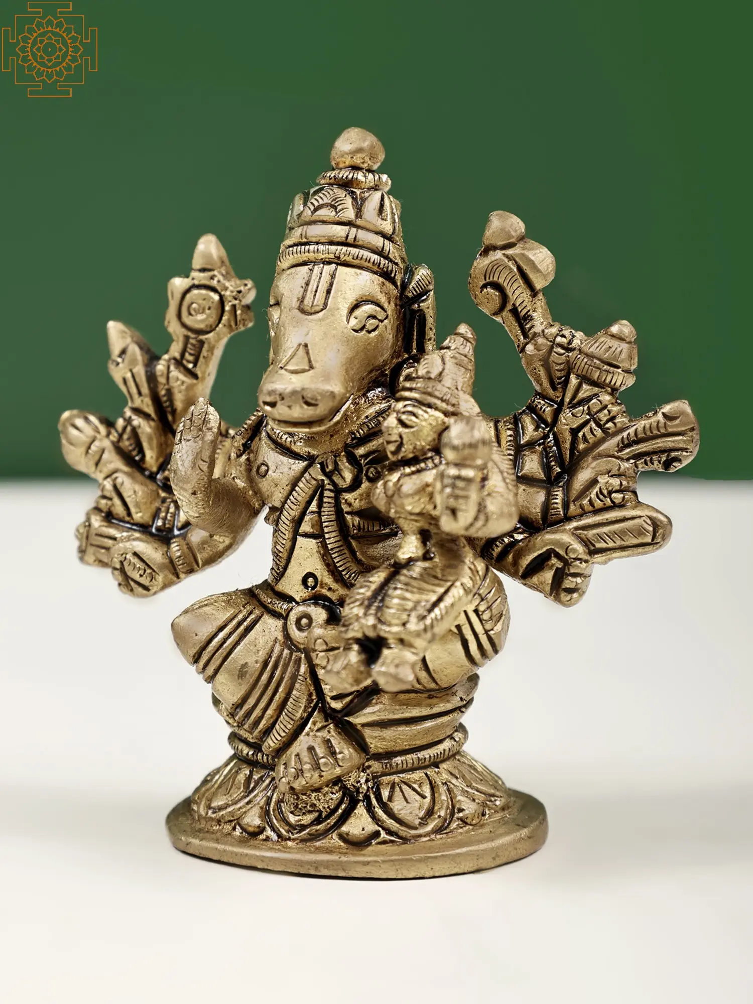Varaha is an incarnation of “Lord Vishnu”, in the form of a wild boar. In this incarnation, Vishnu appeared with “Devi Lakshmi”, his eternal spouse, as humble ascetics. They roamed the mortal realm in regal attire, imparting wisdom, compassion, and spiritual teachings to humanity. Together, they represent the harmonious balance between strength and grace, stability, and prosperity. Varaha and Lakshmi together also symbolise the restoration of righteousness (dharma) and the preservation of cosmic order. Crafted in gleaming brass, this sacred artwork brings financial stability, removes obstacles, and enhances overall well-being.