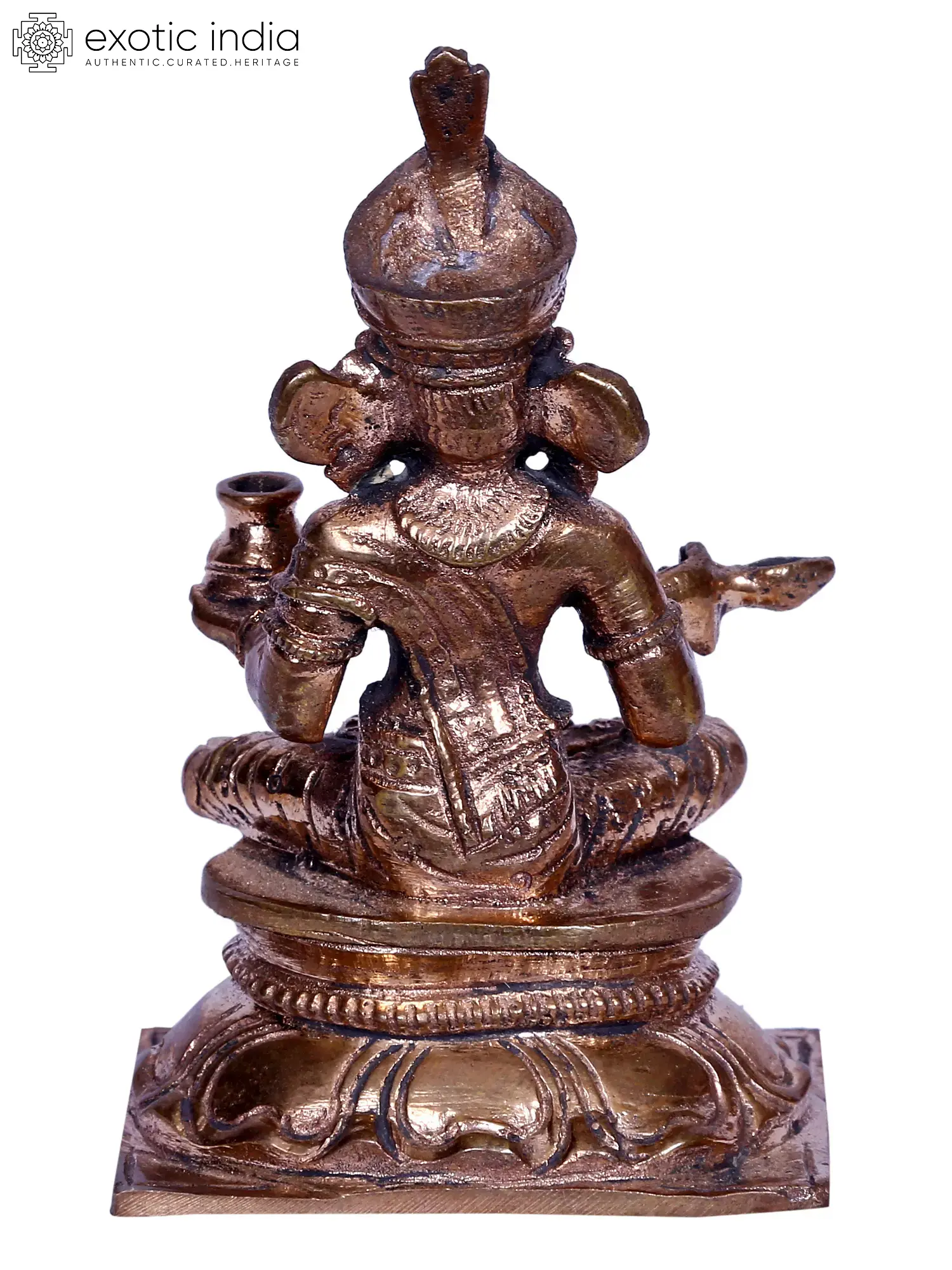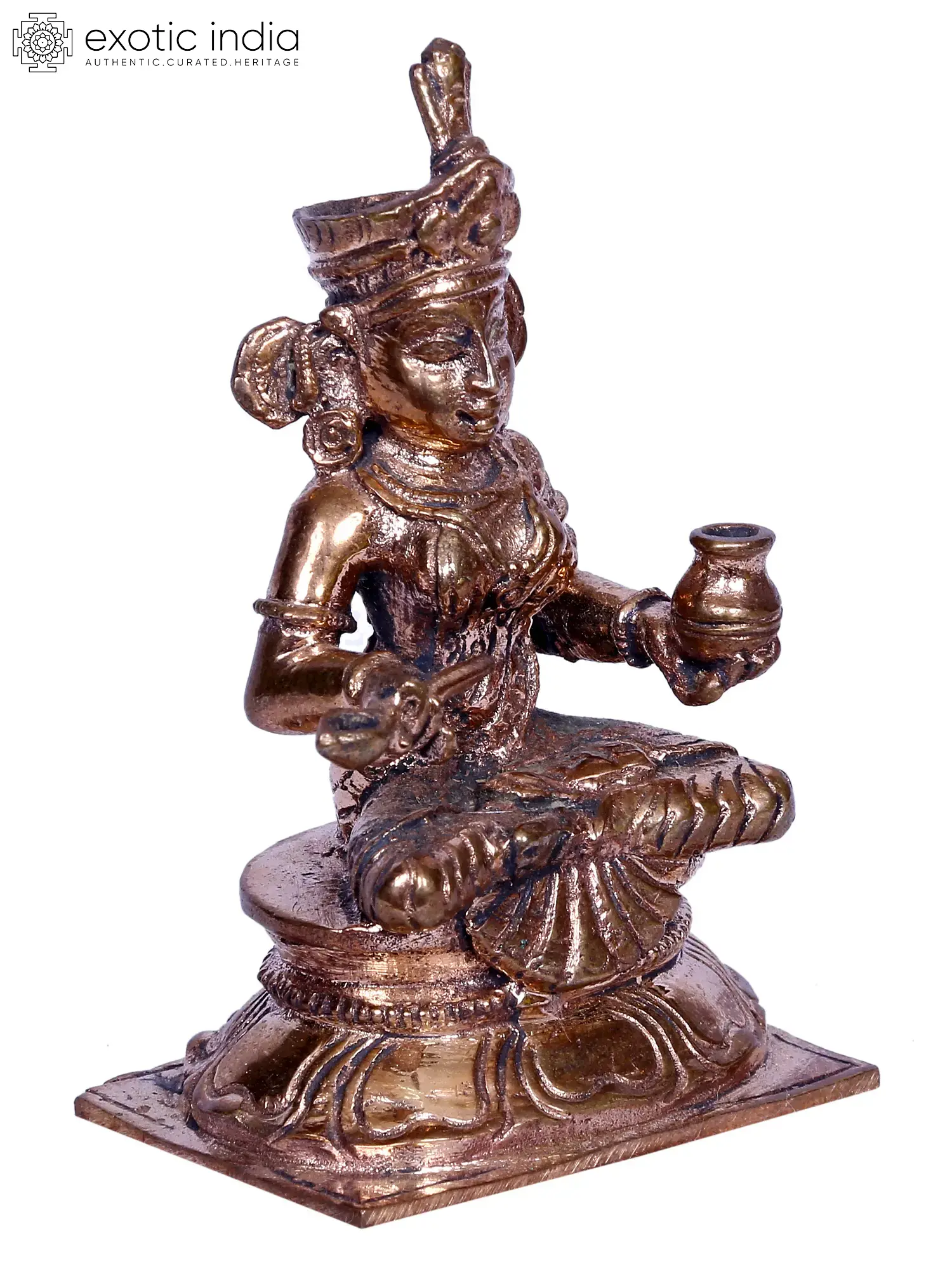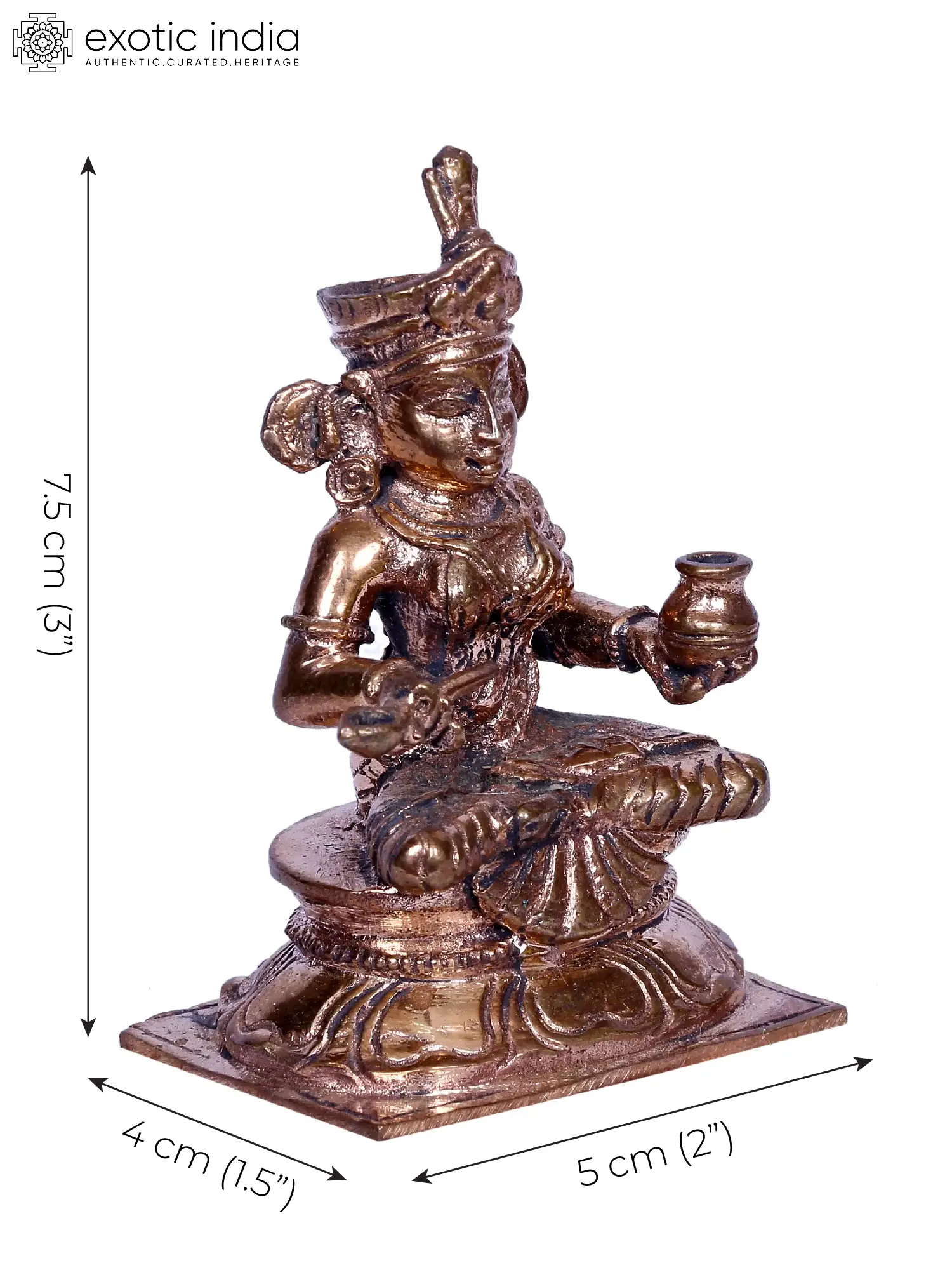 The small bronze icon of Devi Annapurna radiates a divine aura, embodying the essence of sustenance and nourishment. Enthroned on a lotus pedestal, she wears traditional garments and carries her emblematic attributes—a pot and ladle—symbols of endless abundance. The intricately crafted crown and ornaments accentuate her queenly presence, emphasizing her role as the universal nourisher. In this miniature masterpiece, the goddess transcends the confines of metal, inviting worshippers to partake in the eternal cycle of giving and receiving, where she, as the benevolent provider, sustains not just the physical hunger but also nourishes the soul with boundless grace.