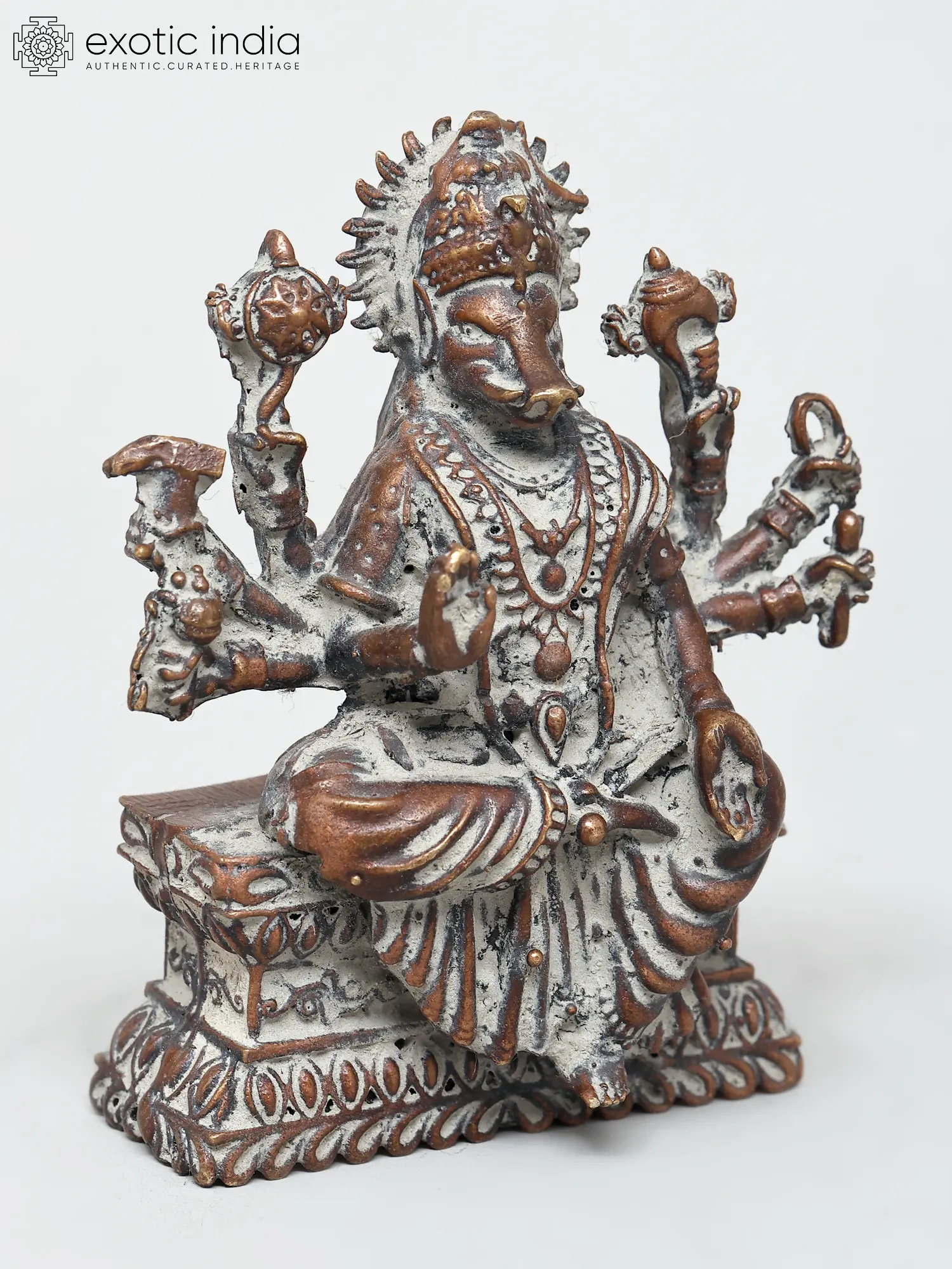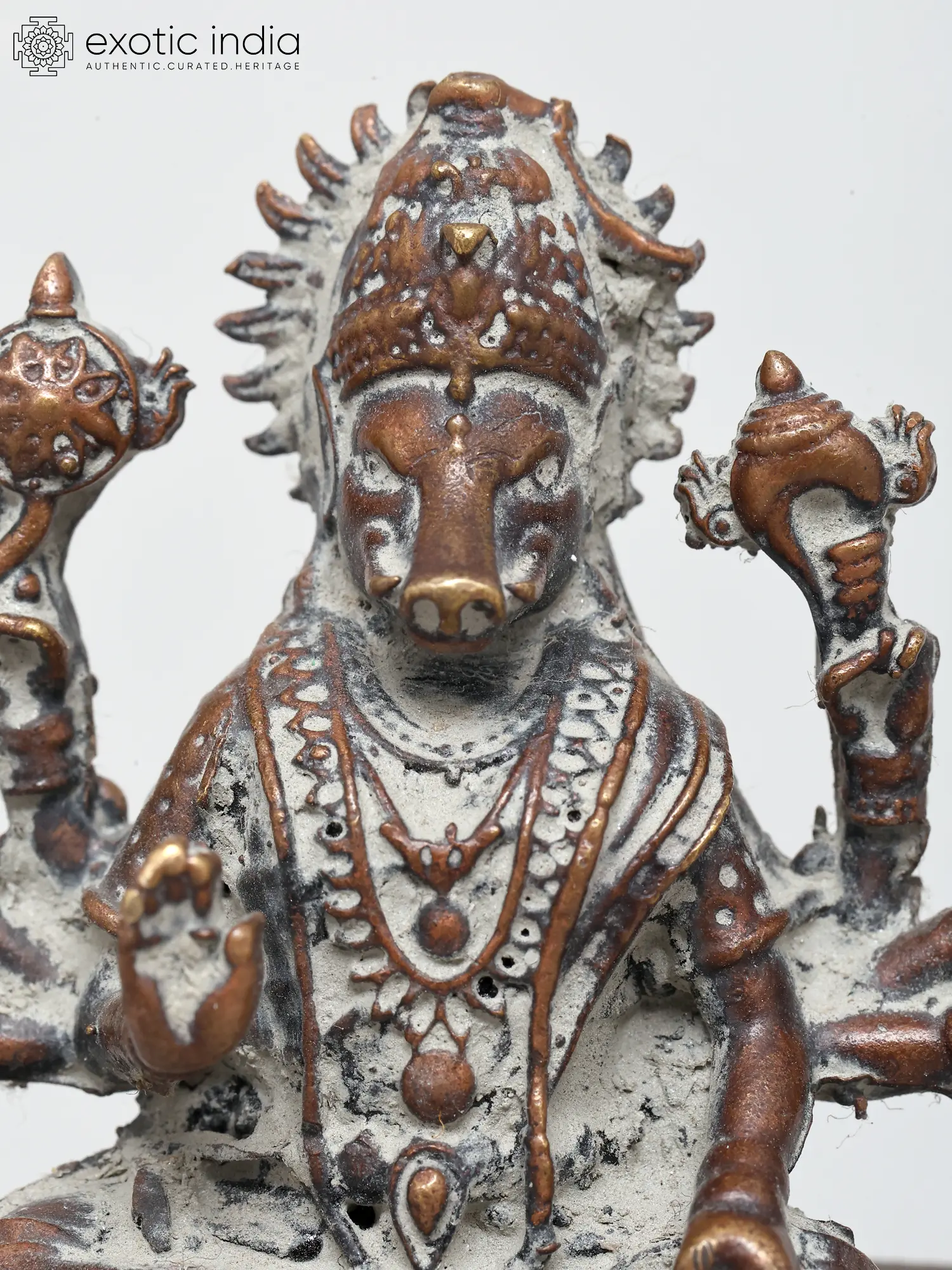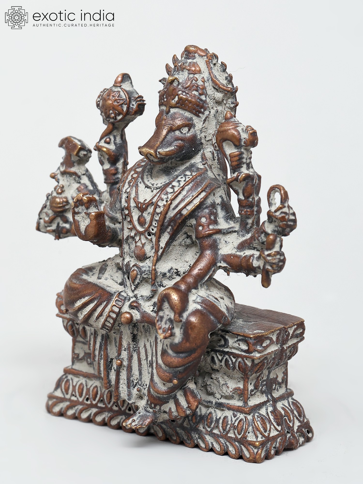 This exquisite copper statue captures the formidable yet benevolent form of Goddess Varahi, one of the most powerful and revered figures within the pantheon of Hindu goddesses. Depicted with her distinctive boar-like visage, a symbol of her fierce nature and unwavering protection, this deity is a formidable force against negativity and a beacon of blessings for her devotees. The eight arms signify her omnipotence and her ability to attend to numerous tasks and devotees simultaneously, wielding various potent symbols of her divine power.