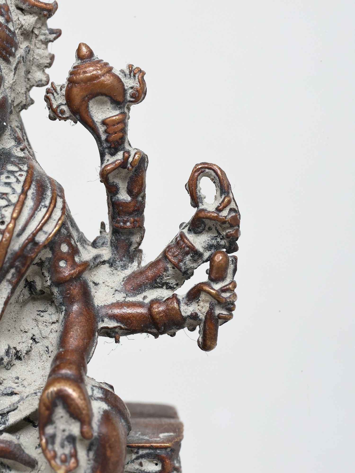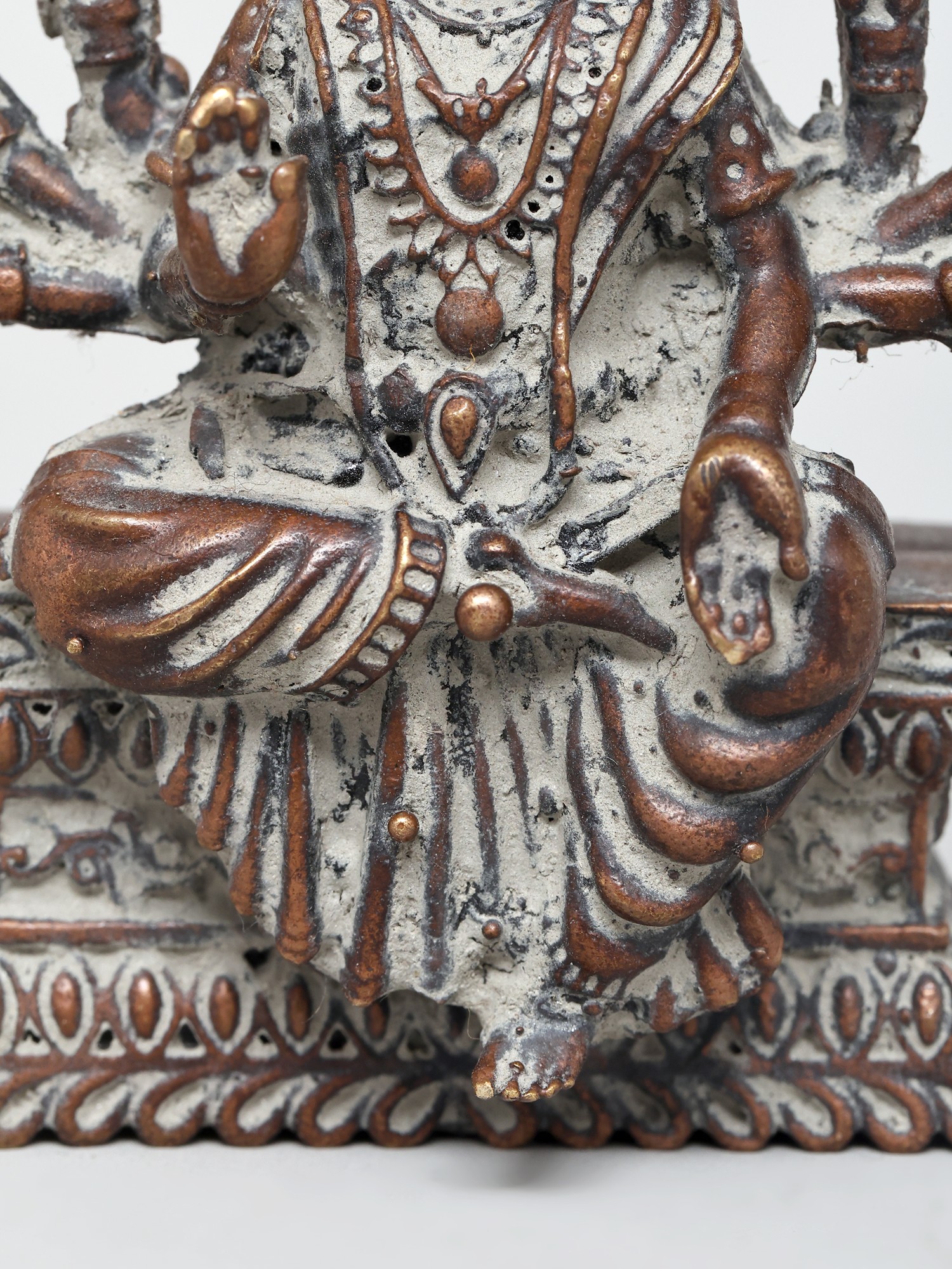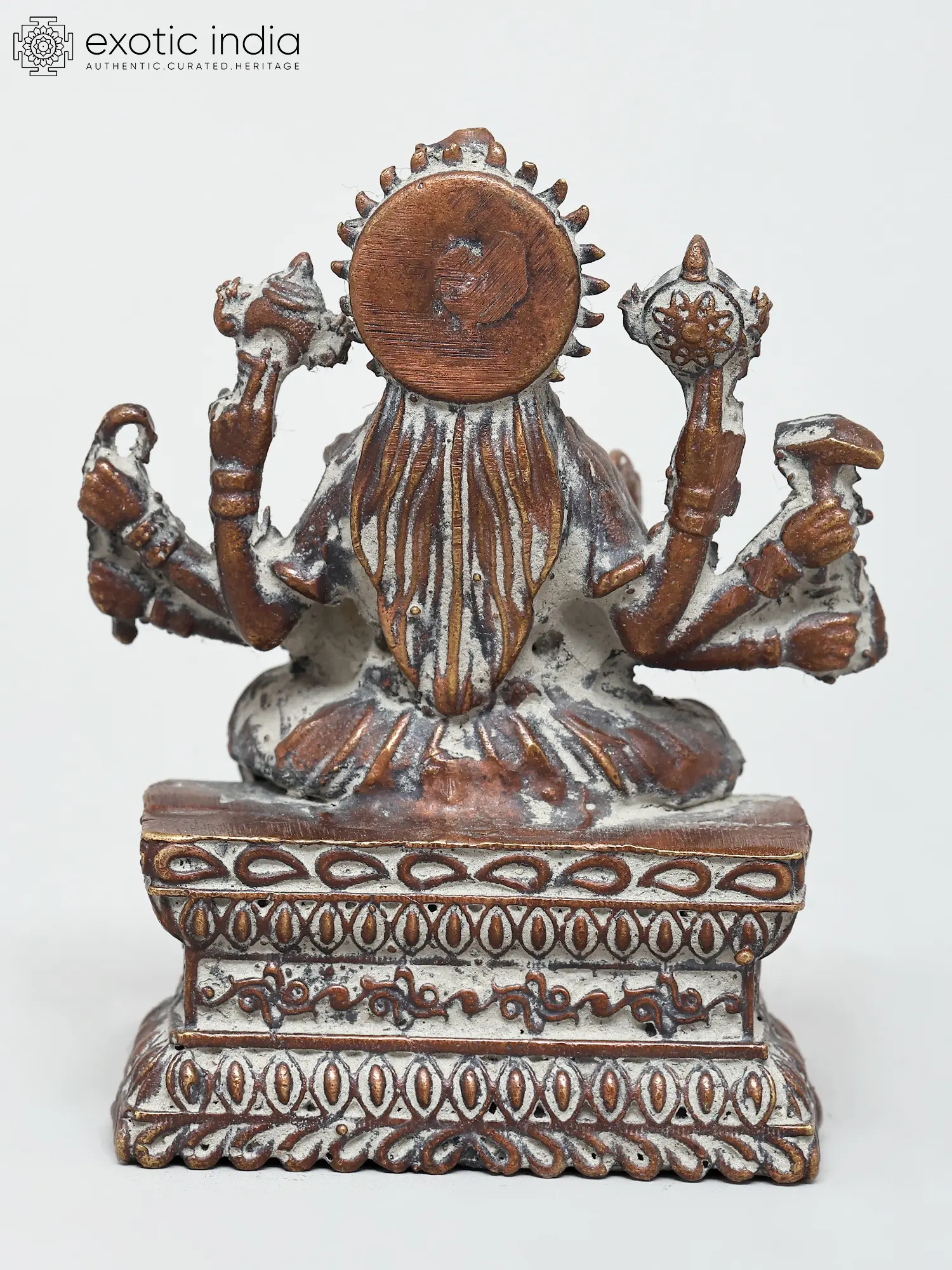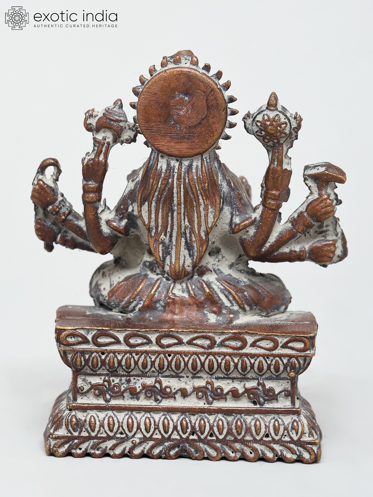 Crafted from durable copper, this statue exhibits a captivating patina that lends it an aura of antiquity and deep spiritual significance. The intricate detailing on each of her eight arms, the ornate jewelry adorning her divine form, and the meticulously rendered facial features speak volumes about the skill of the artisan. The posture of seated meditation, coupled with the benevolent gesture of her hands, conveys a sense of serene power and profound grace. The contrasting textures and the subtle variations in the copper's hue further enhance its visual appeal, making it a truly remarkable piece for any sacred space or collection. This statue is not merely an object of art but a conduit to the divine energies of Varahi, inviting protection, strength, and blessings into your life. Its compact size makes it an ideal deity to be placed on an altar, a desk, or even carried for personal solace and connection.