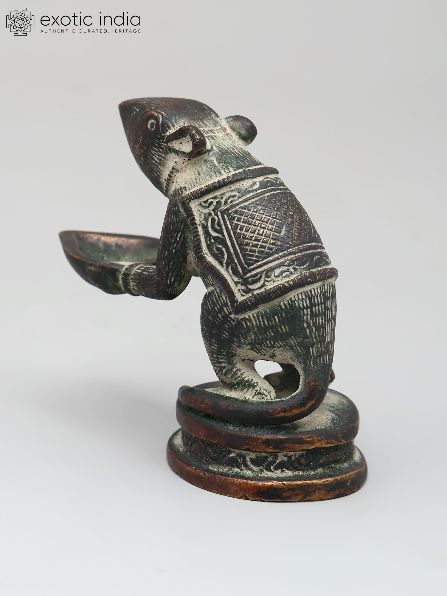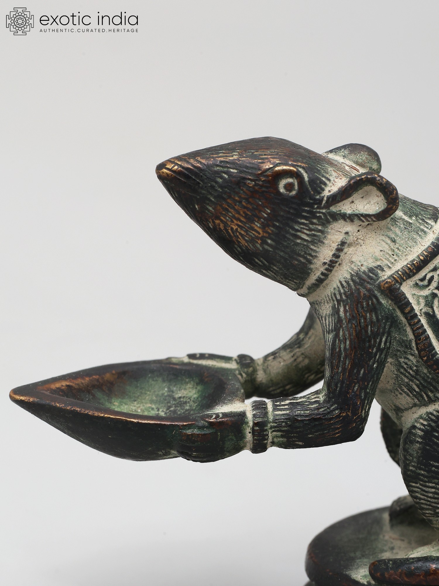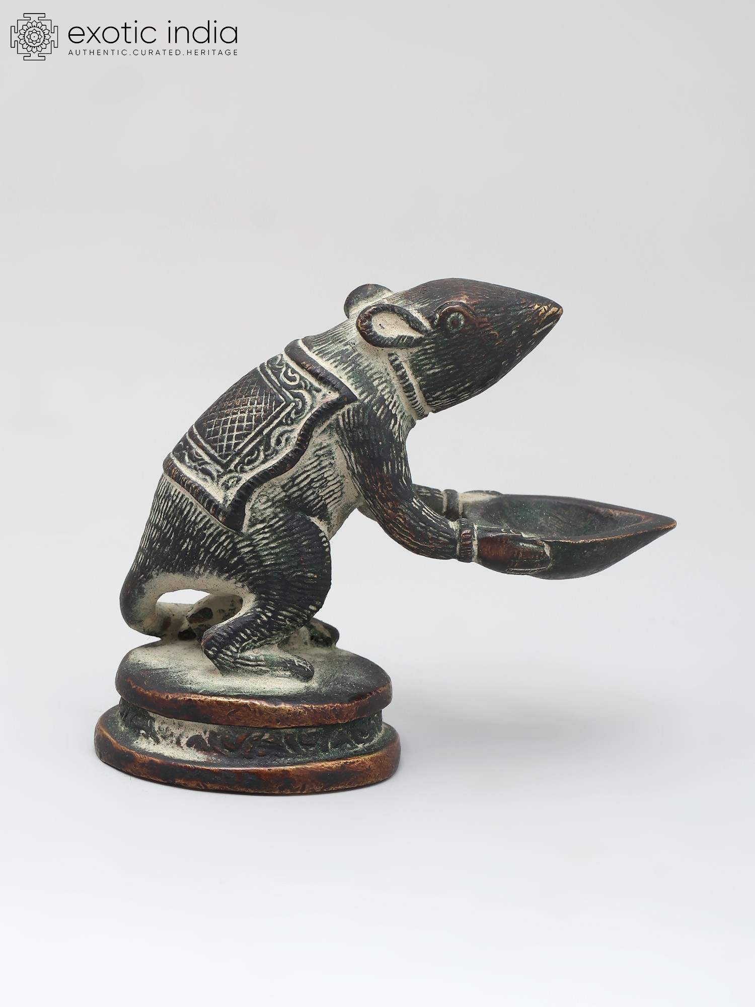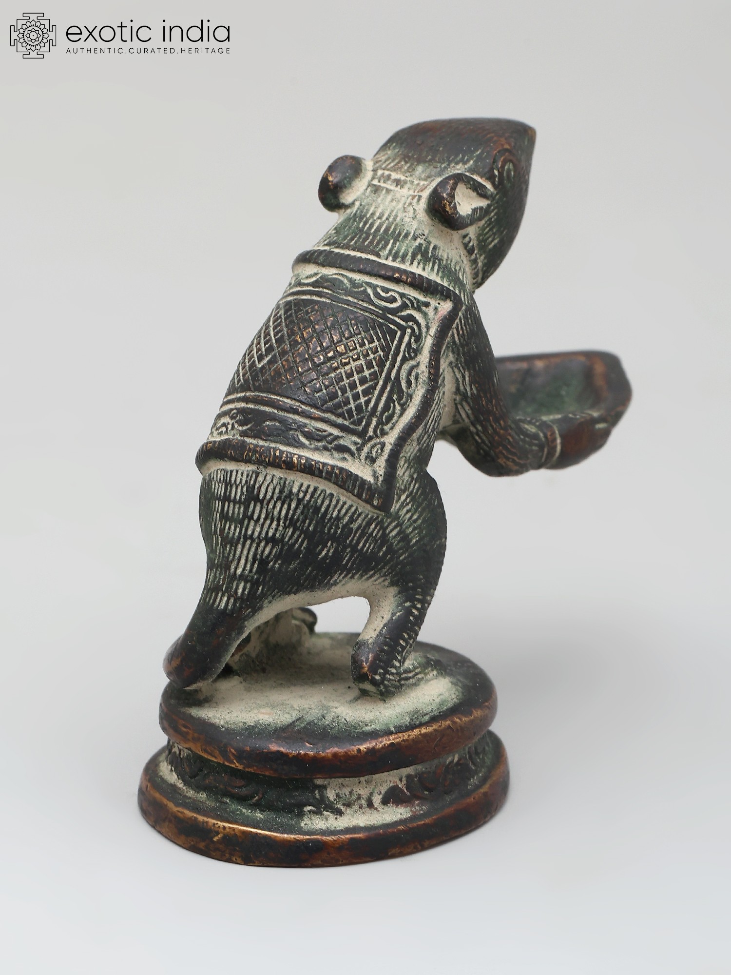 In this brass lamp, the Mooshaka, Lord Ganesha's celestial chariot, is portrayed as presenting the light of the lamp to his loving Lord Ganapati. The lamp is very beautifully decorated with a patina tint giving it an antique look. It is believed that lighting this lamp brings Lord Ganapati's blessings because his carrier is pictured here.