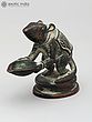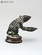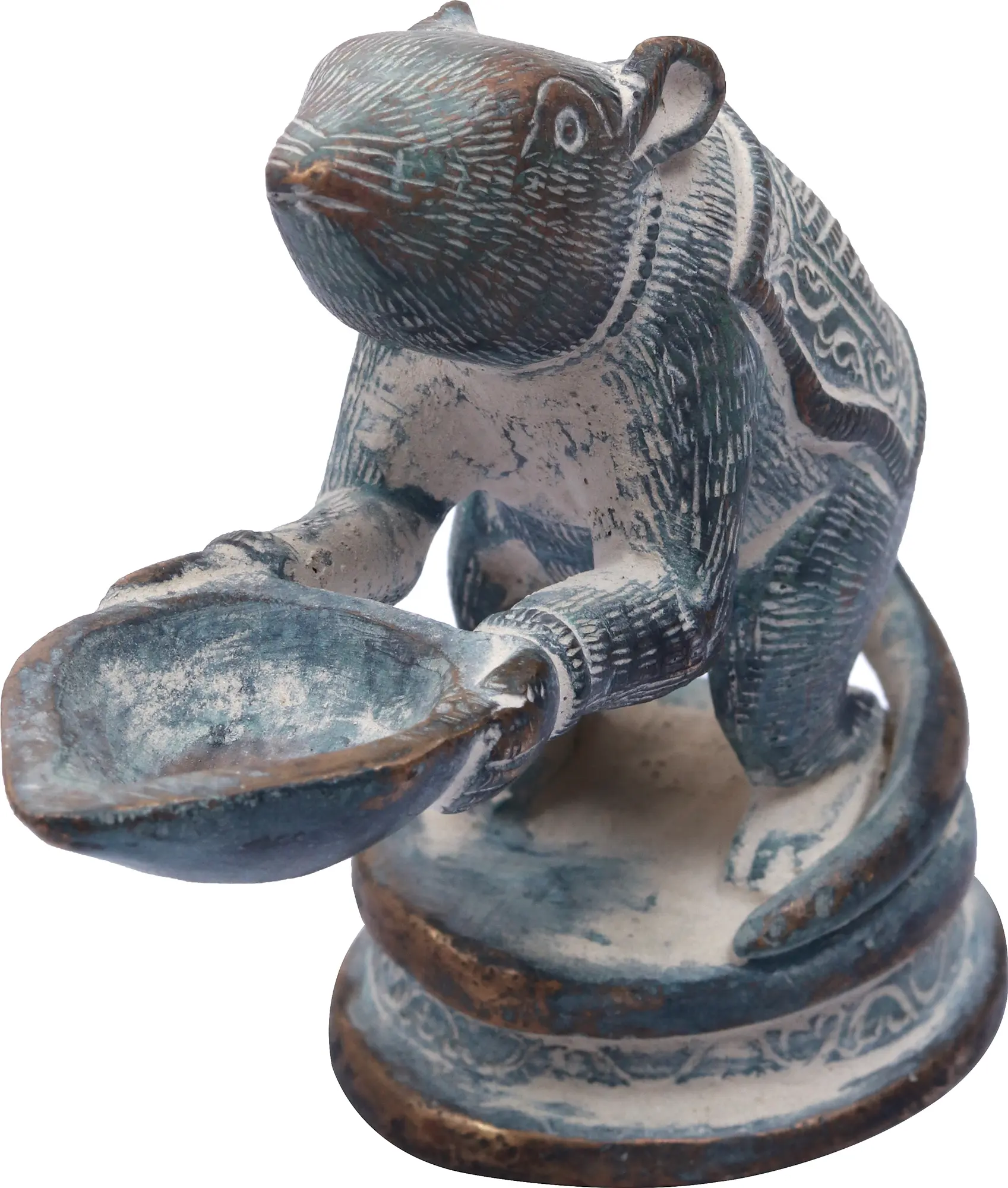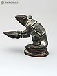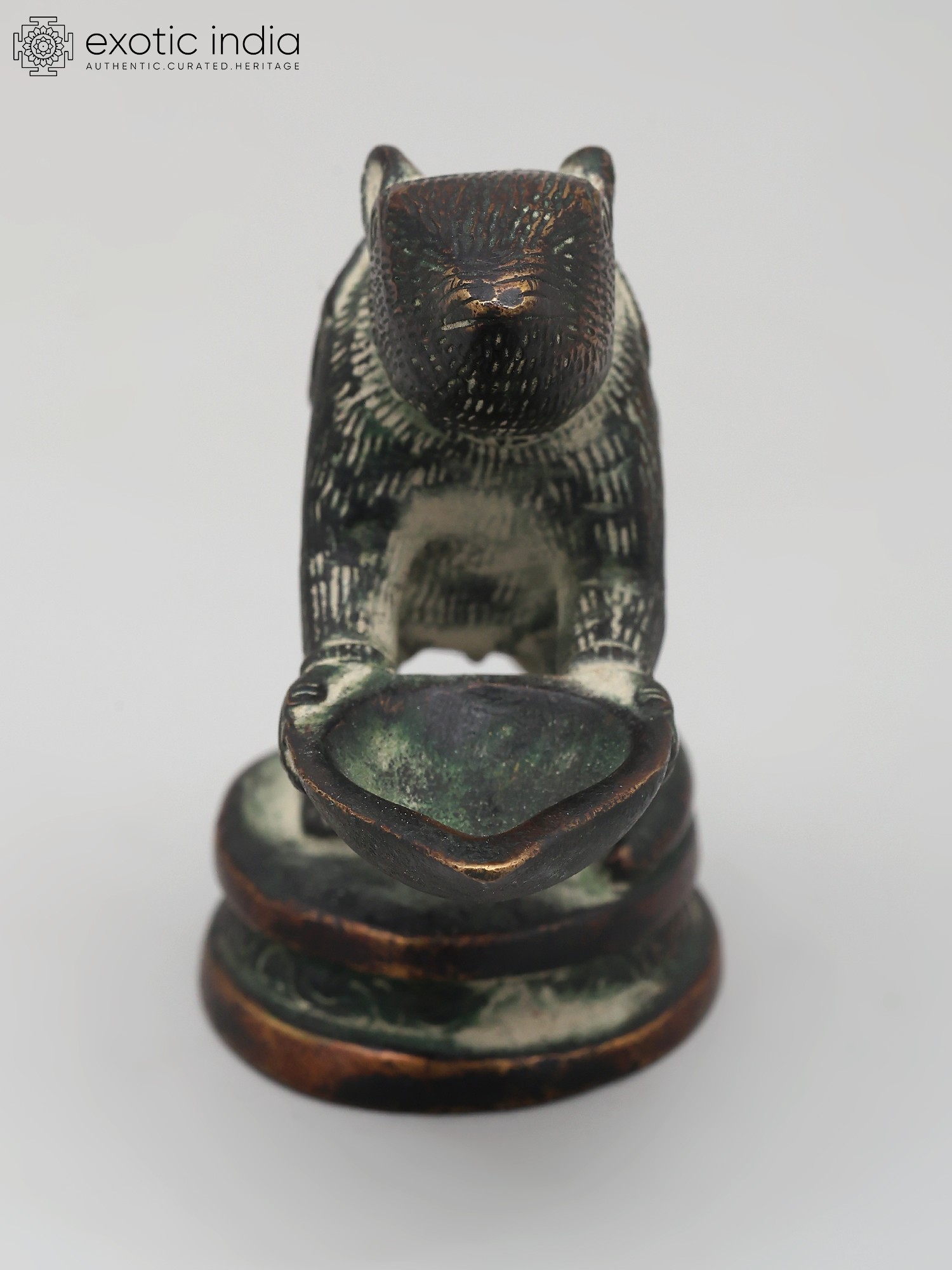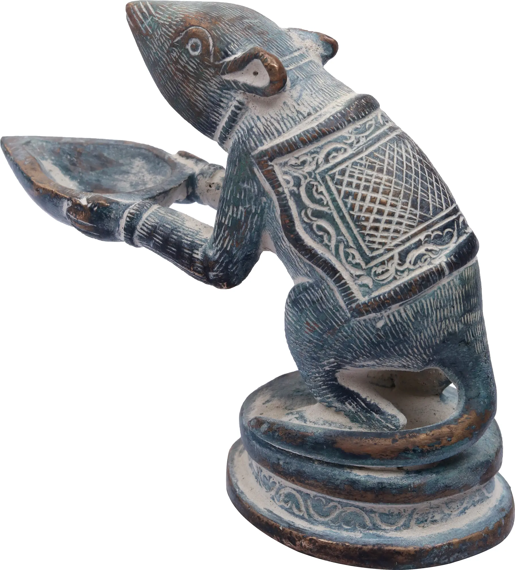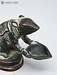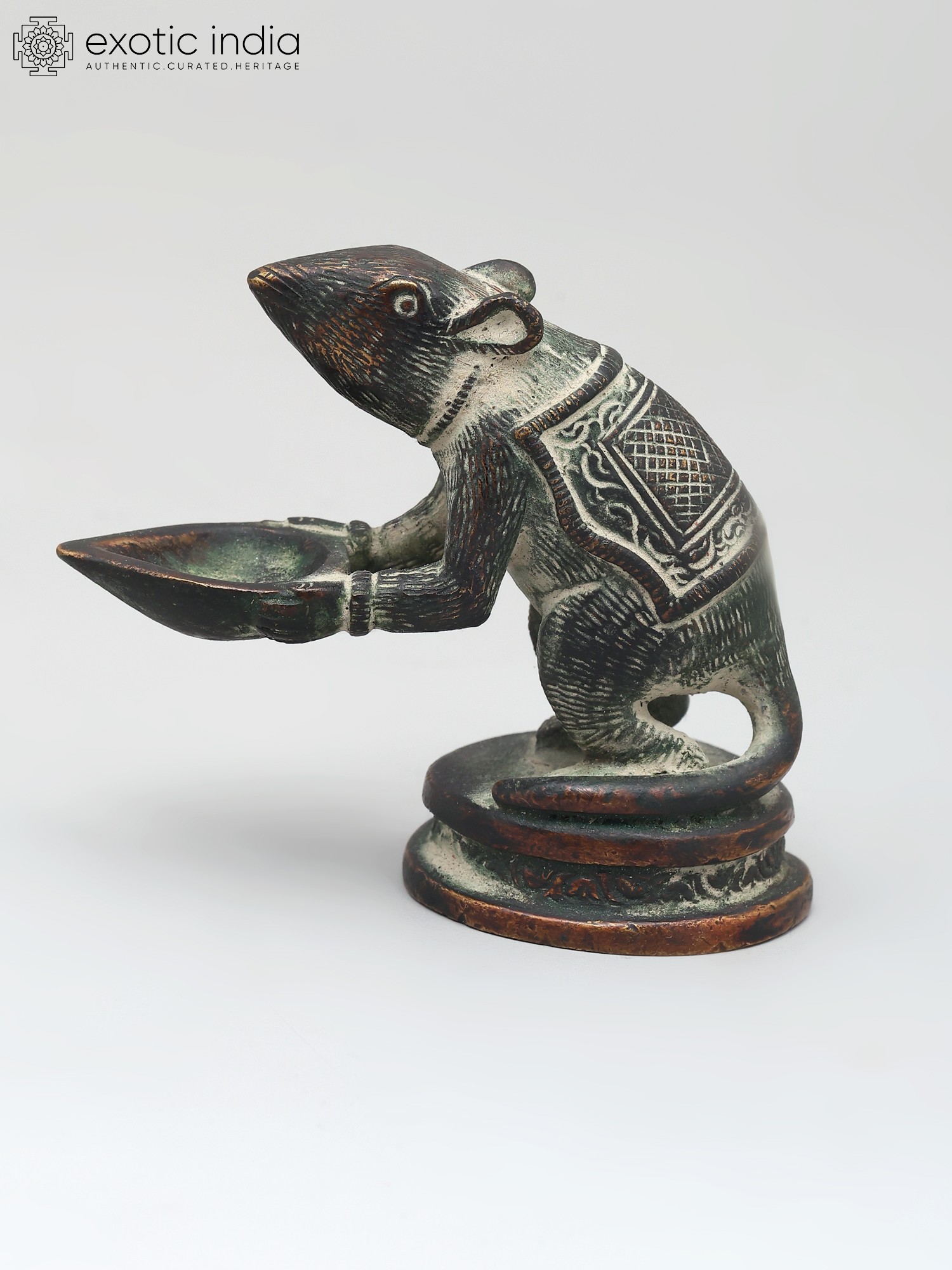 In this brass lamp, the Mooshaka, Lord Ganesha's celestial chariot, is portrayed as presenting the light of the lamp to his loving Lord Ganapati. The lamp is very beautifully decorated with a patina tint giving it an antique look. It is believed that lighting this lamp brings Lord Ganapati's blessings because his carrier is pictured here.