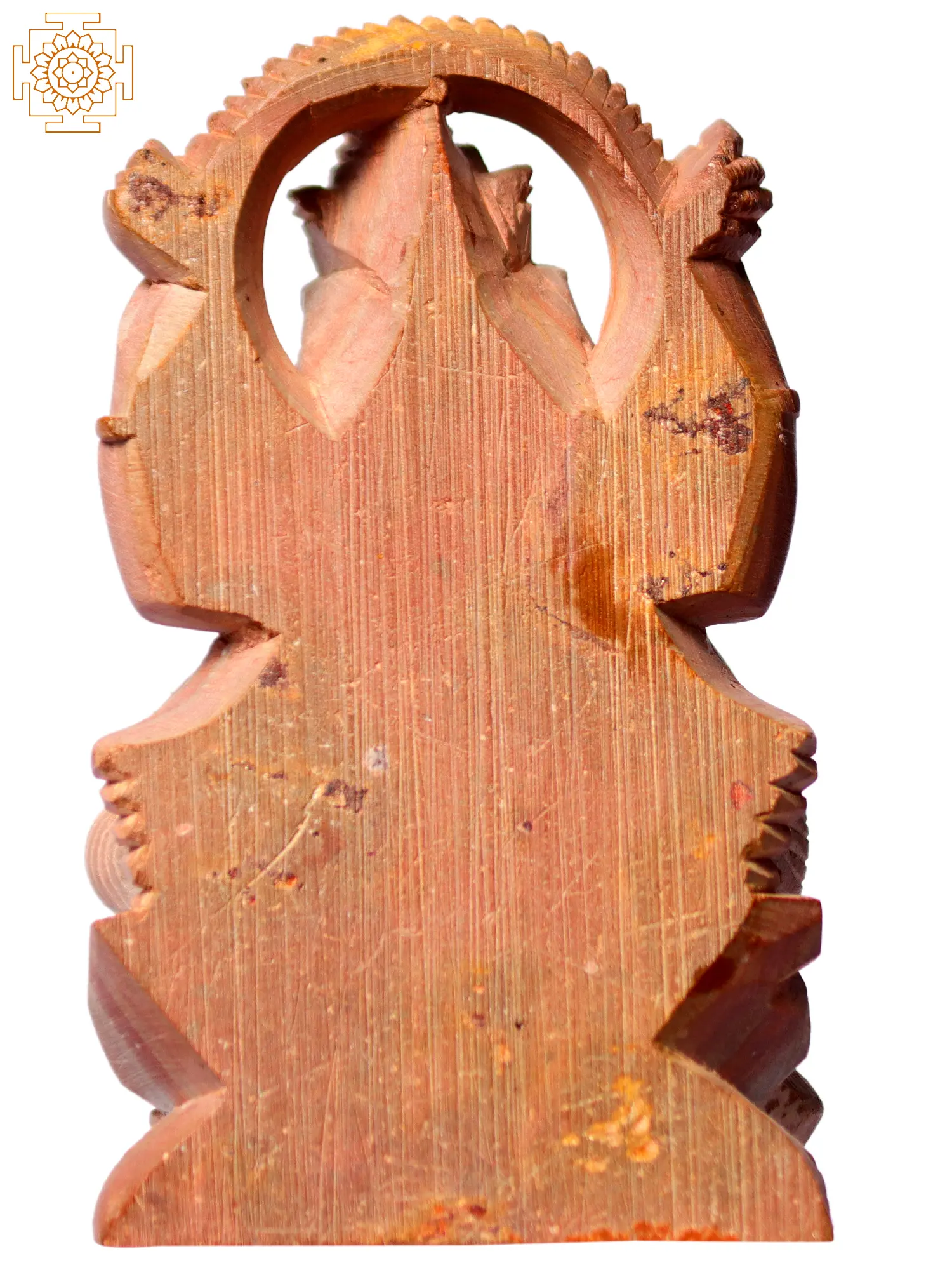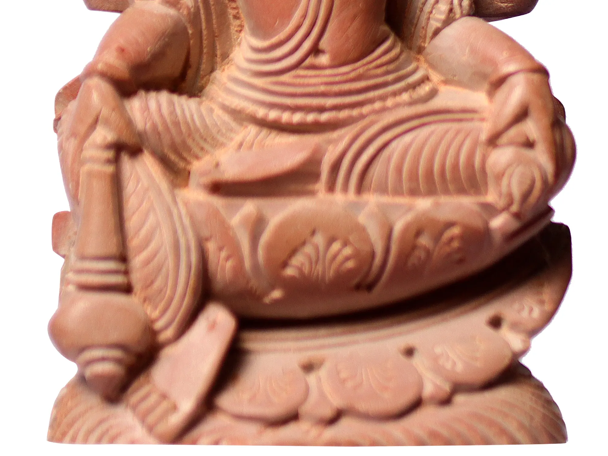 Fashioned from pink stone, the sculpture's pink hue symbolizes the gentle yet omnipotent presence of the Divine. Lord Narayana, the Cosmic Protector and Preserver, sits regally in Lalitasana (royal ease posture) on a lotus pedestal, emanating an air of tranquility and benevolence. The four arms of Lord Narayana symbolize the completeness and totality of his divine power, teaching us that the pursuit of spiritual enlightenment involves the harmonious integration of all aspects of ourselves. We too possess the inherent potential for strength, wisdom, creativity, and purity—qualities that can be harnessed to navigate life's complexities with grace and compassion.