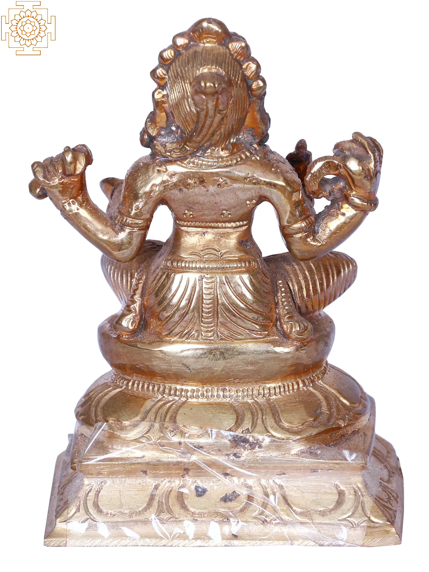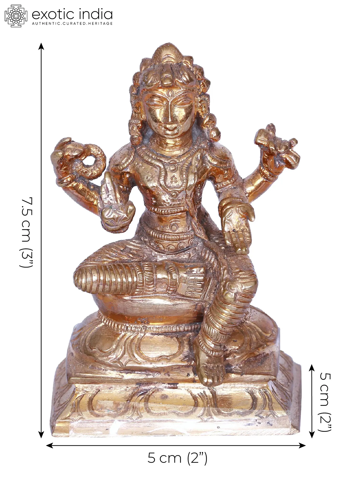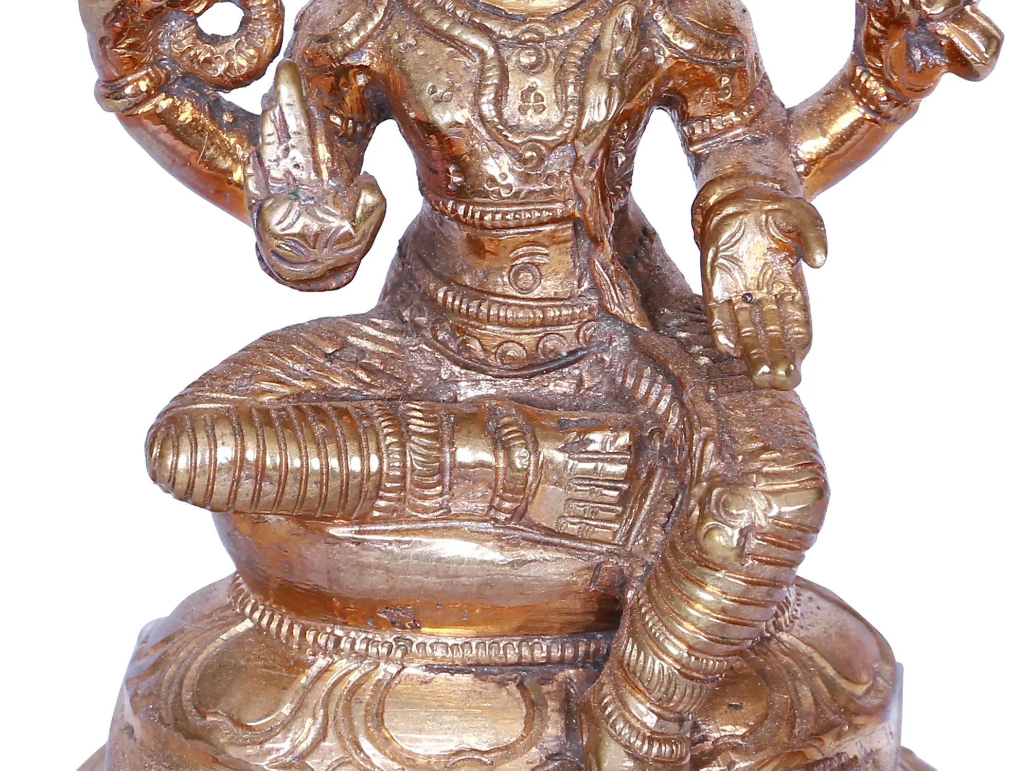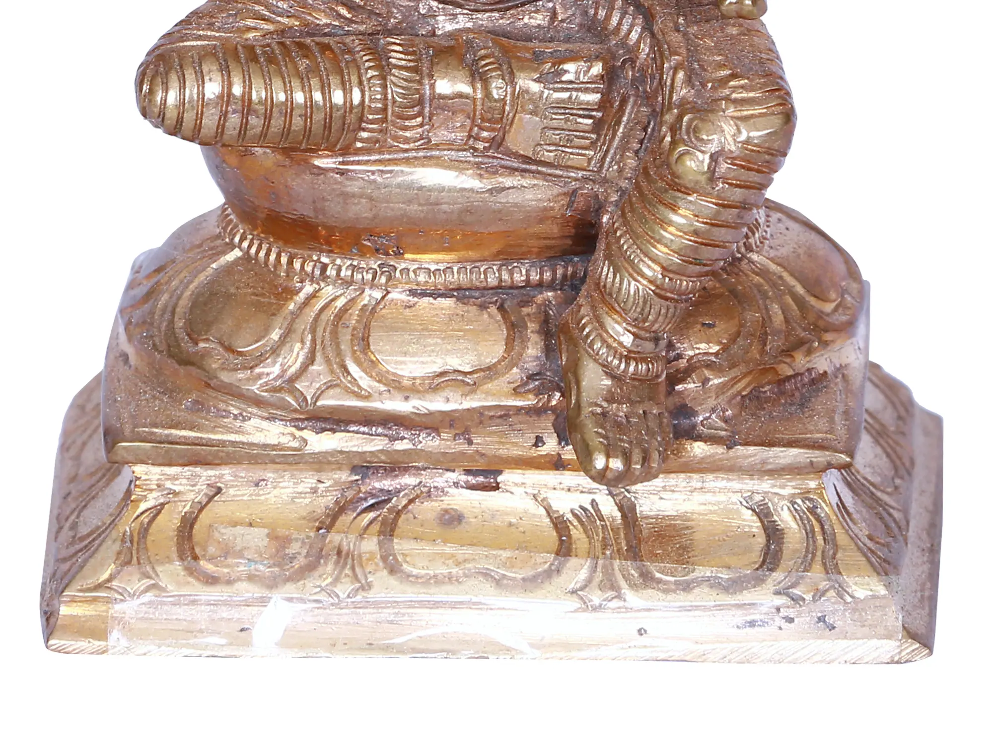 Enthroned upon a lotus pedestal, “Goddess Balambika” presides as the ethereal embodiment of wisdom and the guardian of innocence. A divine tapestry unfolds as she cradles a japmala and sacred texts in her upper hands, symbols of spiritual illumination. Her right hand extends in “Abhaya Mudra”, “a gesture of fearlessness”, while her lower hand gracefully forms “Varada Mudra”, offering blessings. Adorned in regal attire, She radiates maternal grace. Worship of this goddess promises the profound boon of knowledge and safeguards the purity of childhood. Crafted using the ancient “Madhuchista Vidhana (Lost-Wax) technique”, this celestial artwork, made from bronze, signifies the harmonious blend of enlightenment and protective, nurturing energy, weaving a mesmerising tale of divine benevolence.