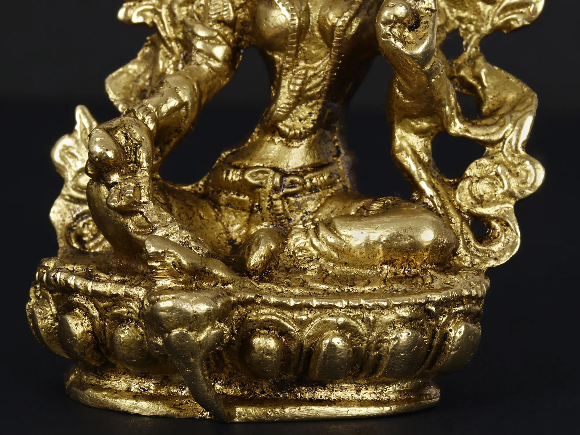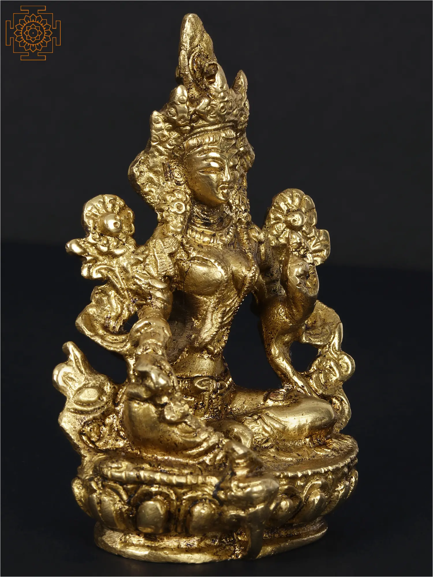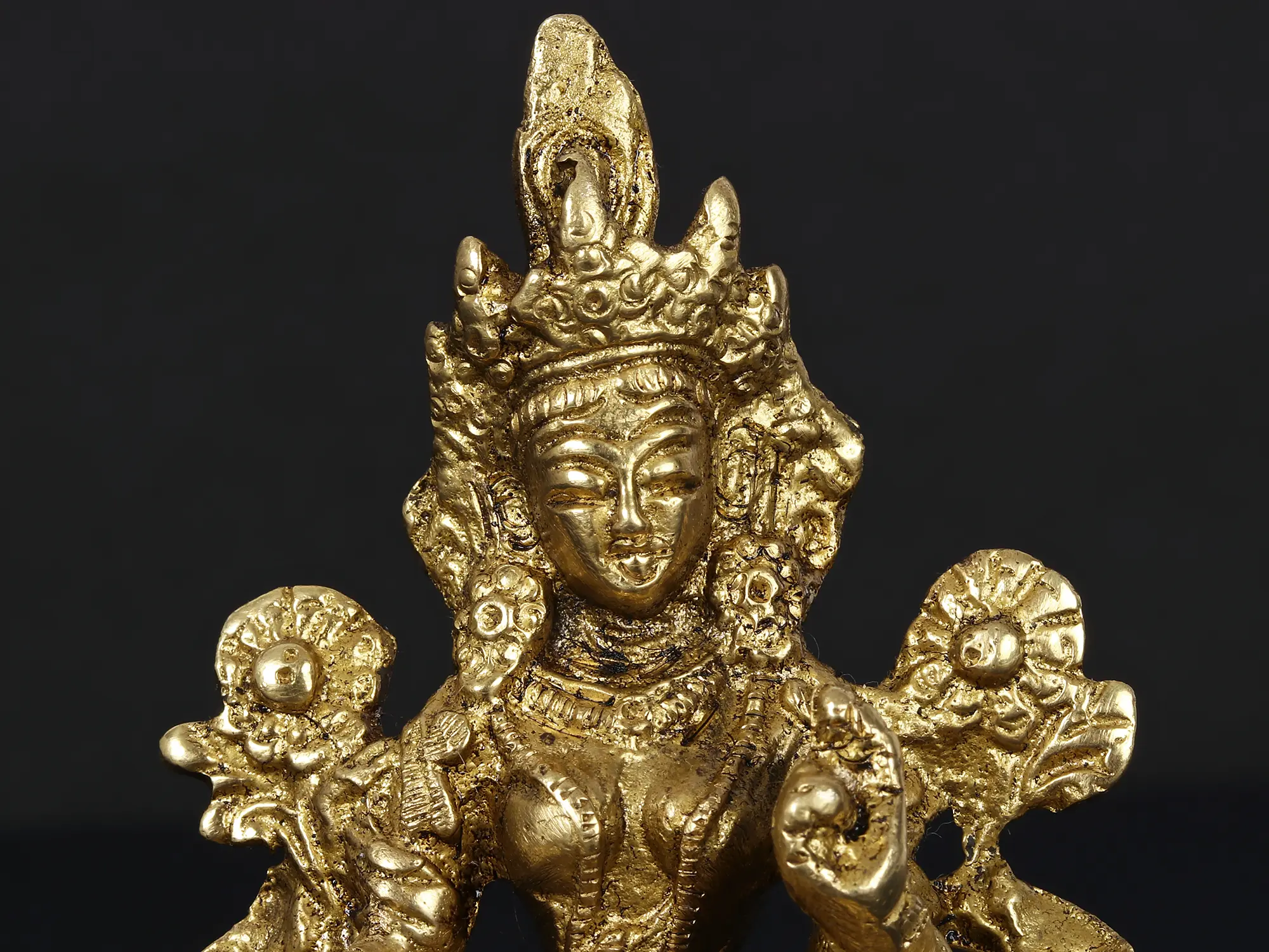 This hand-crafted brass statue of the Buddhist deity Green Tara features her as a slender female figure holding herself in a beautiful pose. A few strands of Tara's hair frame her attractive forehead, and her hair is knotted in a high-rising hairdo that is ornamented with the Buddhist five-pronged crown. Tara's figure is adorned with precious earrings and a necklace and is placed on a golden lotus seat, with her leg extending on a blooming lotus as a haven from the turbulence of existence.