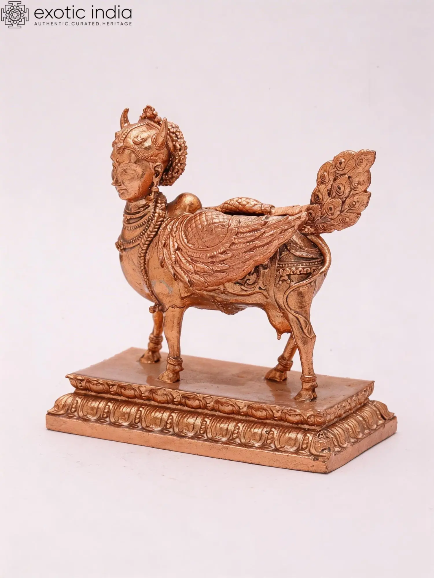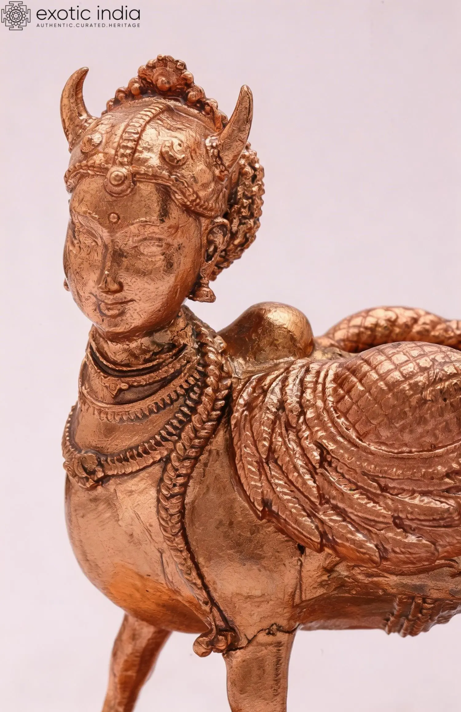 This sculpture represents the revered Kamadhenu, the celestial wish-fulfilling cow from Hindu mythology. She is the source of all prosperity, an embodiment of abundance, and a giver of boons. Her mythical form, a blend of human and bovine features with avian wings, symbolizes her omnipresence and ability to manifest desires, reflecting a deep cultural reverence for life-giving forces.