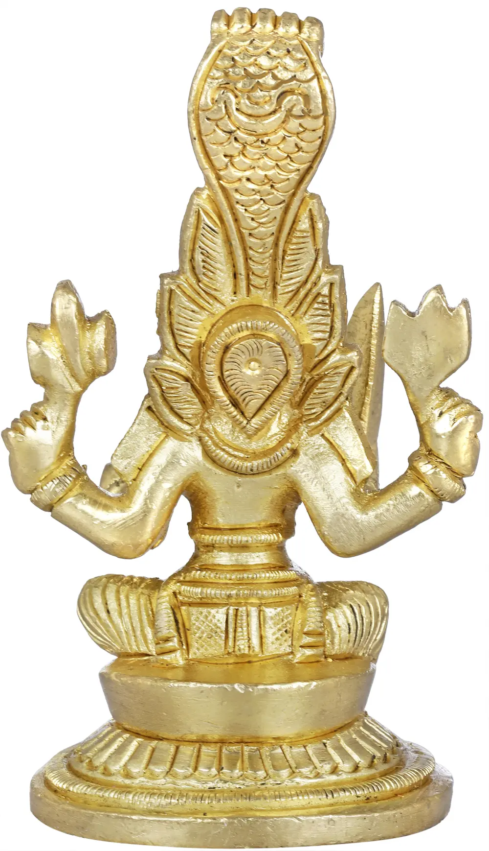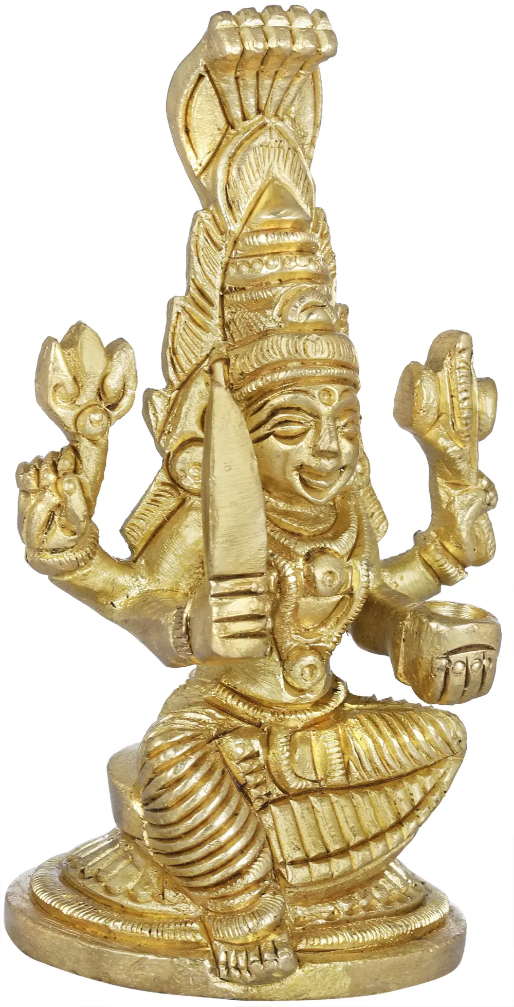 Her eyes emanate compassion and protection, while her four arms hold a Trident, a Damaru, a Sword and a healing bowl of nectar. Devotees seek her blessings to cure diseases and bring prosperity. Invite the nurturing energy and grace of Goddess Mariamman into your life with this mesmerising brass creation.