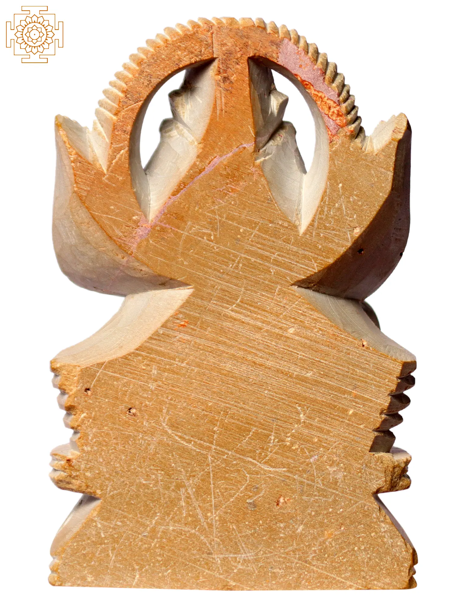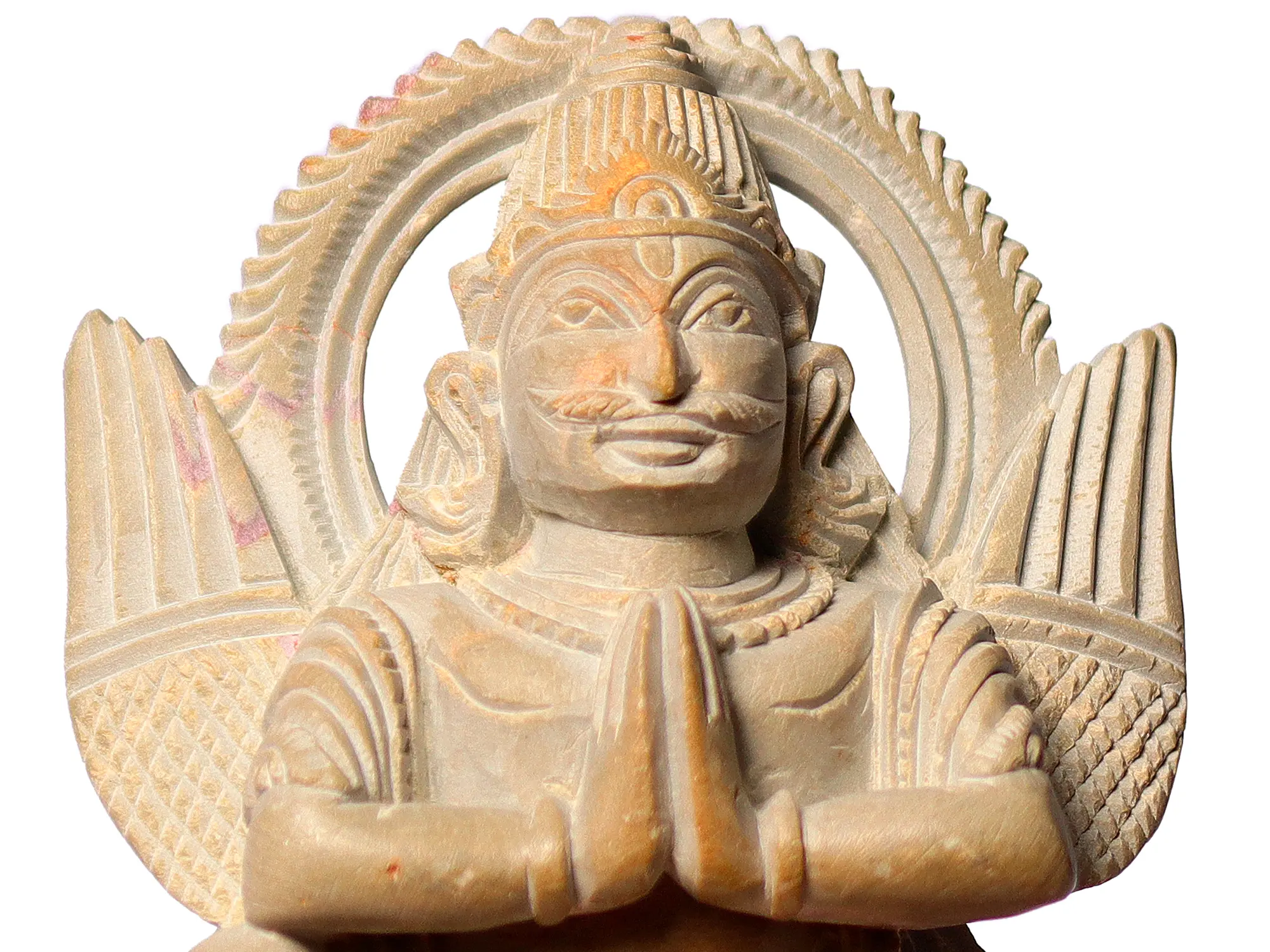 This sculpture, made in pink stone depicts Garuda adopting the Anjali Mudra, a gesture of salutation and prayer. With his hands joined together at the heart center, Garuda expresses his deep reverence and devotion towards Lord Vishnu. Garuda's presence in the Anjali Mudra serves as an embodiment of devotion and loyalty. As the divine vehicle of Lord Vishnu, Garuda's unwavering commitment and service symbolizes the essence of Bhakti Yoga – the path of loving devotion. This sculpture becomes an inspiration for seekers to cultivate unconditional love and dedication on their spiritual journey.