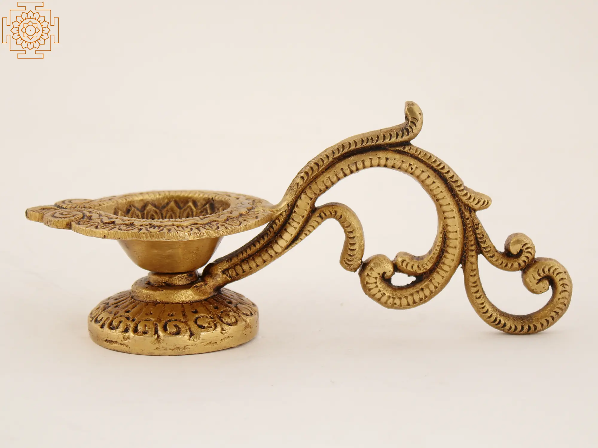 This brass lamp with a handle in the form of a coiling creeper is the manifestation of the most creative depiction of a creeper. The lamp with a single wick and a sturdy base is made of superior quality brass. It is provided with a matt golden tint to look antique. The handle and the body of the lamp are beautifully ornamented and look stunning. This lamp is a beautiful ritual object and an exquisite lighting option.