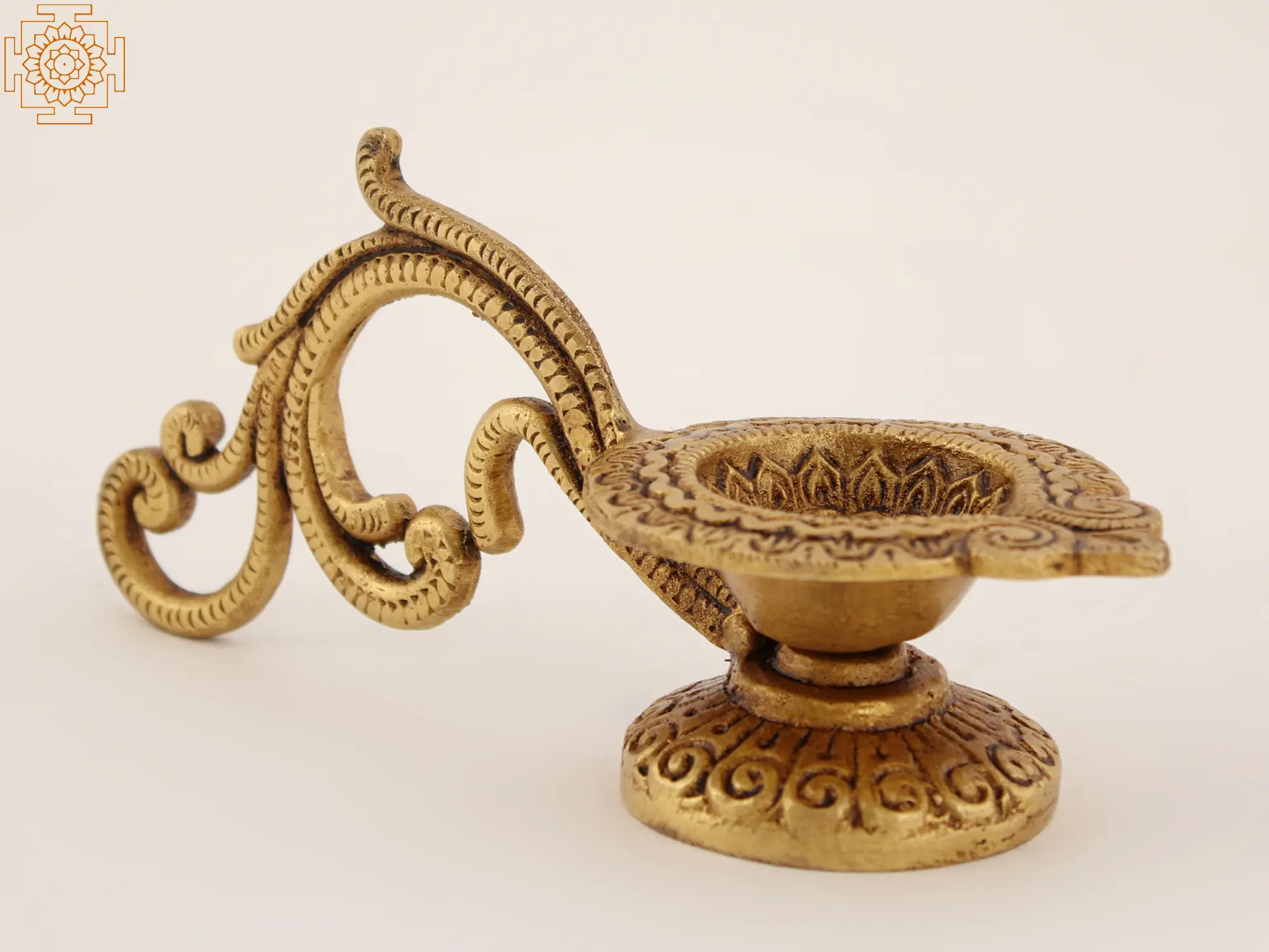Crafted from high-quality brass, this lamp boasts a rich, warm patina that speaks of its enduring quality. The intricate detailing on the base and around the lamp's bowl showcases skilled artistry, creating a piece that is both functional and a work of art. The decorative handle, elegantly curved and textured, not only adds to its aesthetic appeal but also allows for ease of use during Pooja, enabling you to place or move the lamp with grace and reverence. The design echoes the flowing forms found in ancient Indian temple architecture, evoking a sense of spiritual grandeur.