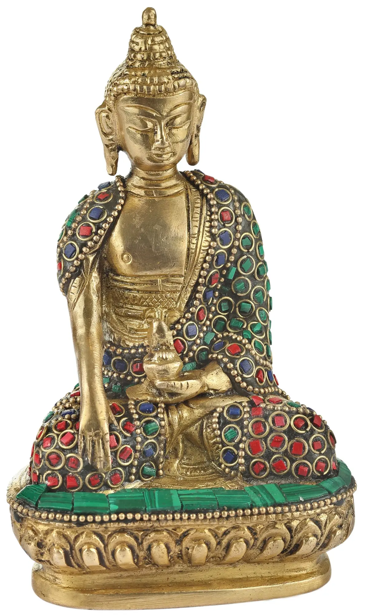 This brass statue depicts “Siddhartha Gautama”, in the “calling the earth to witness” gesture (Bhumisparsha Mudra). With his right hand touching the ground, Buddha sought affirmation from the earth as a witness to his attainment of enlightenment. This pose symbolizes steadfastness and overcoming the temptations and obstacles posed by Demon Mara, the demon of illusion and ignorance. This depiction encapsulates the essence of Siddhartha’s transformation into the Awakened One, connecting with the earth as his witness. Adorned with intricate inlay work, this spectacular artwork embodies his unwavering determination and the profound wisdom, inspiring seekers of truth and liberation.