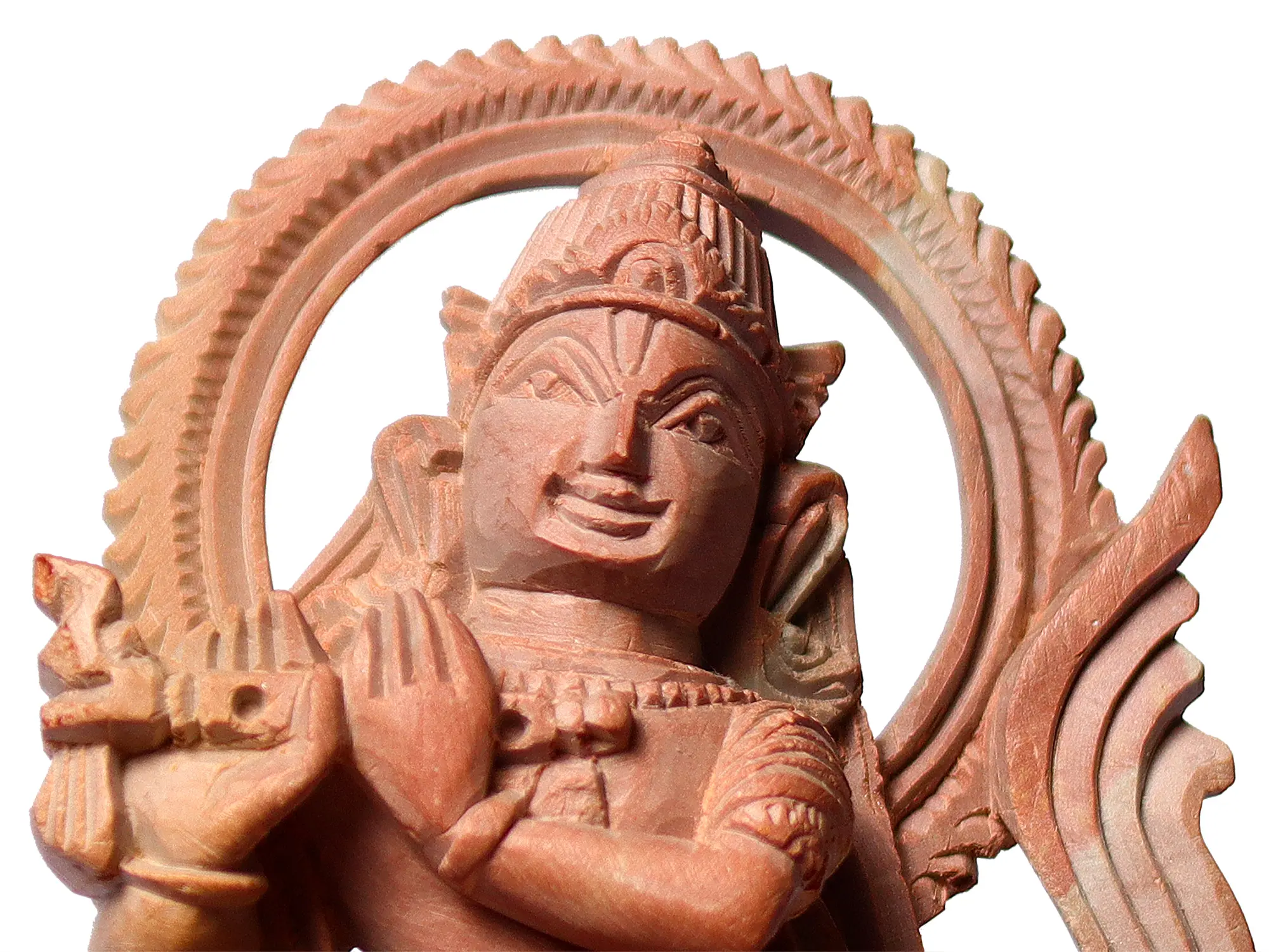 In Hindu mythology, Lord Krishna's flute is not merely an instrument but a conduit of divine bliss. The melodies emanating from his bansuri are said to enchant all beings, from the gopis of Vrindavan to the very trees and rivers. His music represents the call of the divine, beckoning souls towards spiritual awakening and selfless devotion. This statue captures that essence, inviting contemplation and a connection to the transcendental. The vibrant pink hue of the stone adds a unique charm, reminiscent of the dawn's first light, symbolizing new beginnings and divine grace. ––––––––––––––––––––