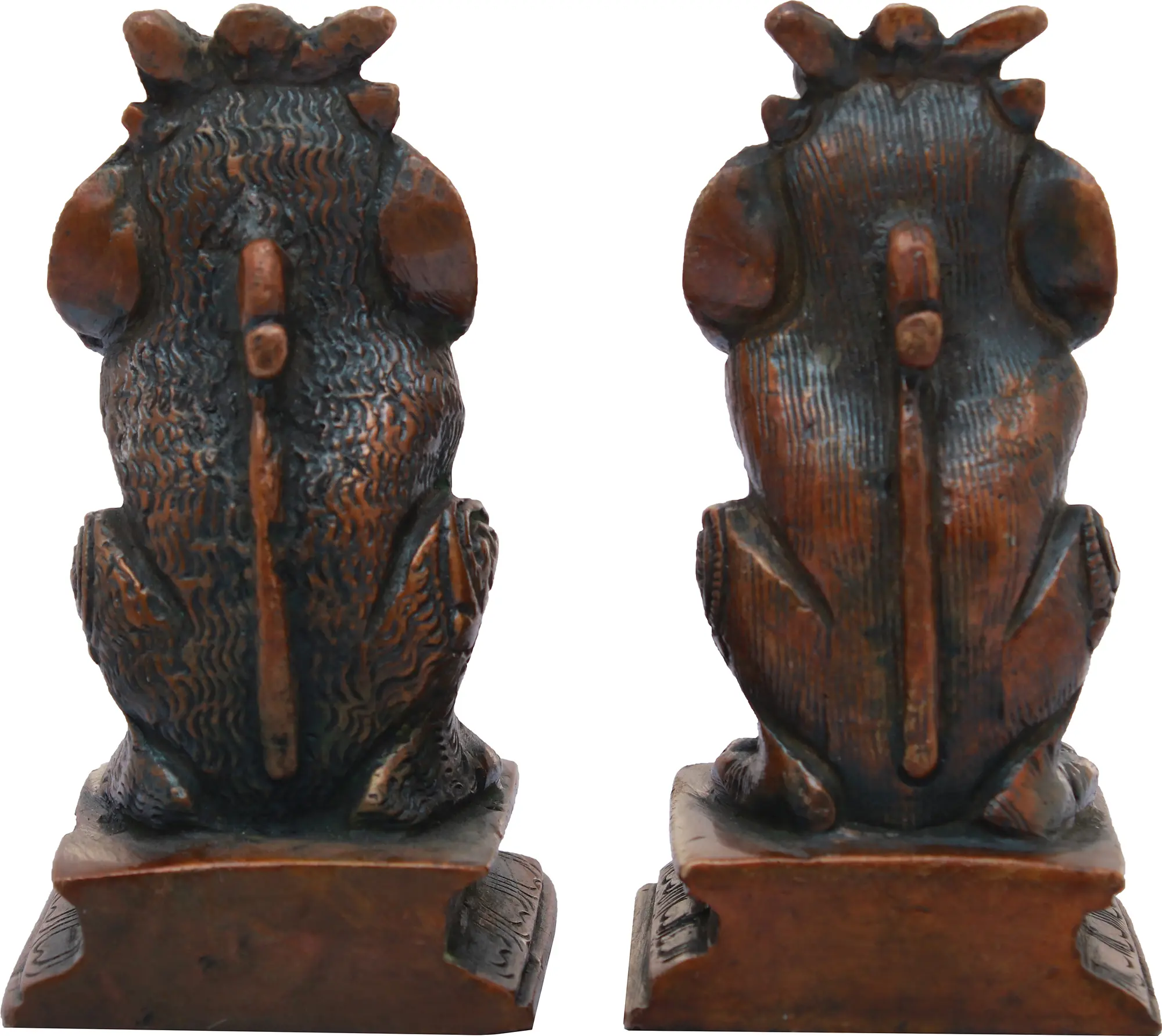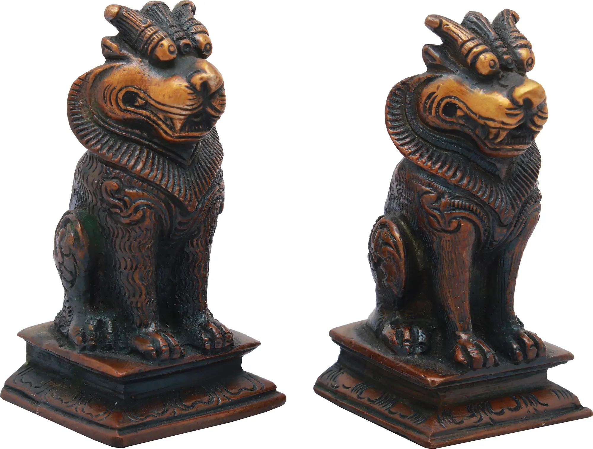 This pair of Yali, revered as temple guardians, showcases exquisite craftsmanship in brass. Their elegant and regal presence is enhanced by their distinct Double Chola color, which accentuates their intricate detailing and striking features. These mythical creatures, often seen at the entrances of temples, possess the body of a lion with the head of an elephant, symbolizing strength and wisdom. As protectors of sacred spaces, these Yali exude a sense of authority and grace. Their captivating appearance not only adds to the aesthetic charm of any setting but also imparts a sense of security and reverence. Displaying this brass pair brings an aura of tradition and spirituality to your space.