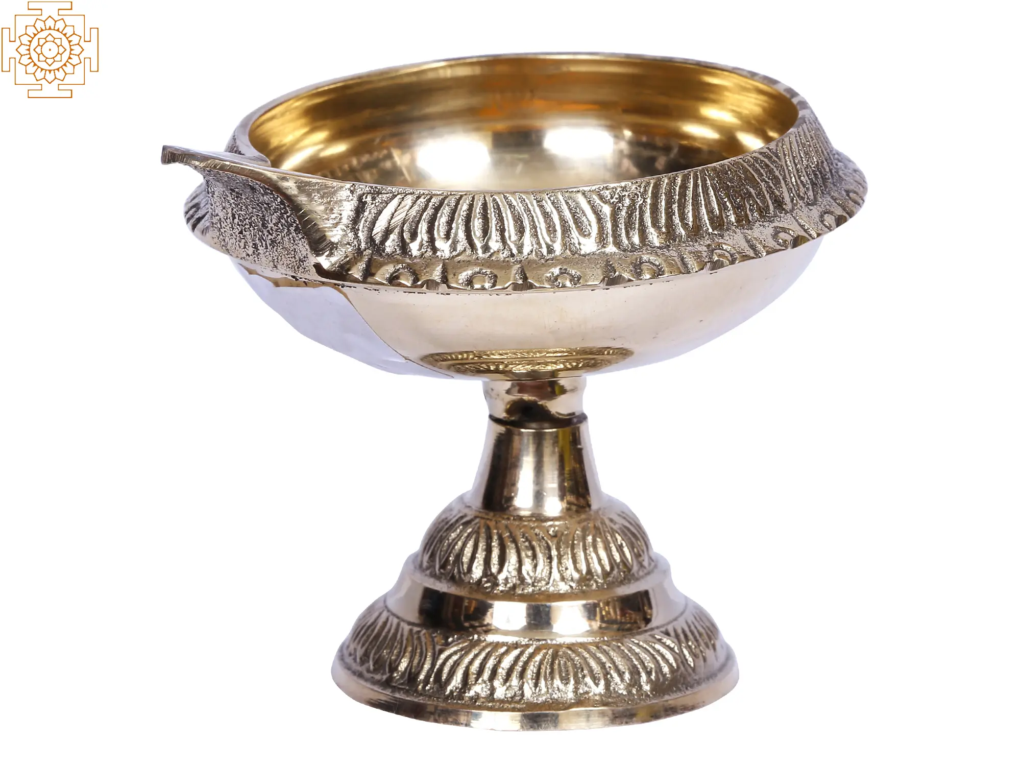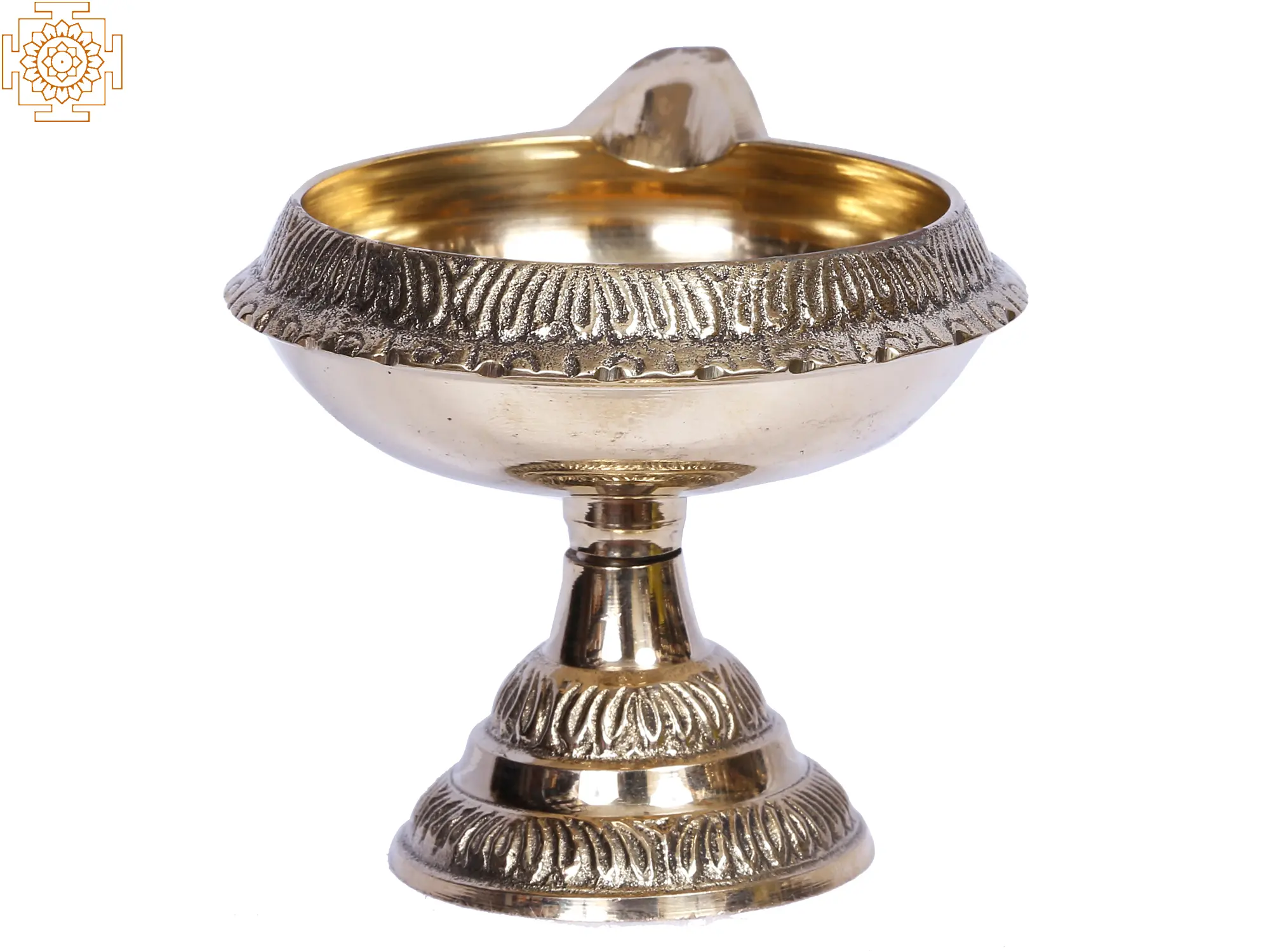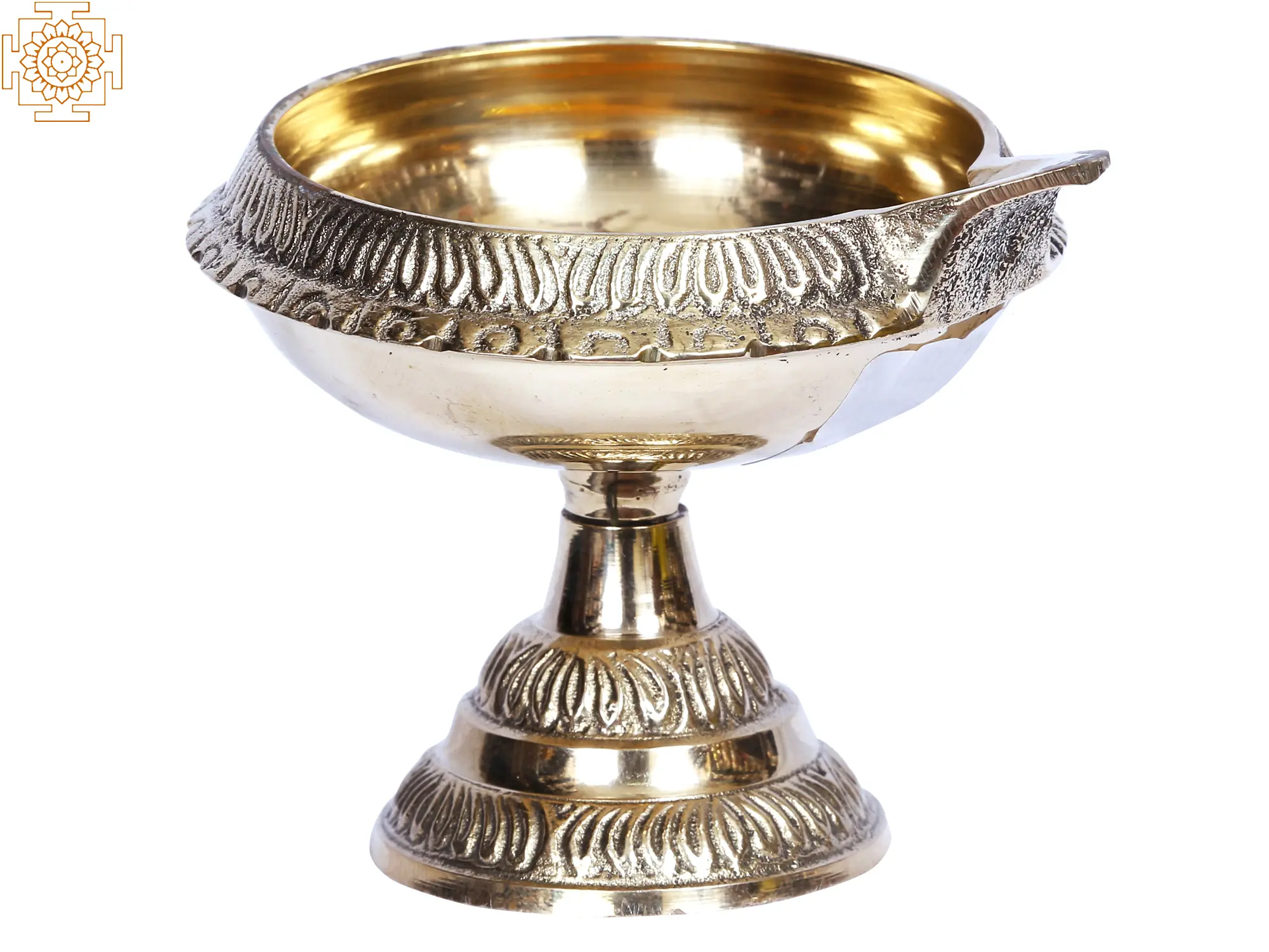 The significance of lighting a lamp twice a day in Hindu households has been passed down through centuries. It is thought that the light attracts the attention of the gods, allowing them to hear the petitions. This brass Pooja Diya is a simple yet efficient way of attracting the deities' attention. It comes with a bowl-shaped oil basin and a single wick. A robust grip with lovely carvings allows the devotee to effortlessly grab the light and perform Aarti. This lamp is one of the most popular for giving deities with the warmth of the lamp.