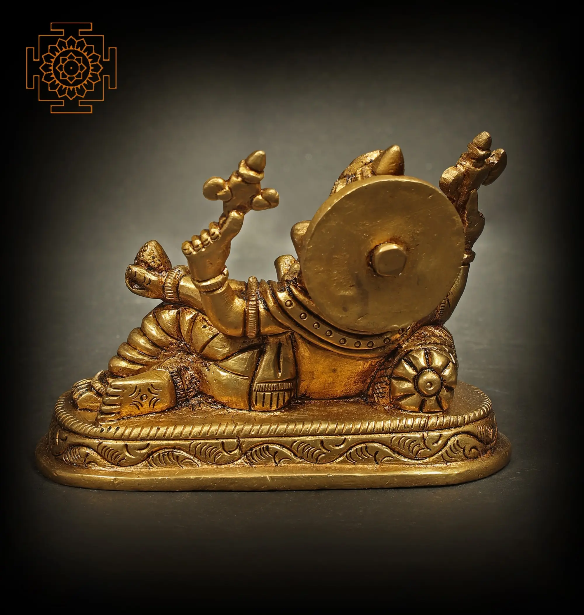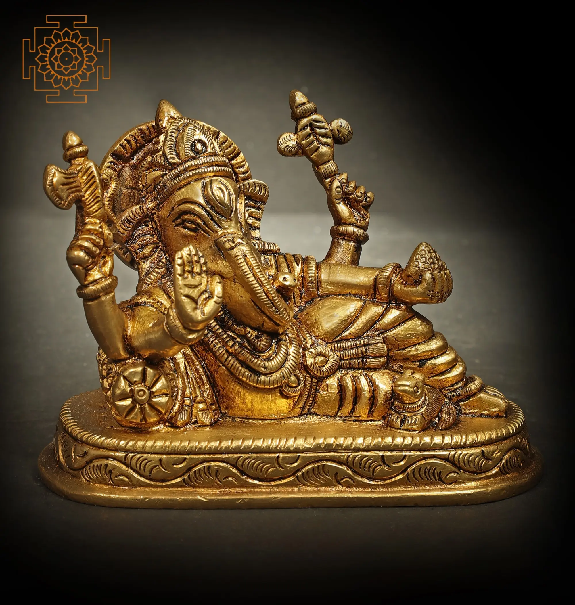 In this lovely statue, Lord Ganesha is shown in a special and calm attitude that exudes peace and joy. The minute details demonstrate the skillful workmanship and care put into its production. The brass material, which was used to create the statue with care and accuracy, gives it a shiny, classic look. This artwork depicts Lord Ganesha, the destroyer of barriers and the bringer of good fortune, in a way that makes it the ideal addition to any home, workplace, or religious area. Embrace Lord Ganesha's heavenly energies and blessings with this wonderful brass statue.