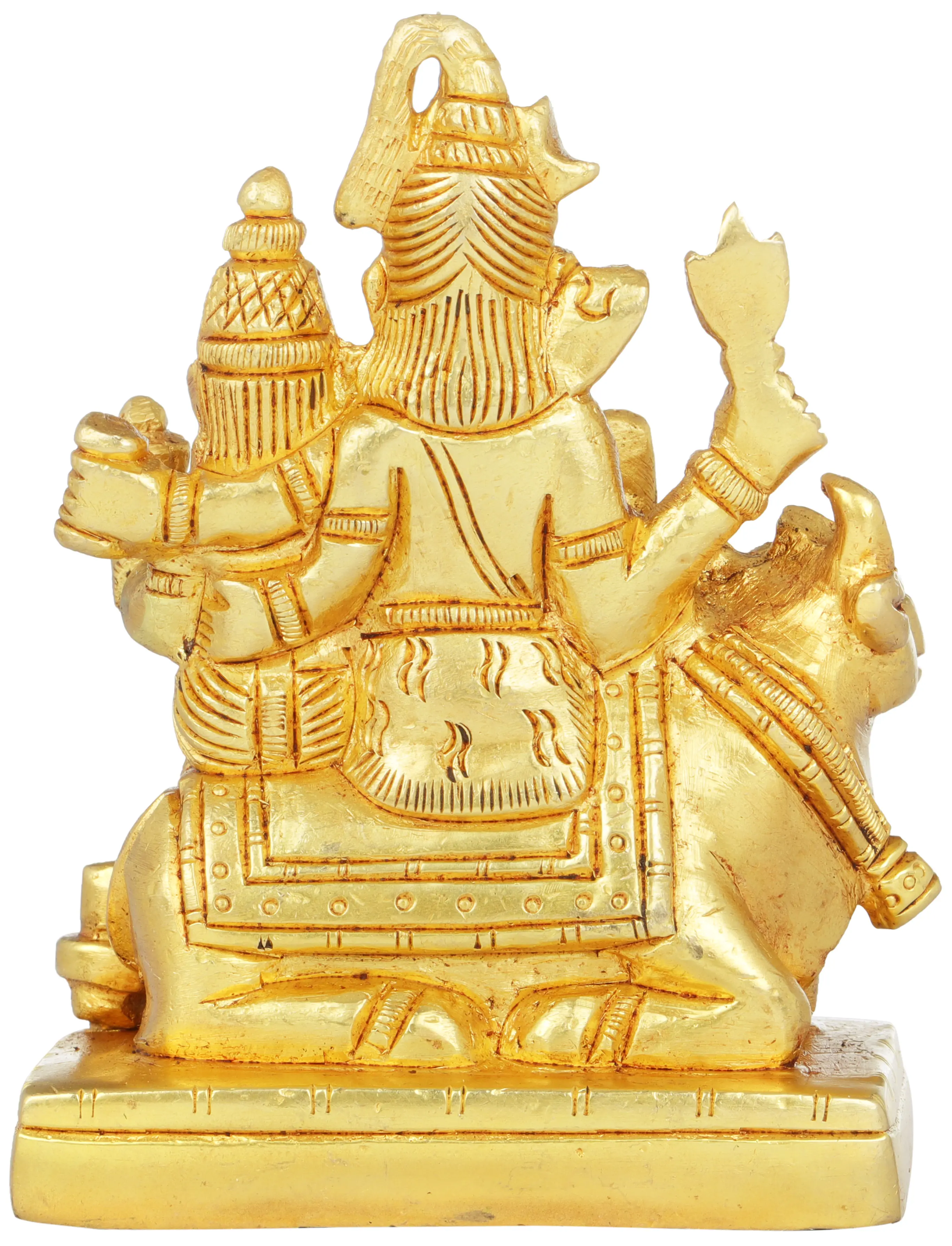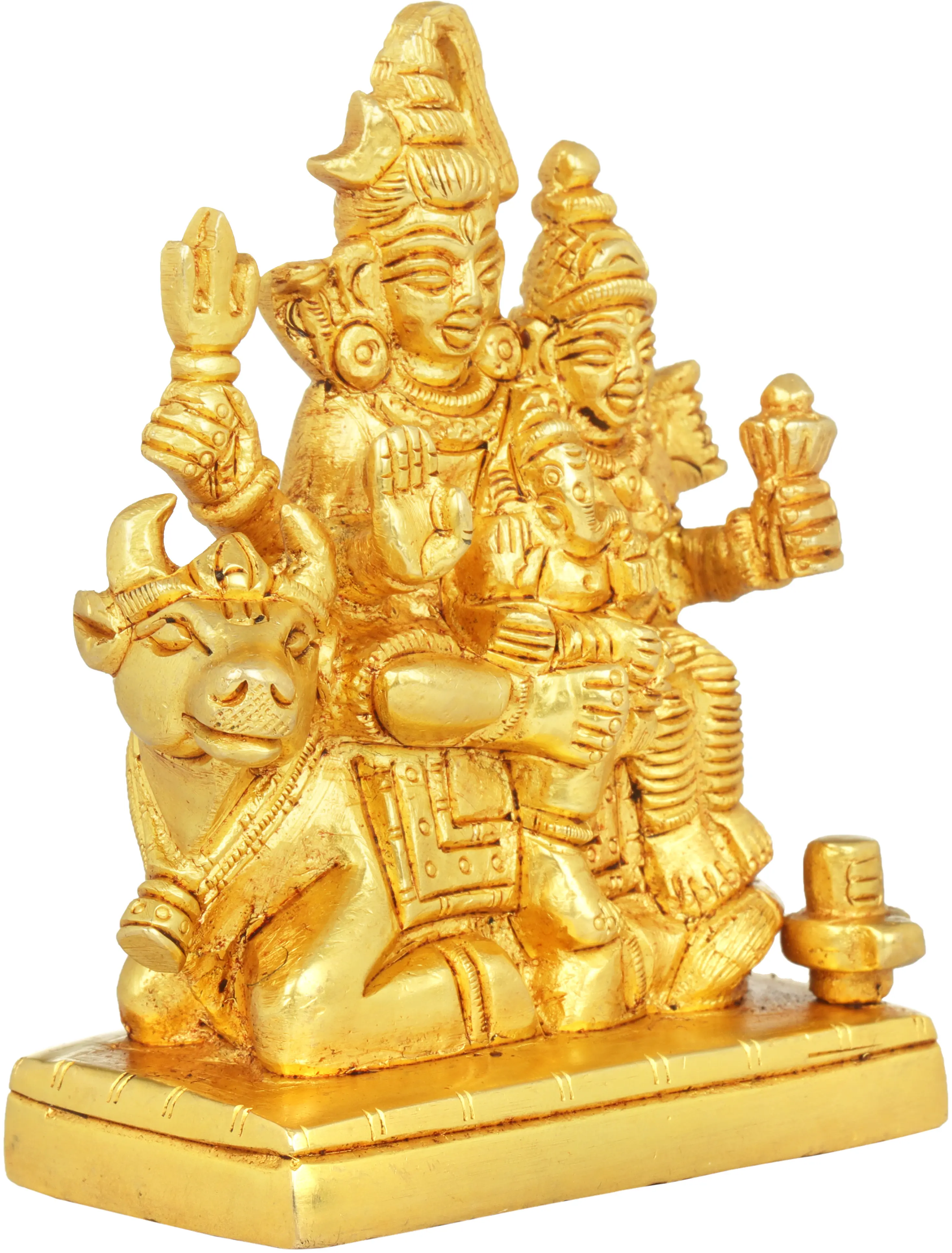 In this sacred rendition, Shiva sits majestically in Abhaya Mudra, signifying fearlessness and protection. Parvati, the embodiment of feminine energy and devotion, lovingly sits by his side. Lord Ganesha, the Remover of Obstacles, playfully rests on Shiva’s lap, symbolizing the cycle of creation and the eternal bond between father and son. The divine family is seated on Nandi, Lord Shiva’s loyal bull, representing strength and loyalty and symbolizing the importance of familial love, harmony, and balance in the universe. Made from high-quality brass, this statue exudes elegance and durability, making it a perfect addition to any sacred space.