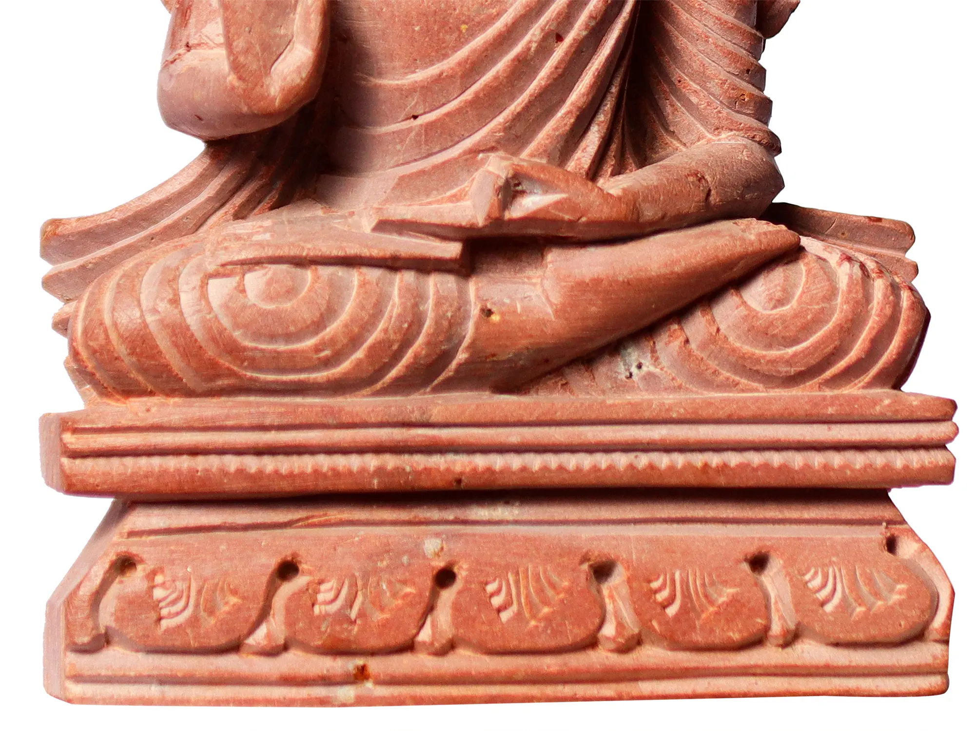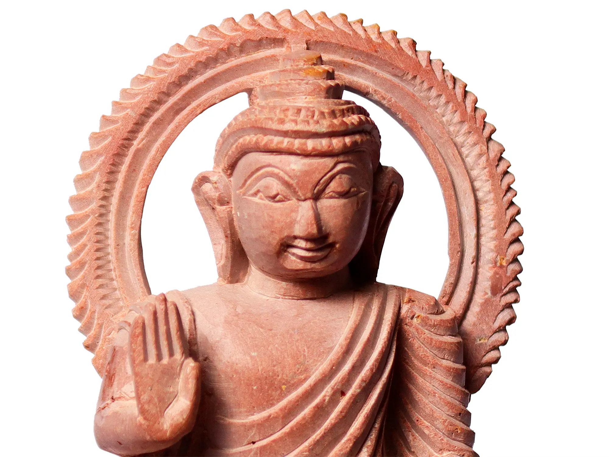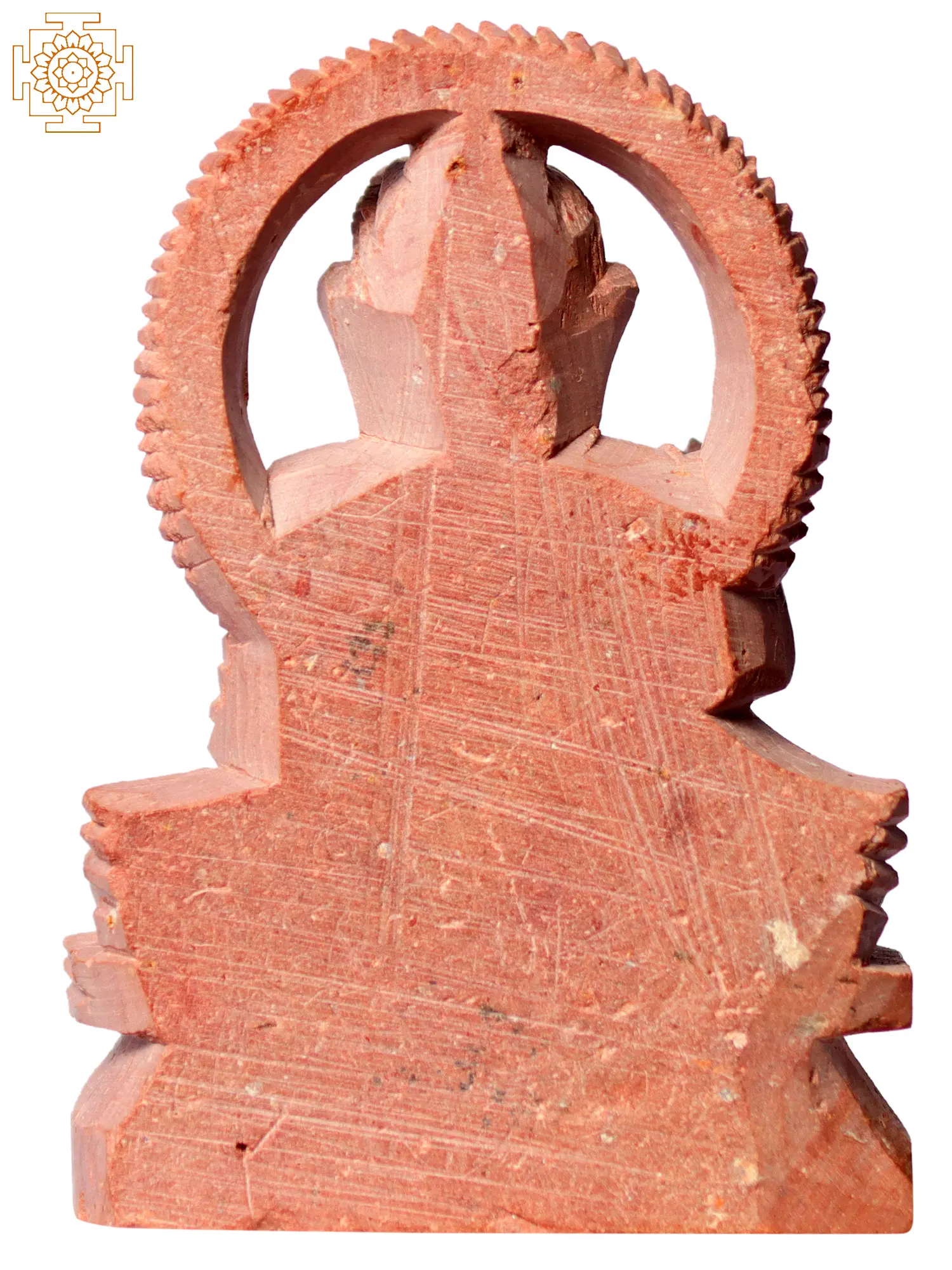 In this pink stone idol, Gautam Buddha is portrayed in Padmasana, where he sits cross-legged in perfect poise and serenity, as he grants fearlessness with Abhaya Mudra. The Lotus Pose represents the blooming of wisdom and purity even amidst the muddy waters of worldly existence. This posture reflects the embodiment of inner stillness and meditation, inspiring seekers to cultivate mindfulness and attain inner peace.