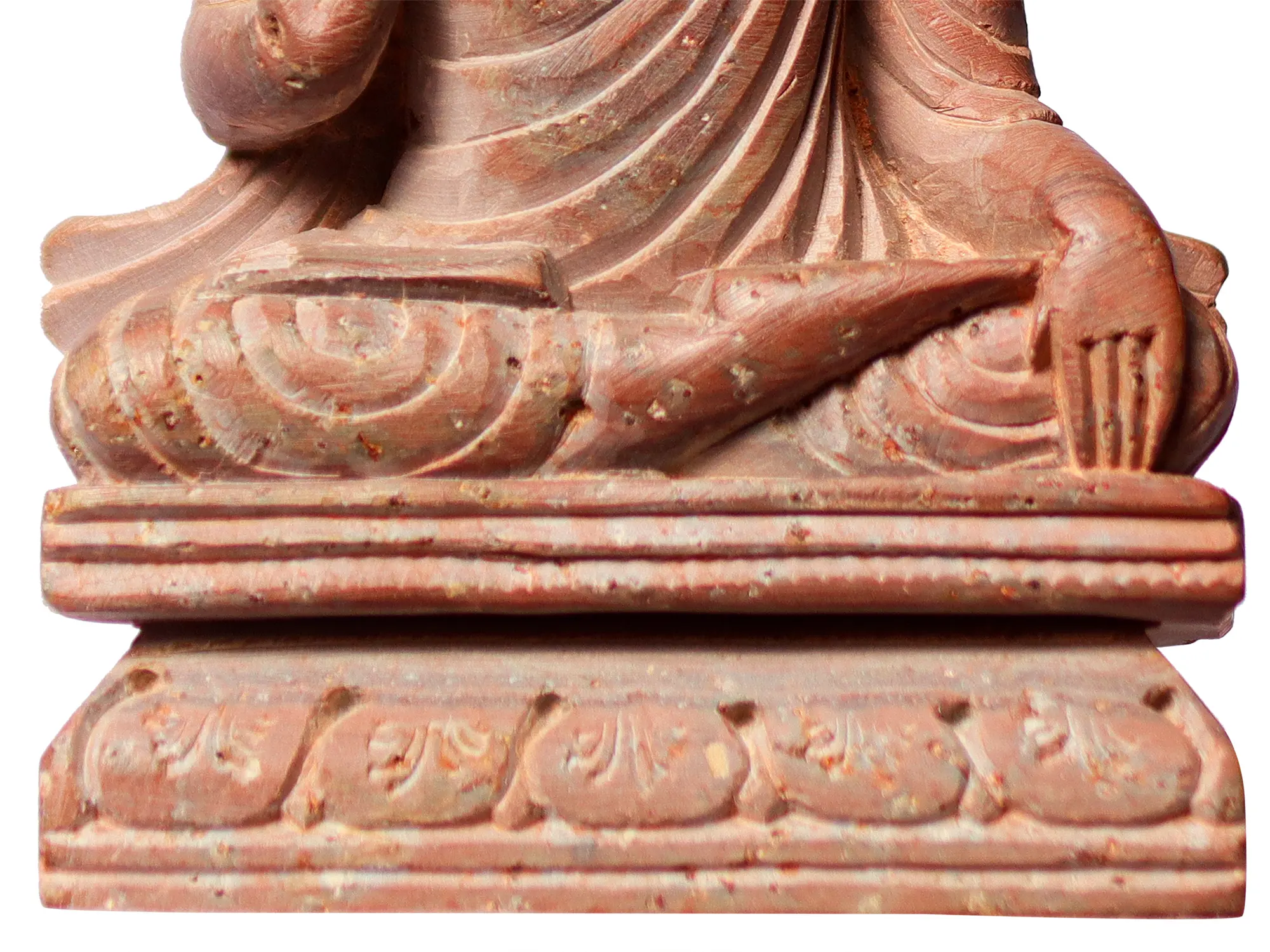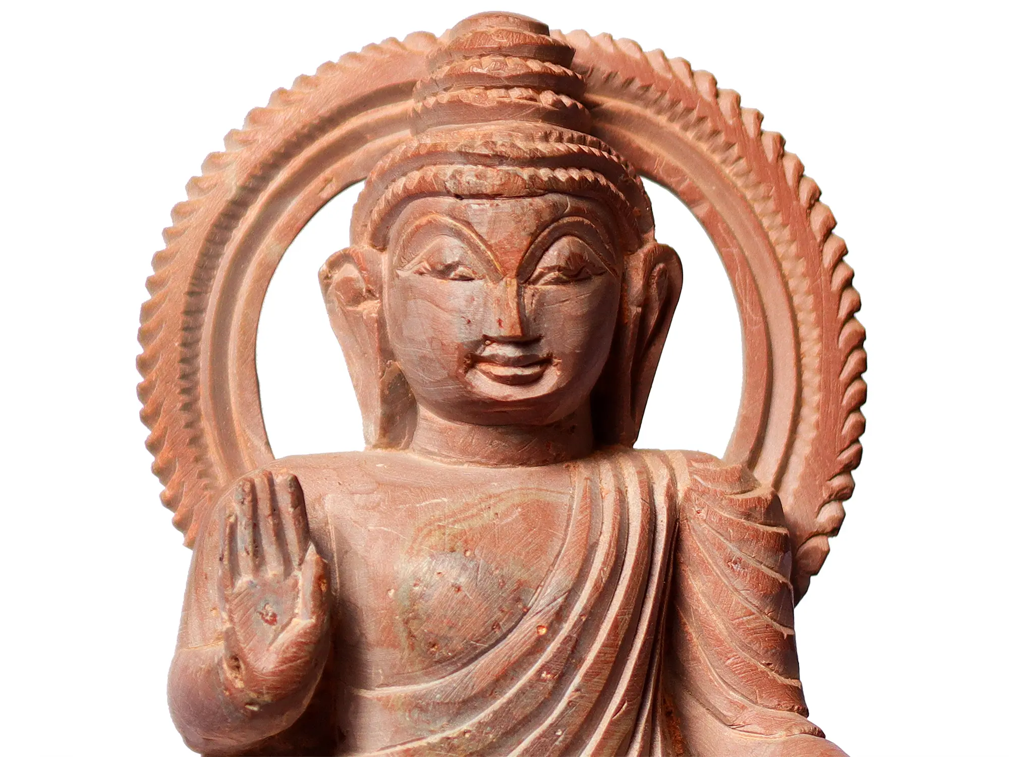 The Bhumisparsha mudra represents the pivotal moment in the Buddha's life when he attained enlightenment under the Bodhi tree - symbolizing the triumph over the temptations and illusions of the material world, as he touched the earth, bearing witness to his rightful claim to enlightenment. The Abhaya mudra, with the raised hand bestowing fearlessness, exemplifies the Buddha's role as the dispeller of fear and suffering. It signifies his readiness to offer guidance and protection to all beings who seek refuge in his teachings.