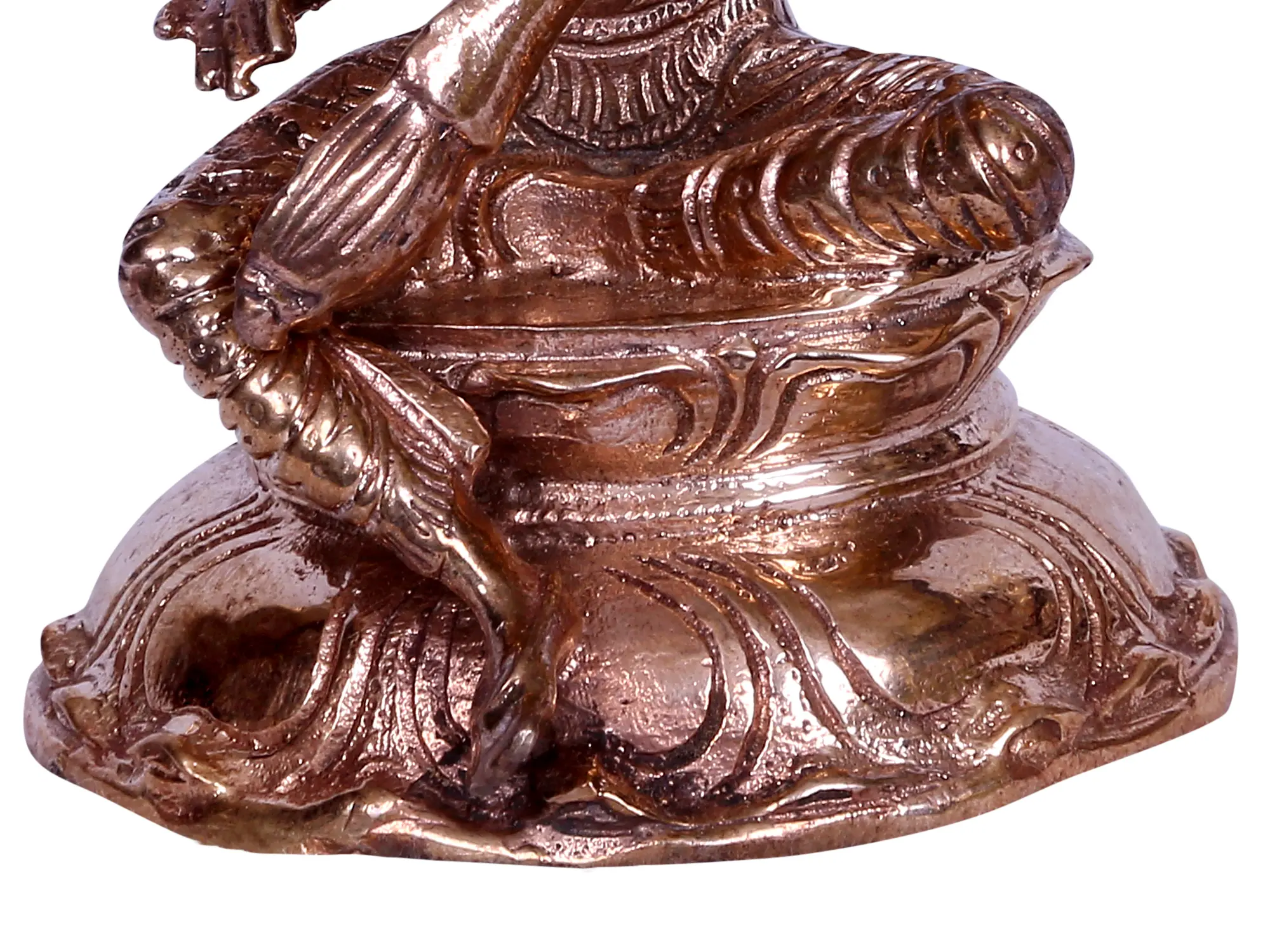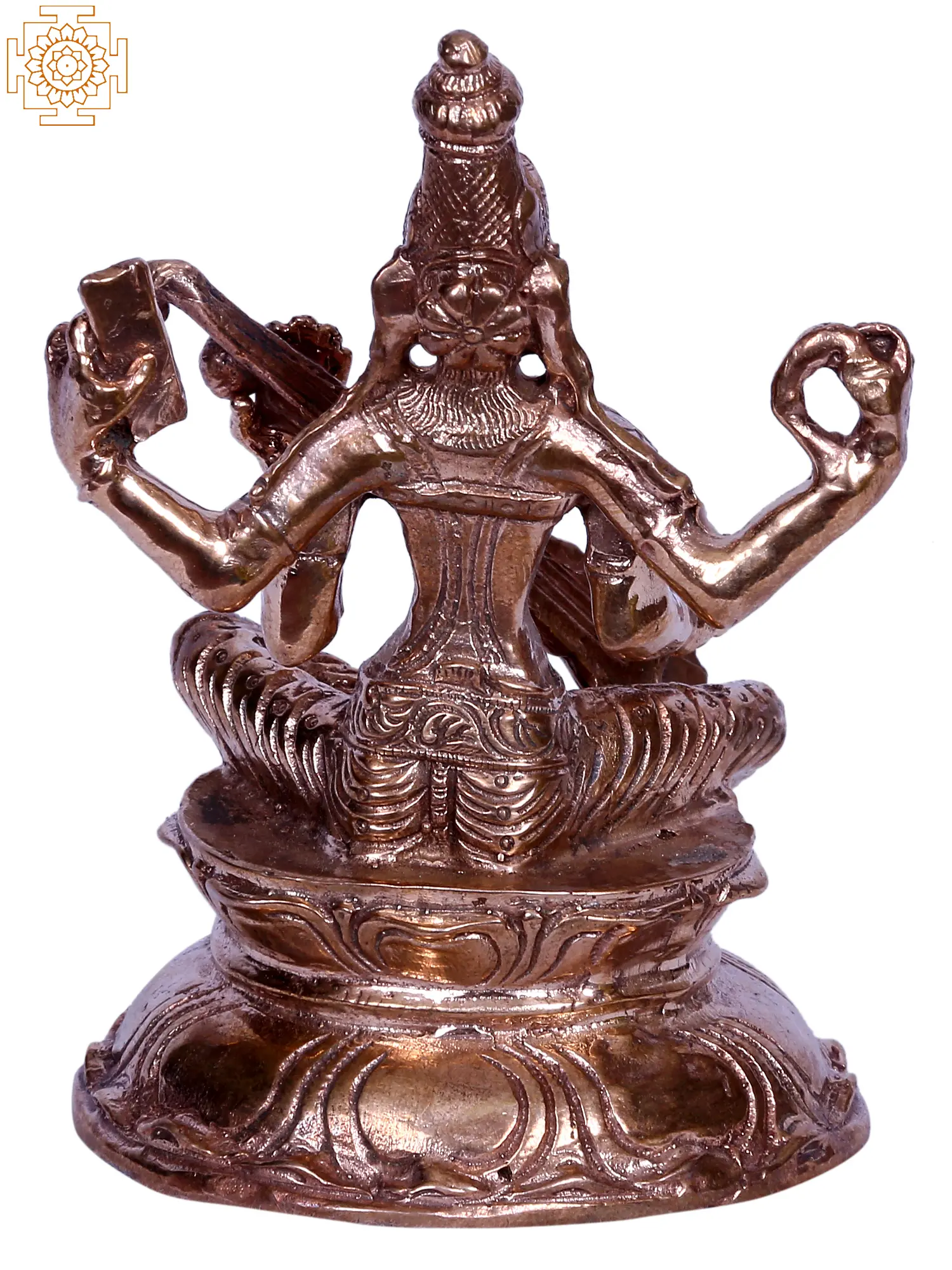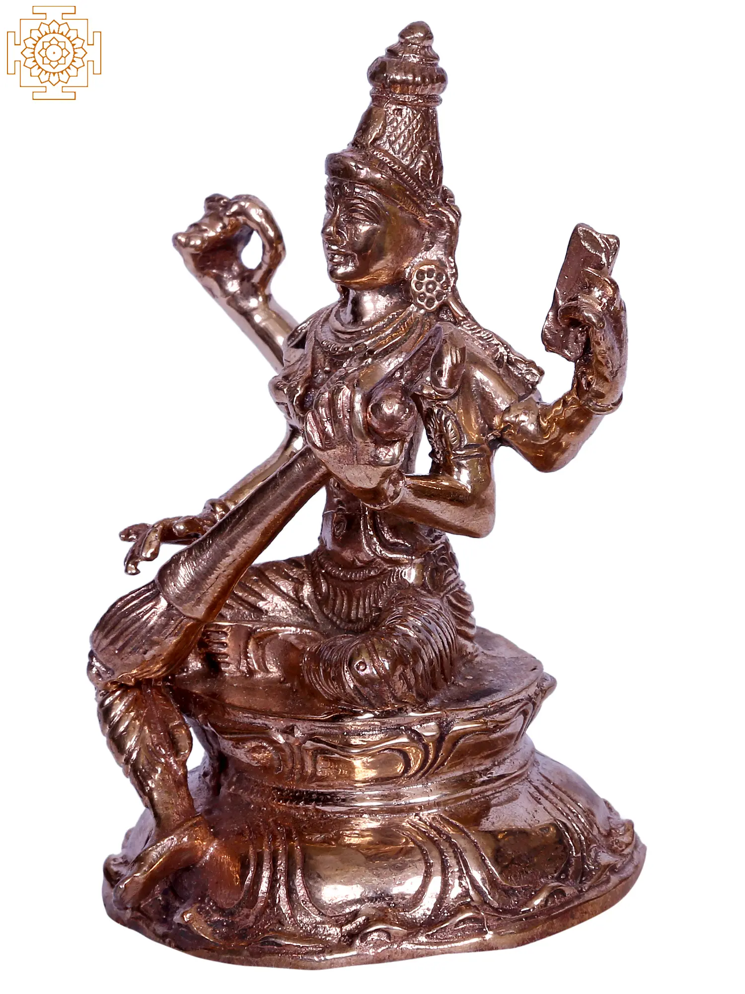Veenavadini (she who plays the Veena, a musical instrument) goddess Saraswati appears in this bronze statue in a four-armed roopa, enthroned on an inverted lotus seat, sitting in the regal Lalitasana pose, with her foot dangling as the ultimate refuge to all those who seek her creative energies. An elongated crown, fine ornaments, and dhoti are worn by Devi Saraswati, who animates this small statue with her divine smiling visage.