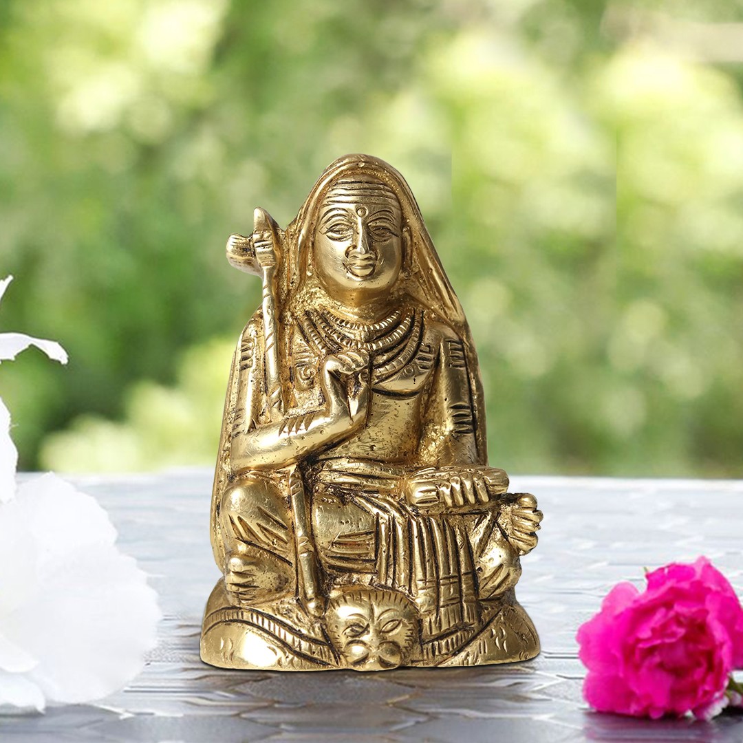 This exquisite brass idol depicts Adi Shankaracharya, the revered 8th-century philosopher and theologian who established Advaita Vedanta, a school of Hindu philosophy emphasising the oneness of Brahman (ultimate reality) and Atman (individual soul). It's a beautiful addition to your puja room or a source of inspiration for anyone seeking spiritual knowledge and enlightenment.