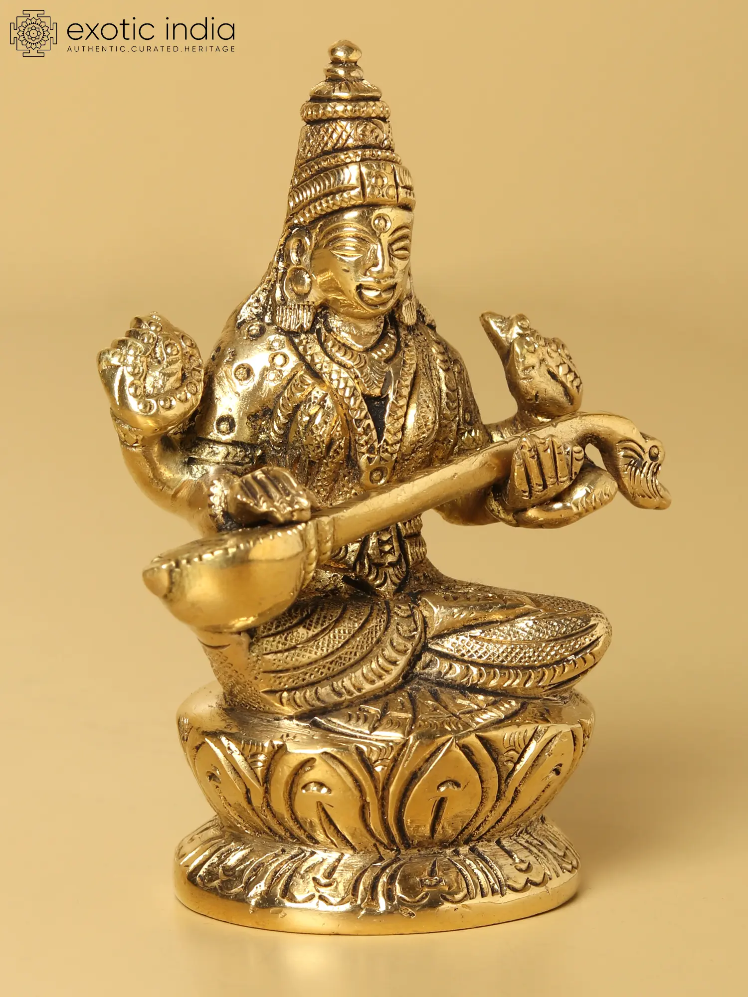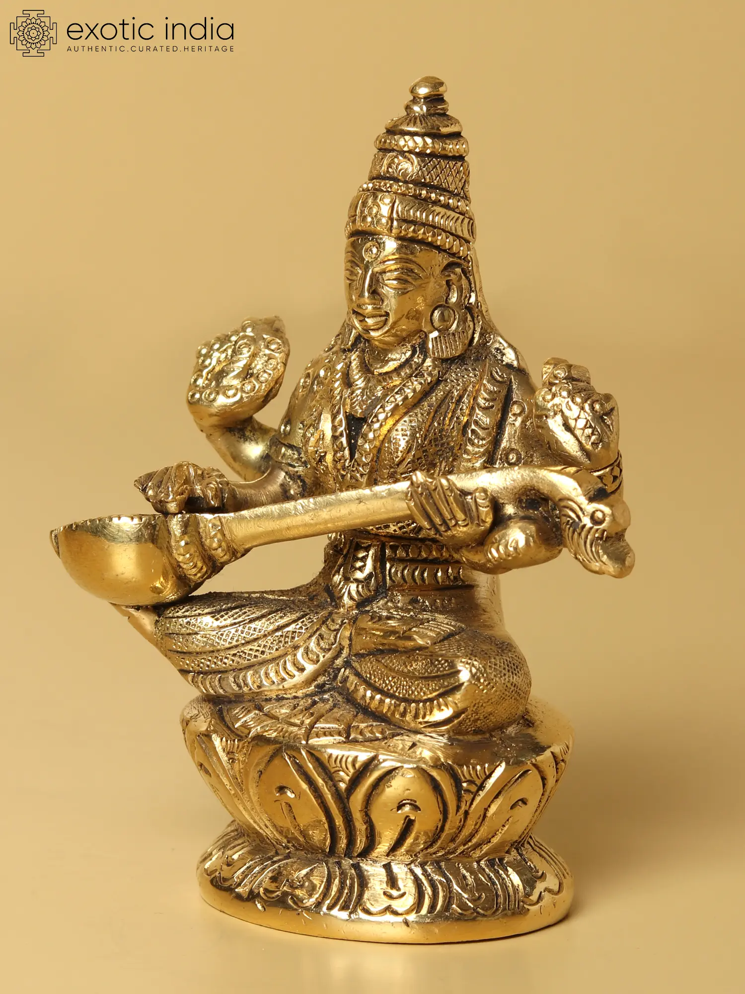 This Small Brass Goddess Saraswati Seated on Lotus Pedestal encapsulates the essence of divine wisdom, creativity, and learning. Saraswati, the Hindu goddess of knowledge and the arts, is depicted seated gracefully on a lotus pedestal, symbolizing purity and spiritual enlightenment. Crafted with precision in brass, this statue radiates serenity and grace, inviting devotees to immerse themselves in the pursuit of wisdom and creativity.