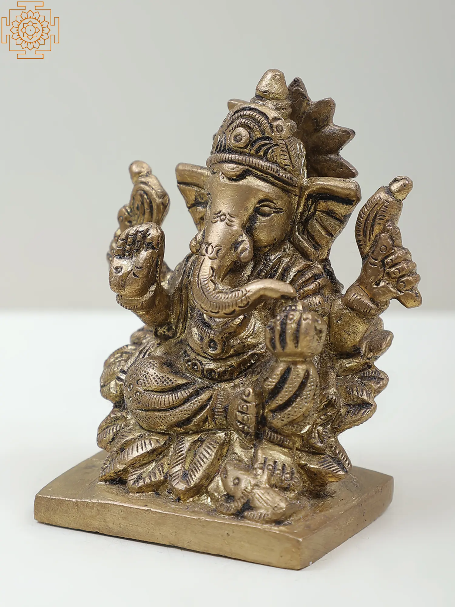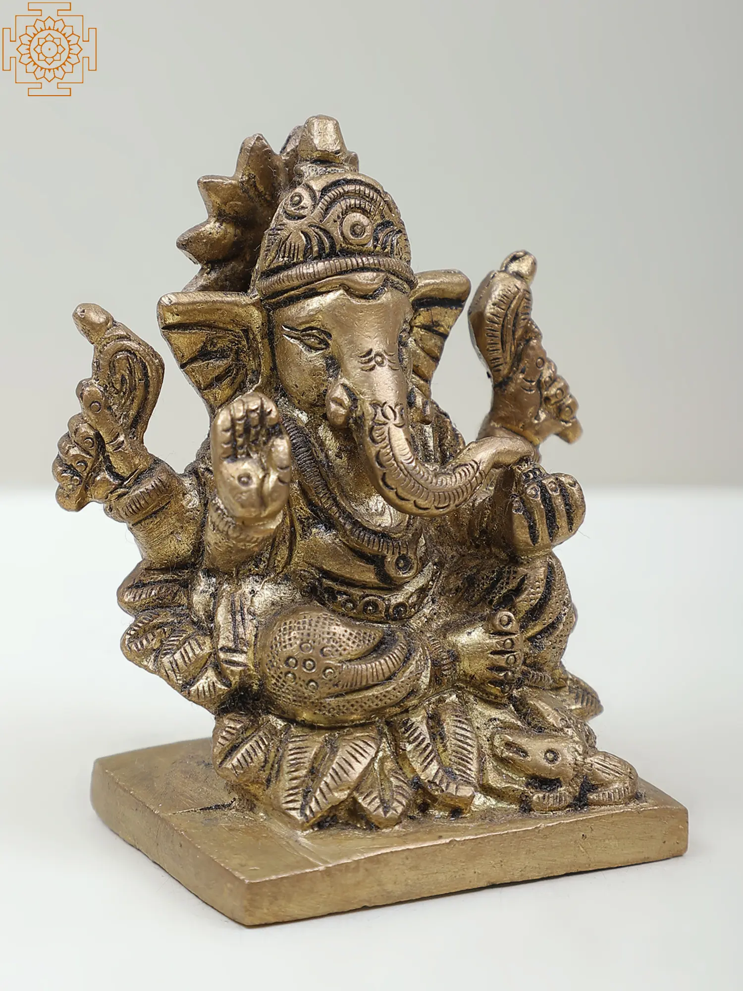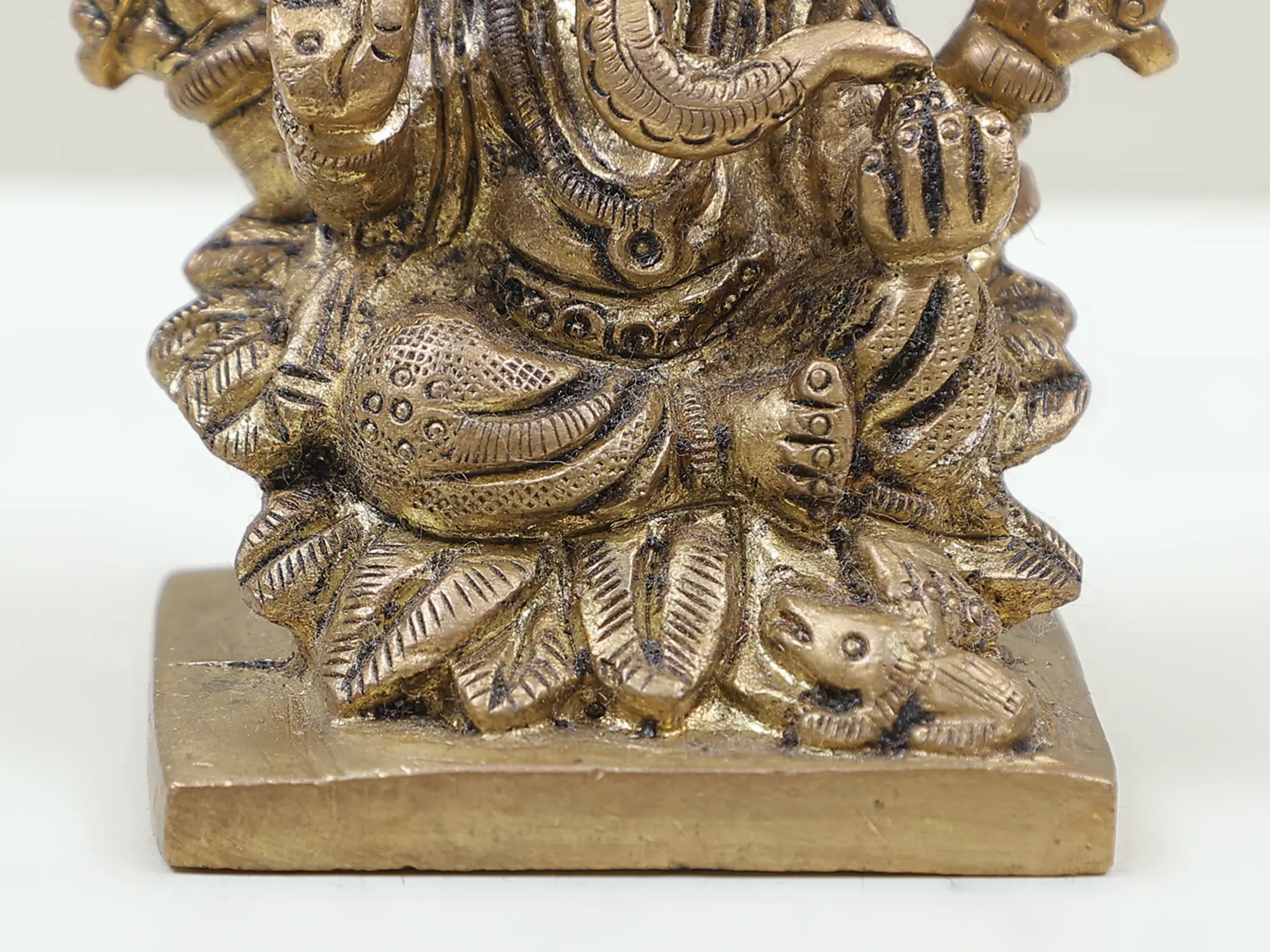 As a beacon of strength and wisdom; Lord Ganesha in his primary right hand holds the ankusha, a symbolic tool used to guide and control one's inner desires, while the left hand gently holds the pasa, representing the power to overcome obstacles and negative influences. In his lower right hand, Lord Ganesha gracefully holds the modaka, a sweet delicacy that symbolizes the rewards of spiritual enlightenment and intellectual prowess. The left hand is raised in the abhaya mudra, in fearlessness and protection. Seated upon a blooming lotus, a sacred symbol of purity and enlightenment, he radiates tranquility and grace embodied in premium brass.