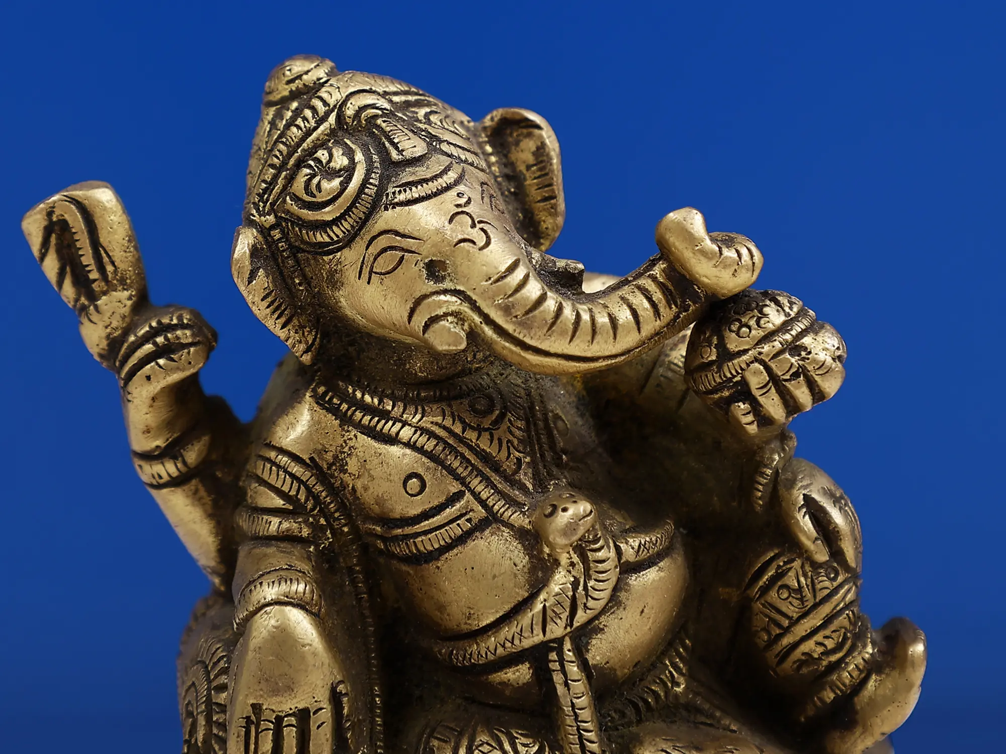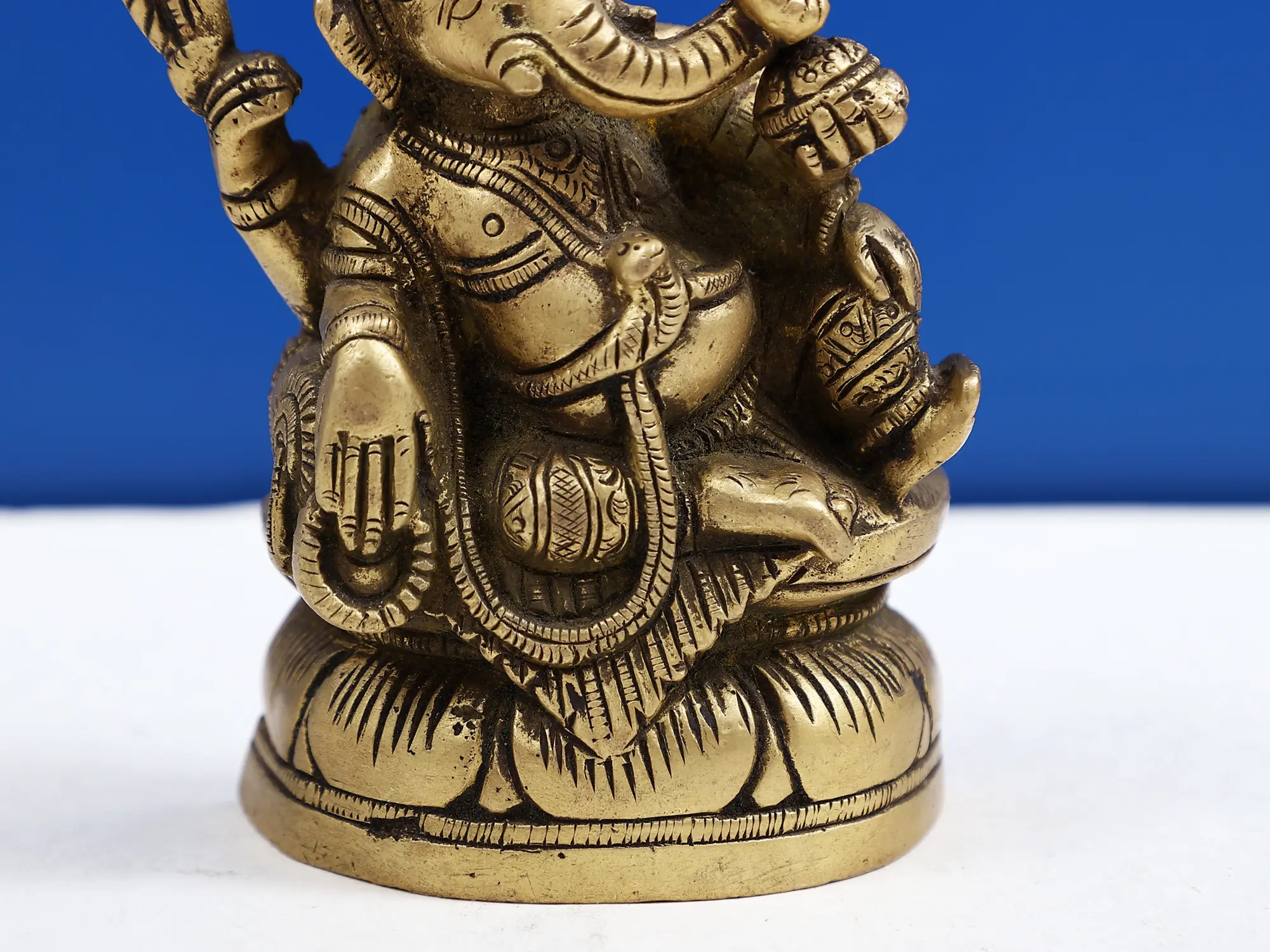Small Superfine Four-Armed Lord Ganesha Brass Statue Seated on Lotus